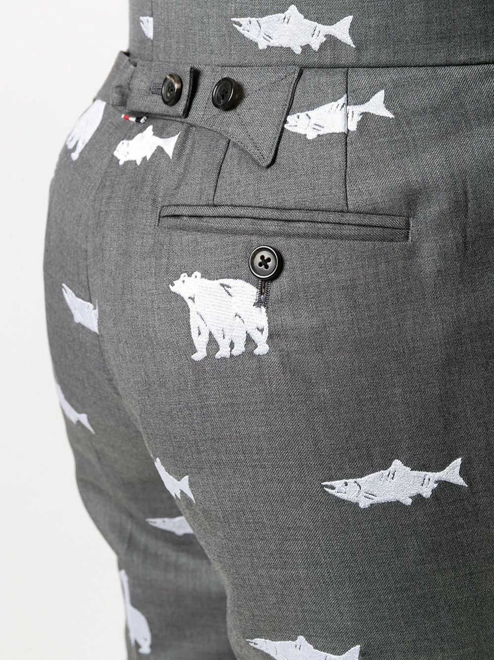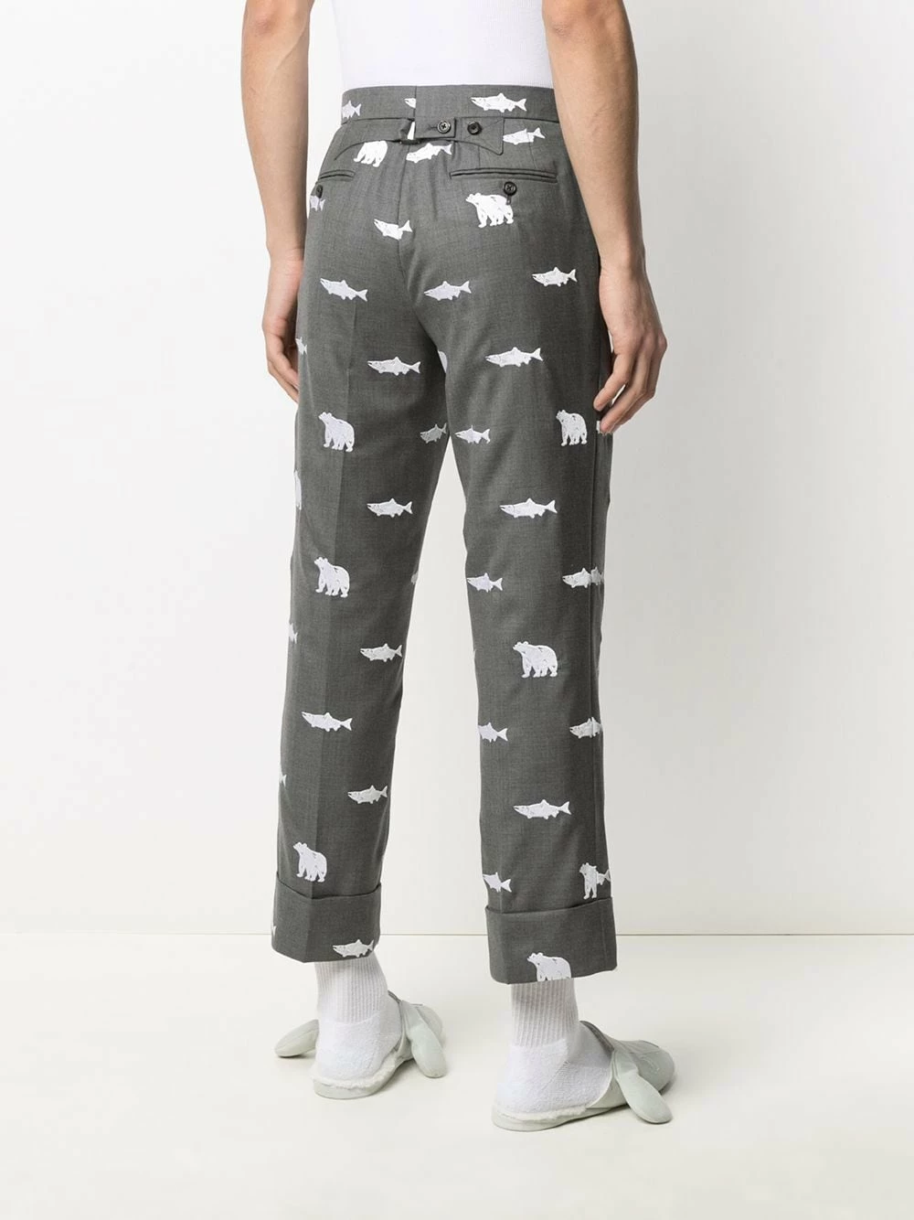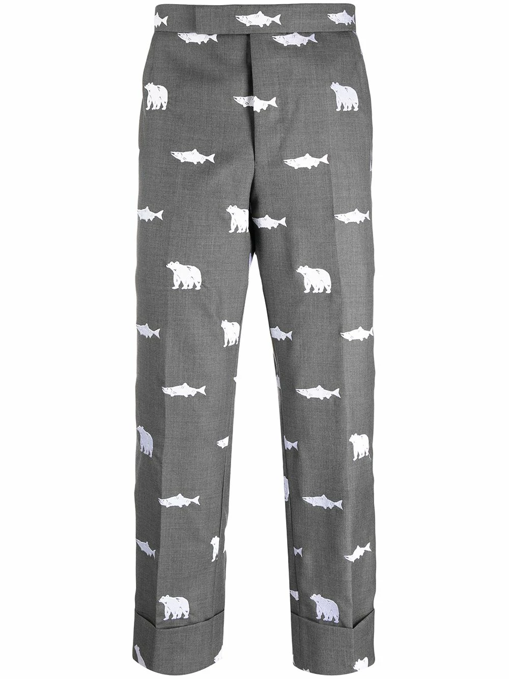 Add some whimsy to your workwear. In an all-over animal print and medium grey hue, these tailored trousers from Thom Browne are overflowing with eccentric energy. Have some fun, with Thom Browne.