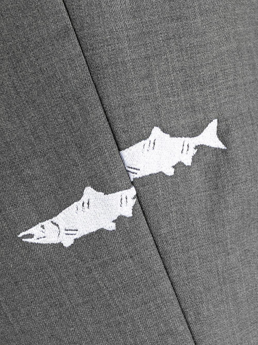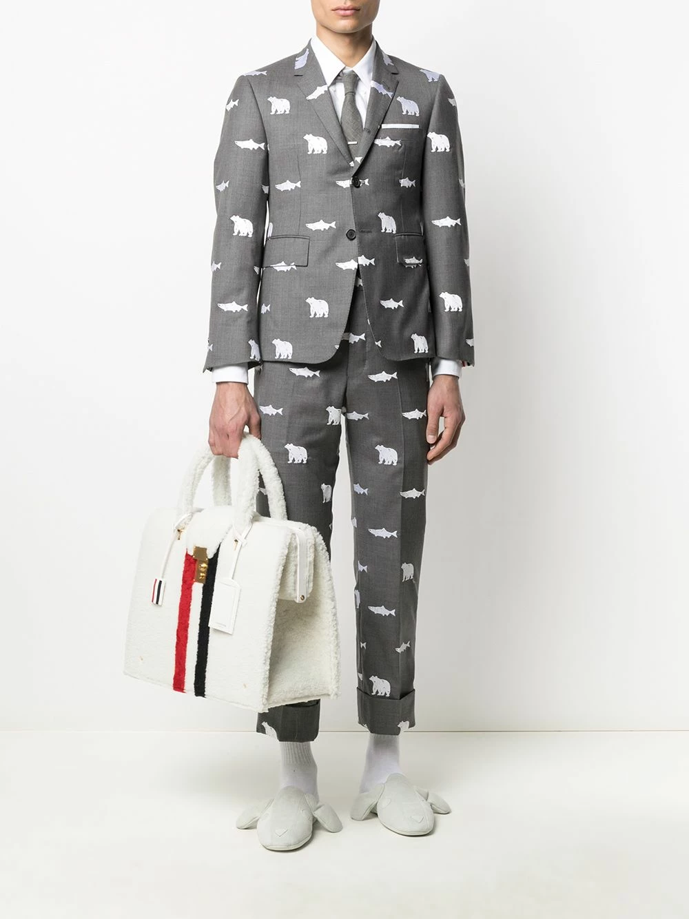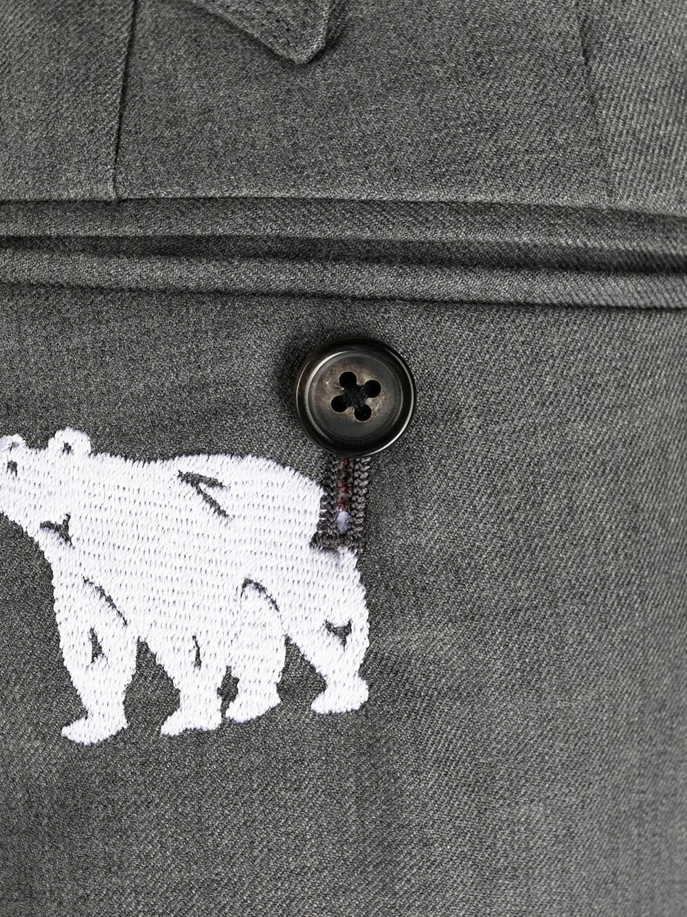 Add some whimsy to your workwear. In an all-over animal print and medium grey hue, these tailored trousers from Thom Browne are overflowing with eccentric energy. Have some fun, with Thom Browne.