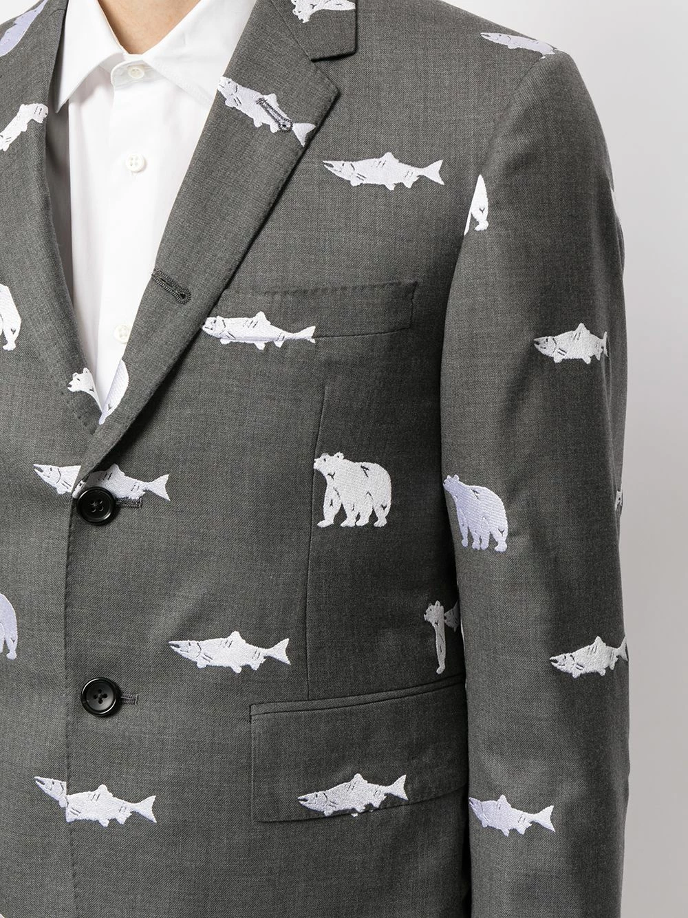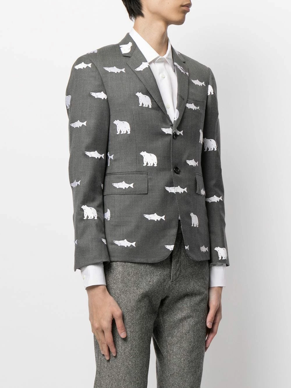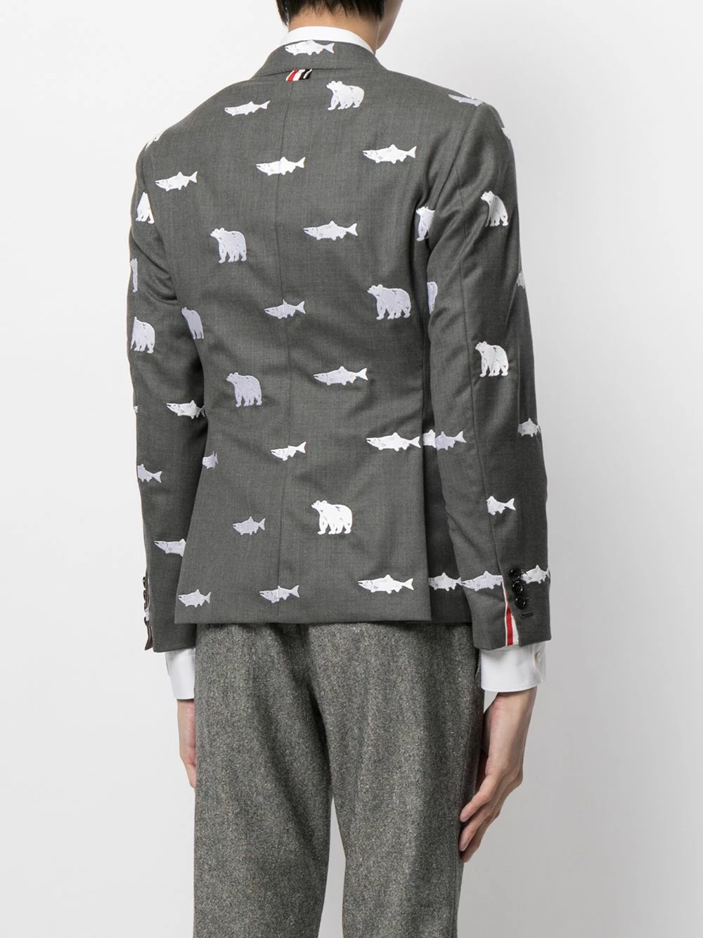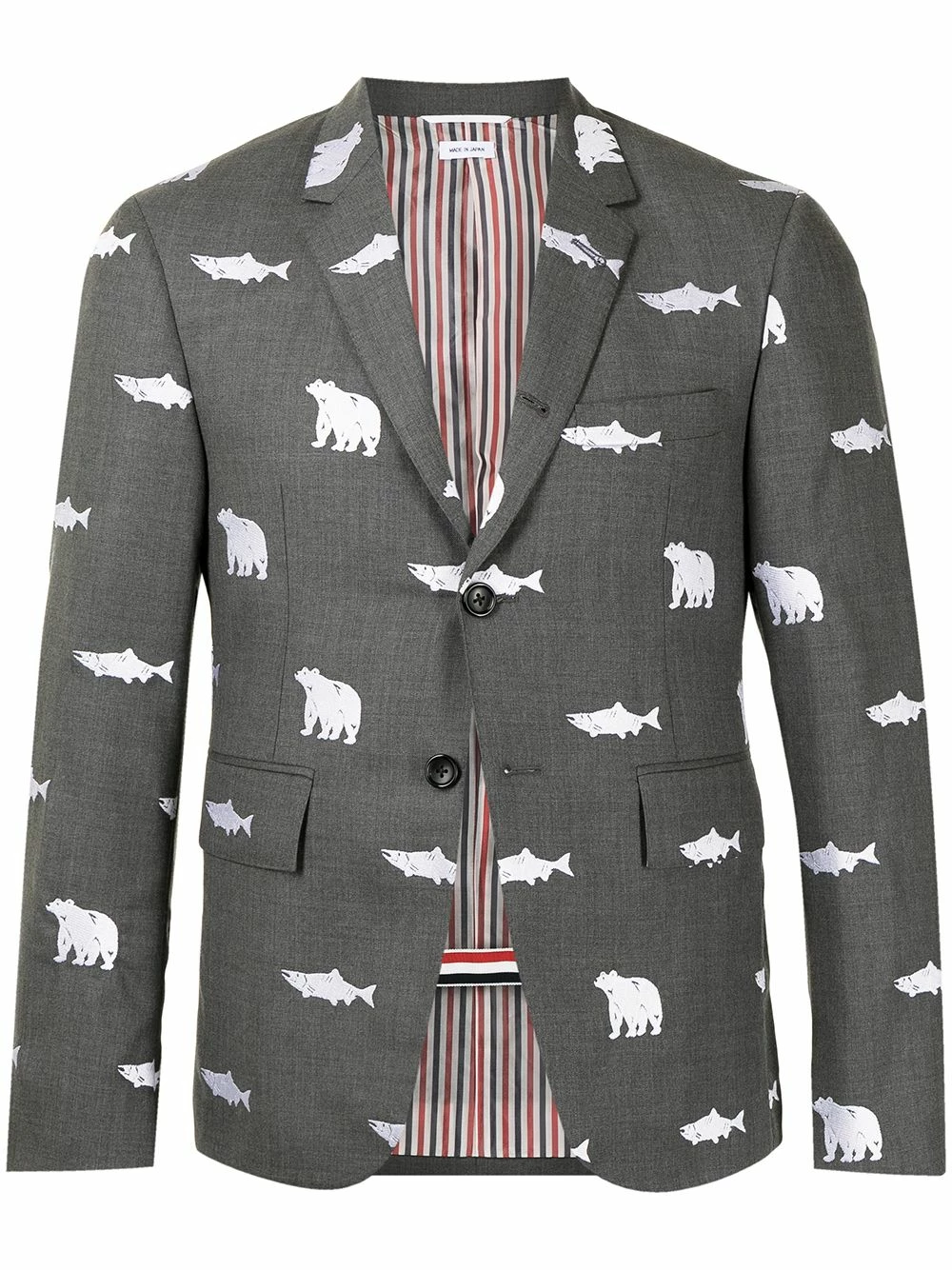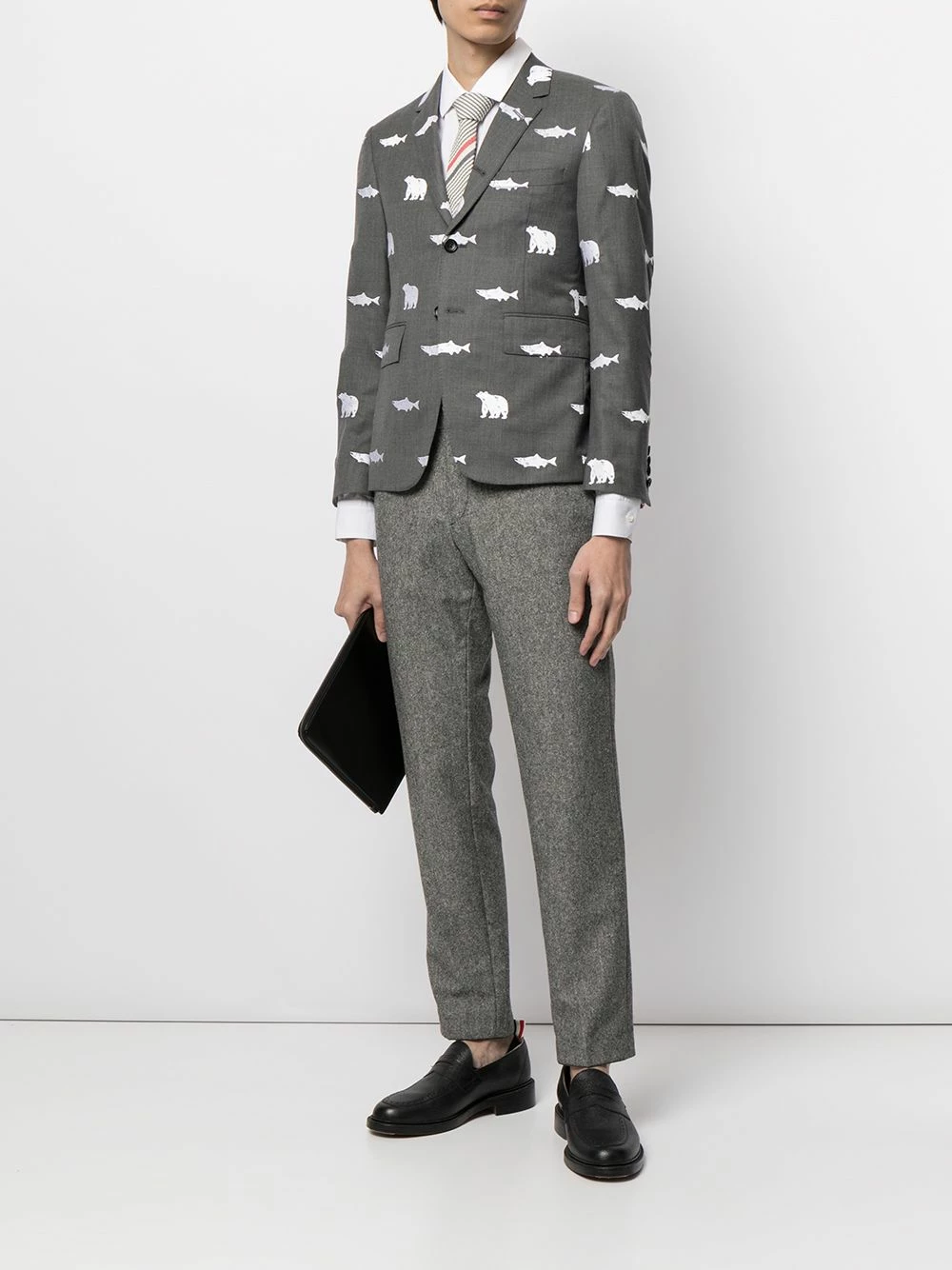 Thom Browne decorates this single-breasted blazer with a silhouetted animal print. Crafted from grey wool, the tailored piece is also detailed with the brand’s signature RWB grosgrain loop tab at the nape of the neck