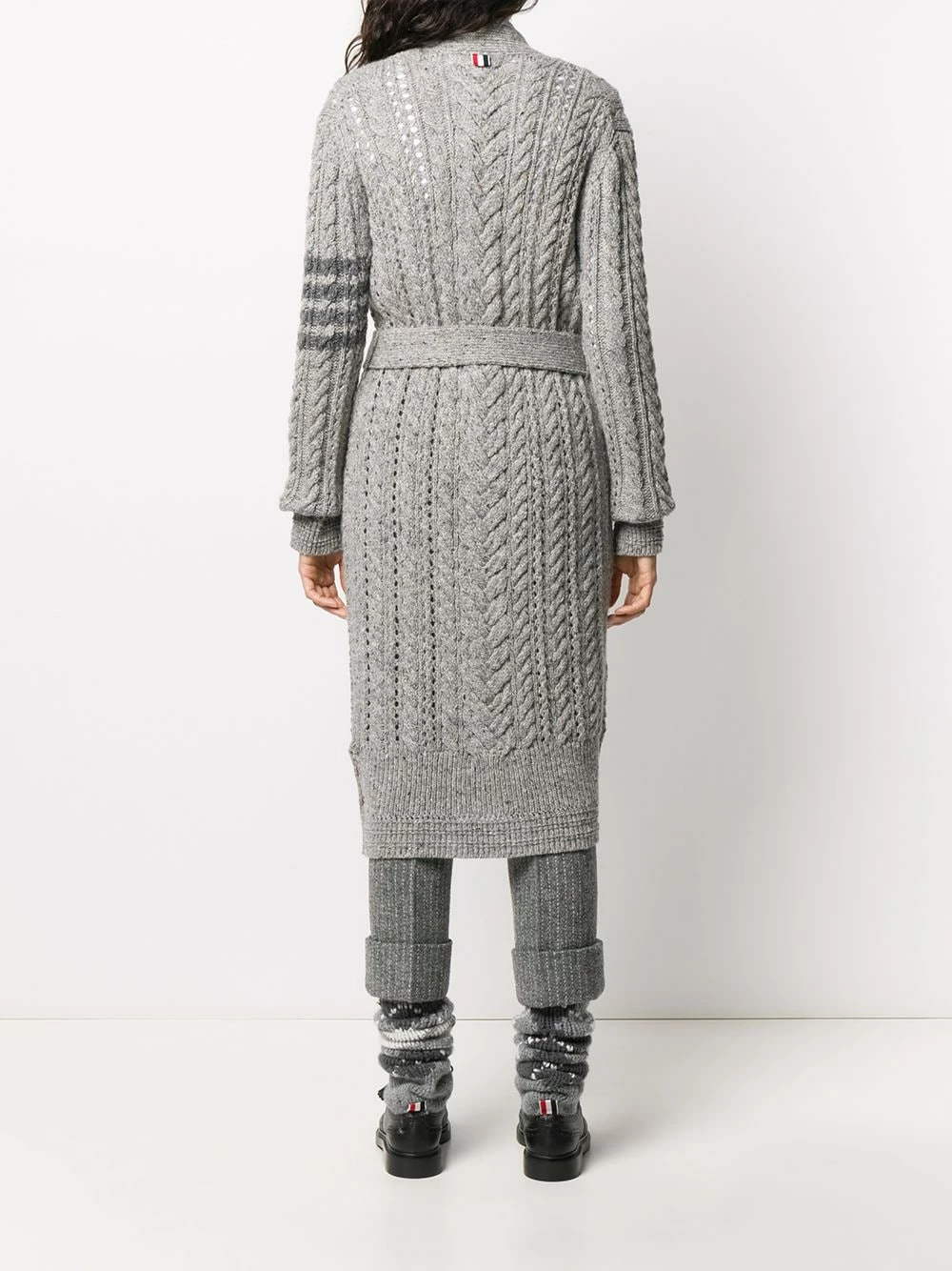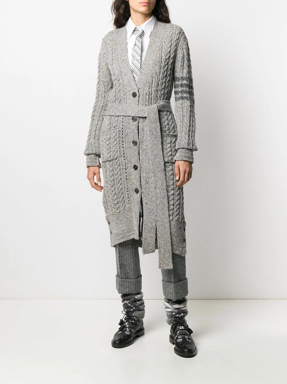 Searching for the ultimate proof that you can look great, whilst feeling as cosy as can be? You’ve just found it. And it comes in the form of this aran cable-knit cardi-coat from Thom Browne. Featuring a v-neck, a cable knit, long sleeves, a front button fastening, a belted waist, patch pockets, a mid-length, a RWB tab, a 4-Bar stripe, buttons to the hem and RWB details.