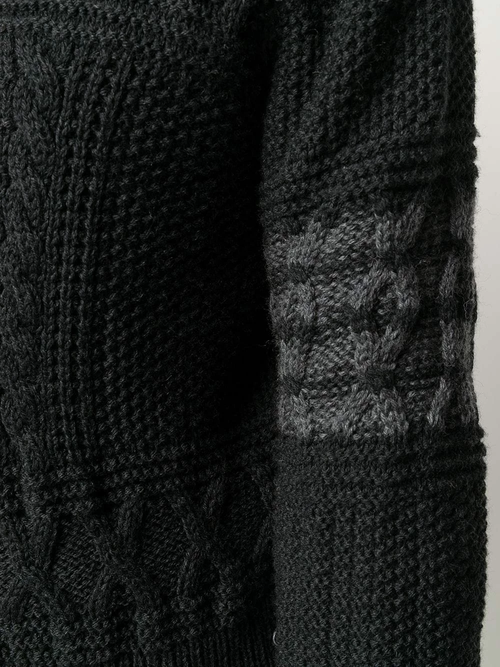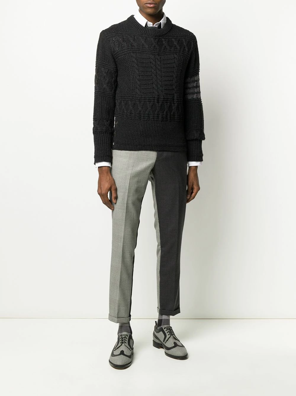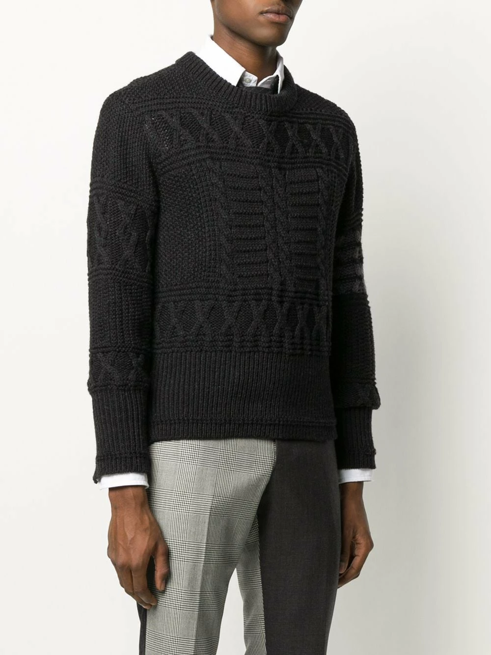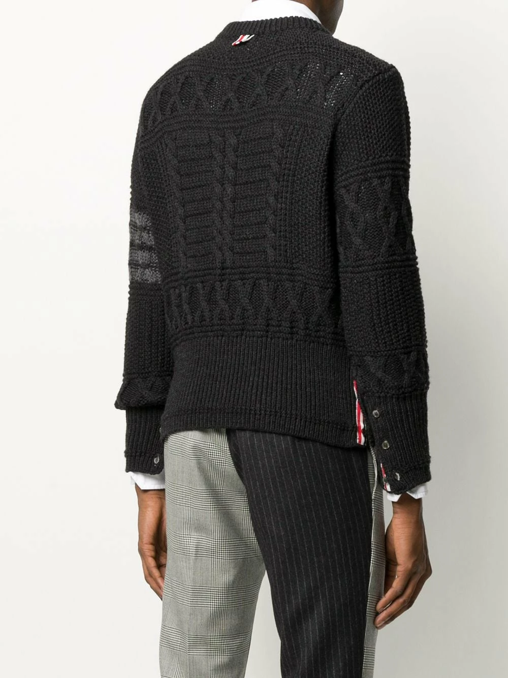 Thom Browne transforms classic silhouettes by adding signature detailing that gives the brand that avant-garde edge. Case in point: this dark grey merino wool Aran cable knit jumper. Boasting a traditional Aran knit and 4-Bar detailing to the sleeve, this jumper is instantly recognisable. Featuring a ribbed crew neck, an aran knit, a cable knit, long sleeves, a ribbed hem and cuffs, button cuffs, a side button fastening, a signature three stripe detail and signature 4-Bar detailing to the sleeve.
