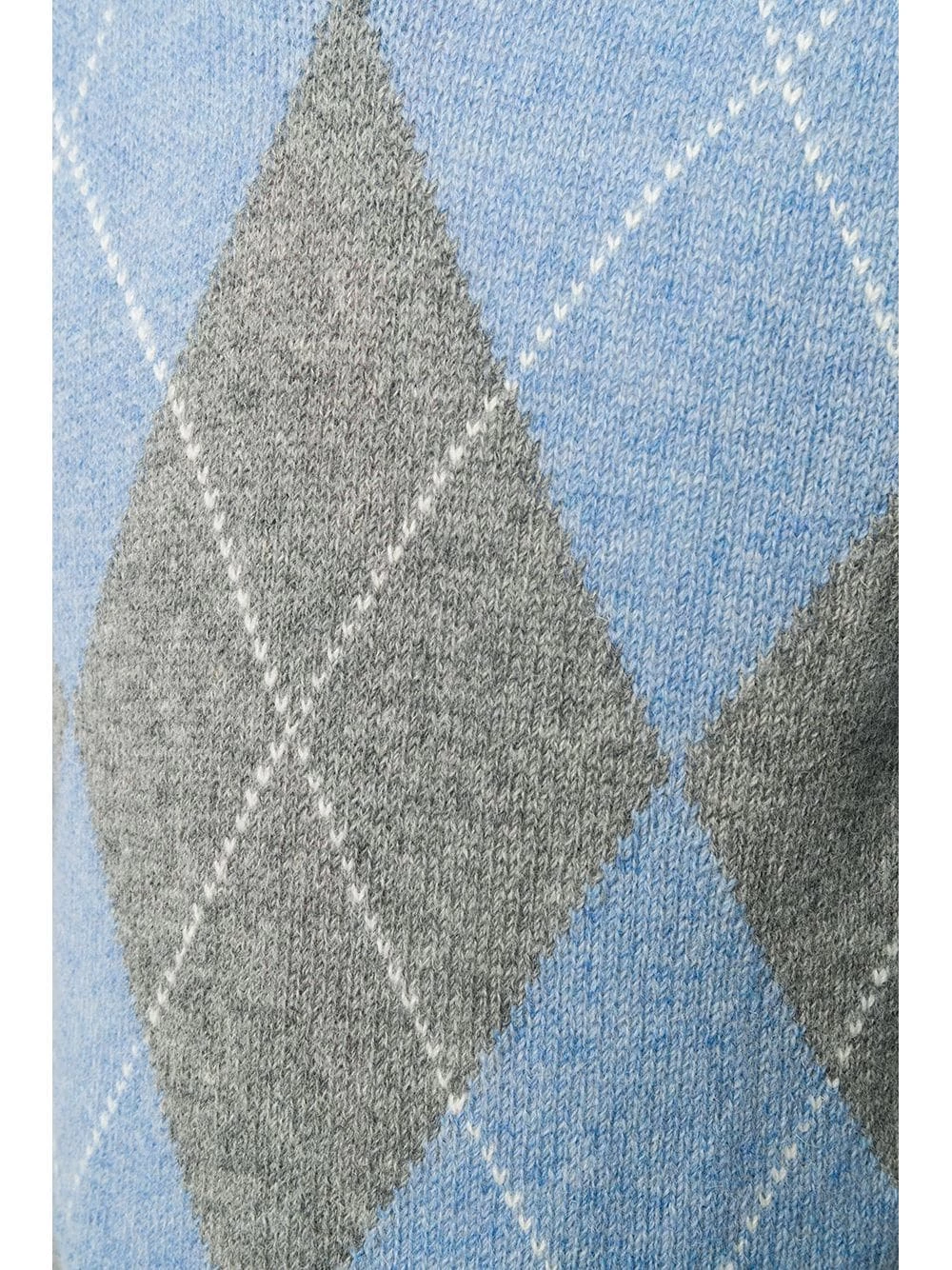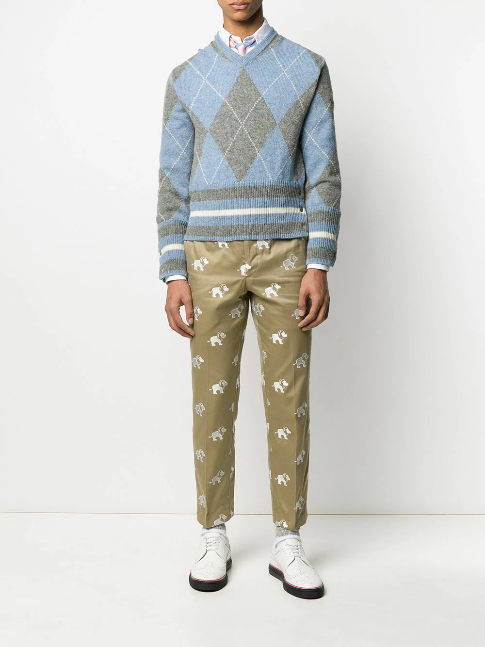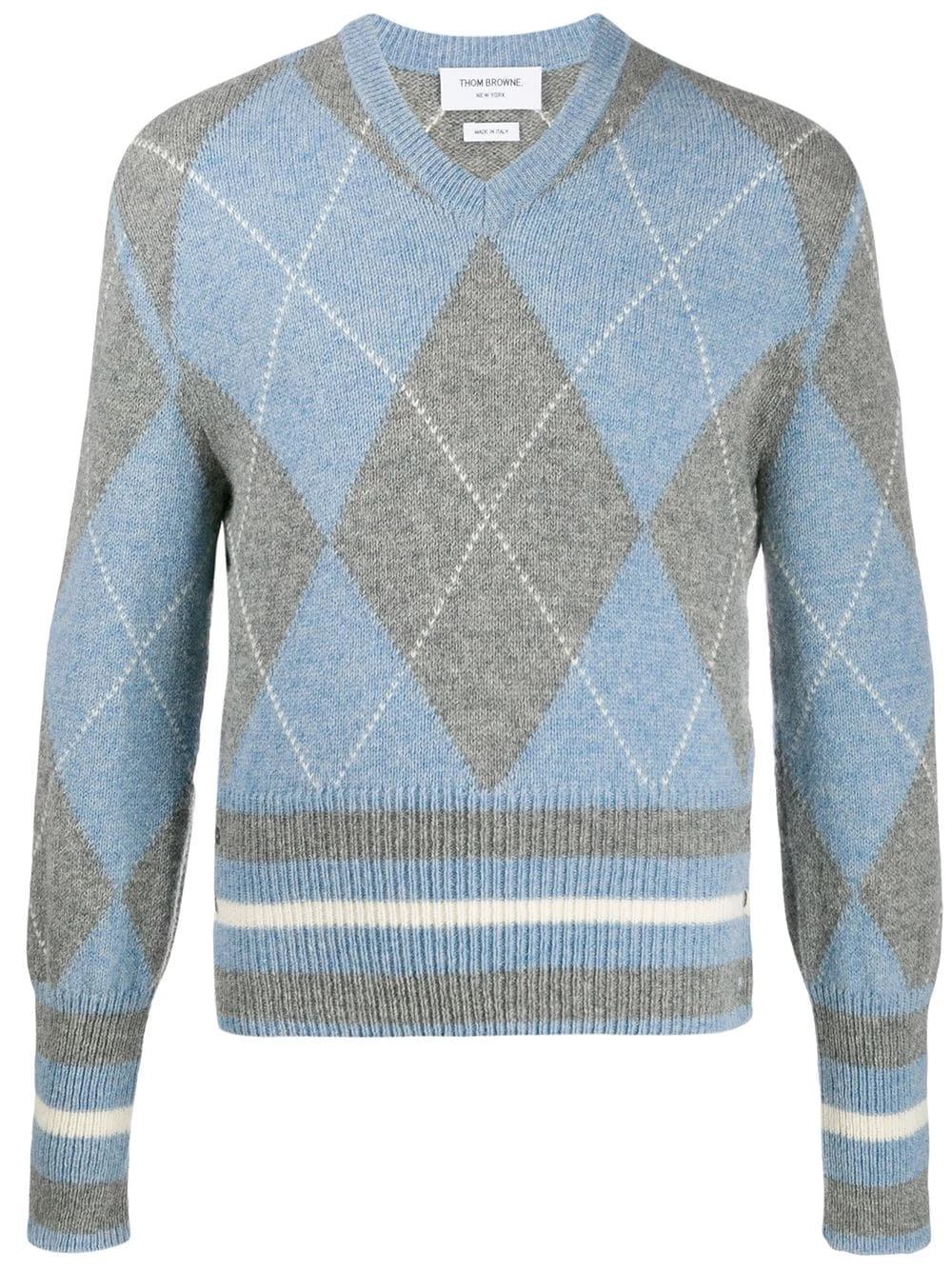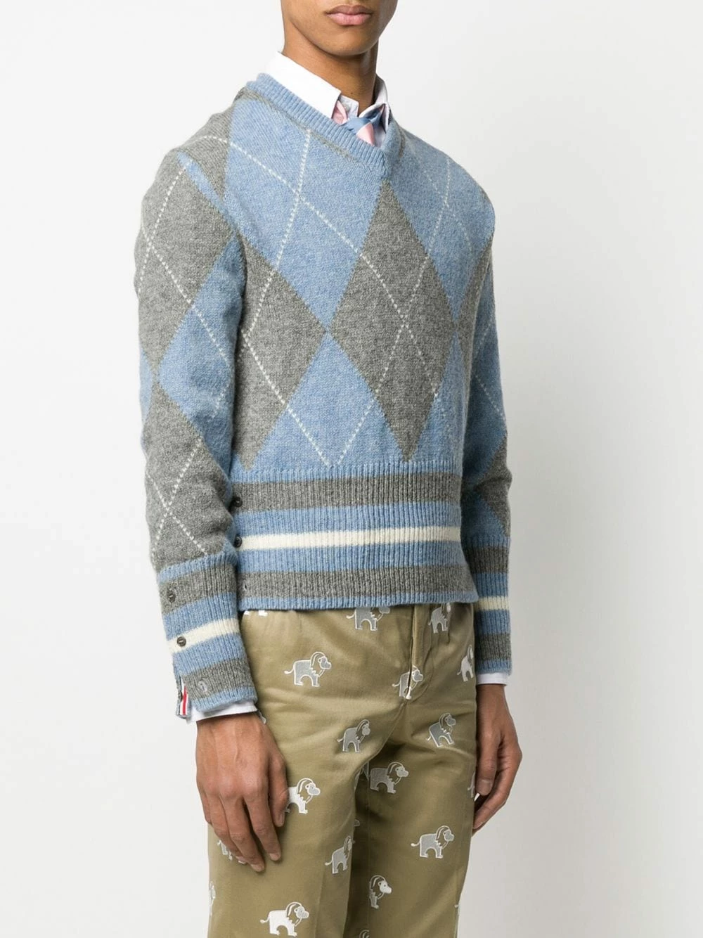 Don’t let the cold get you down. Woven from wool, this blue, grey and white argyle ribbed V-neck jumper from Thom Browne will keep you equal parts warm and cool. Winter might be coming but it has got nothing on you. Featuring a ribbed v-neck, long sleeves, an argyle knit, horizontal stripes, a ribbed hem and cuffs, a short length, a straight hem, button cuffs and a signature three stripe detail.