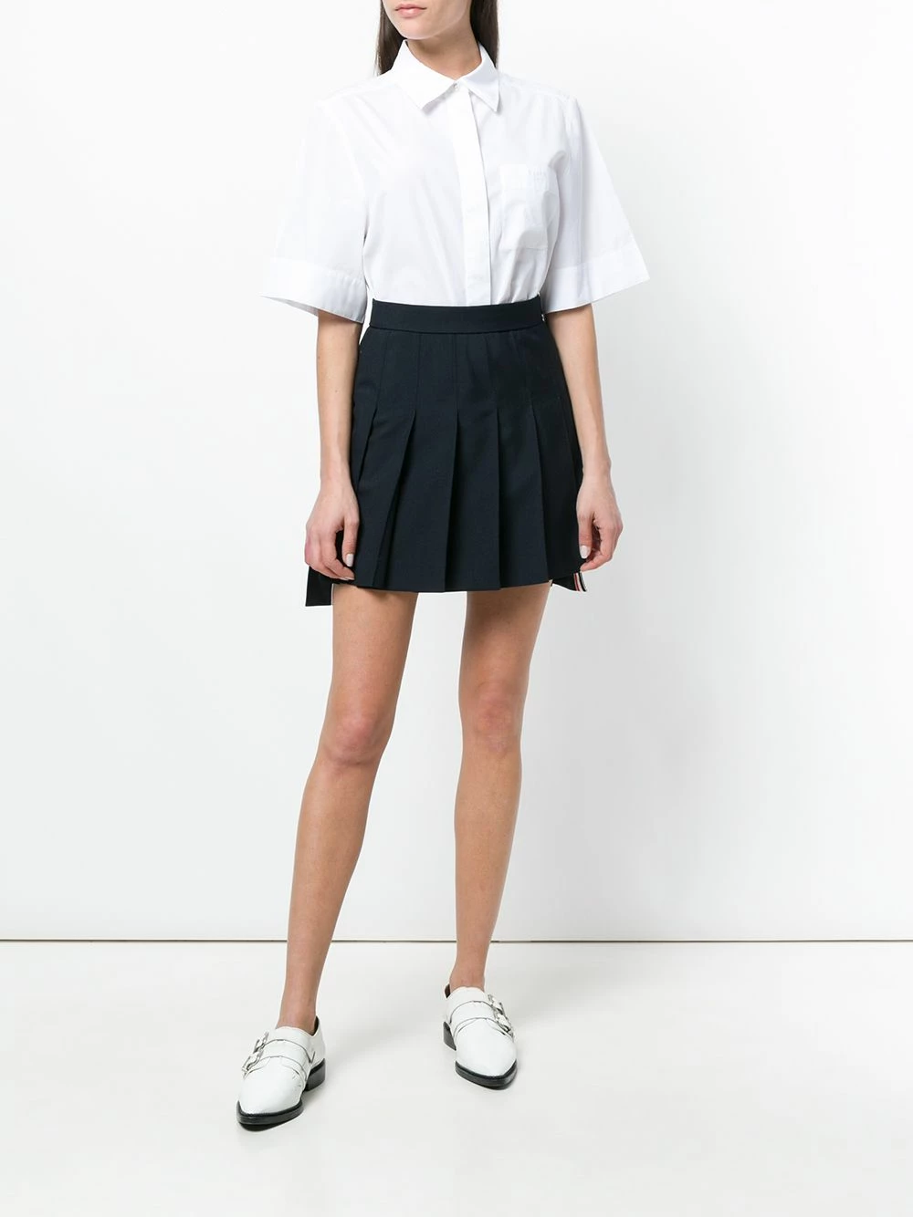 Exuding the brand’s collegiate influences, Thom Browne’s skirt is cut to a school uniform-style silhouette. Fully pleated, this navy-blue wook piece also showcases the house’s ability to transform classic profiles – note the high-low hem.