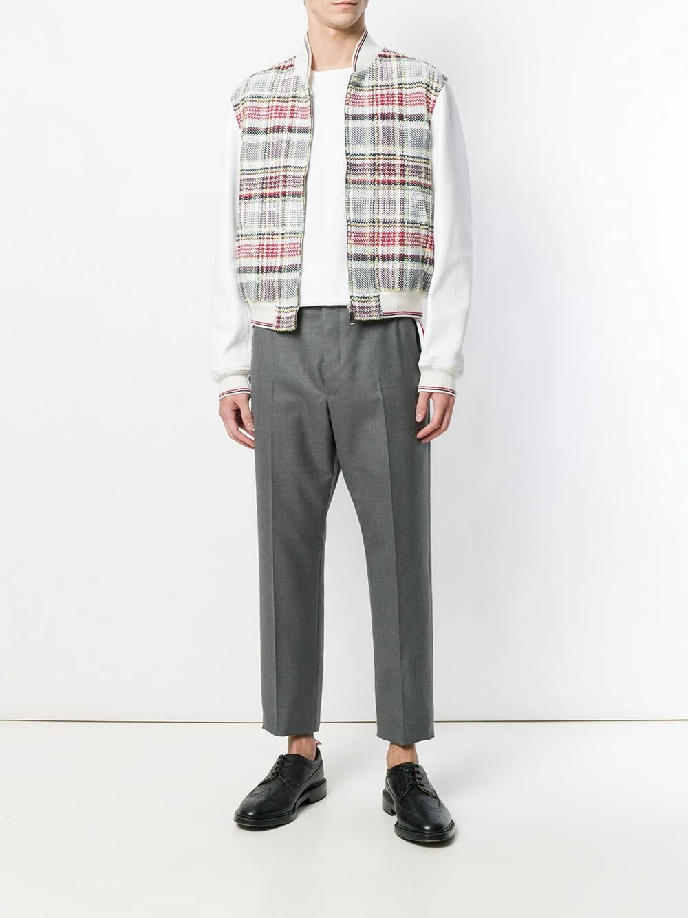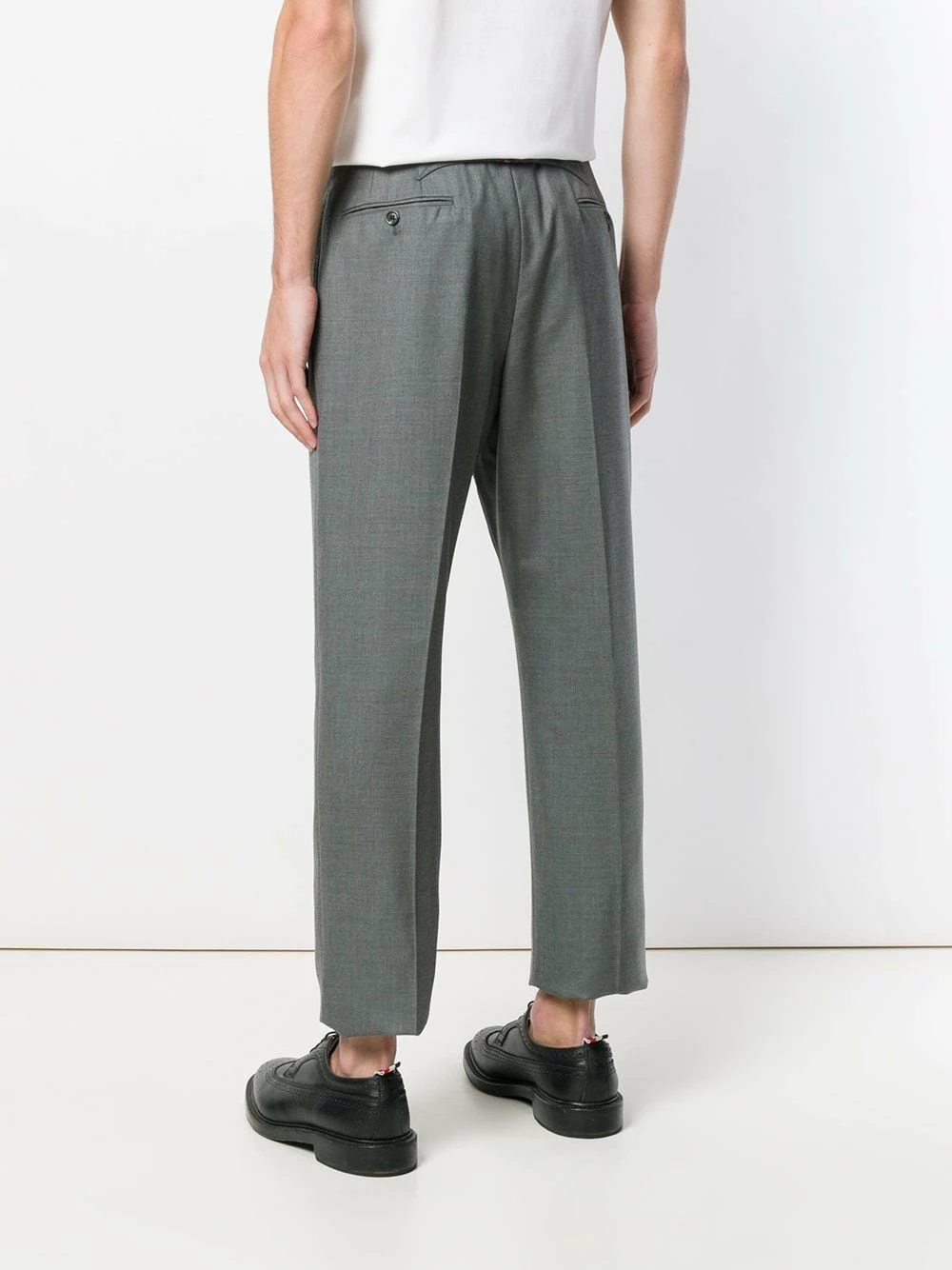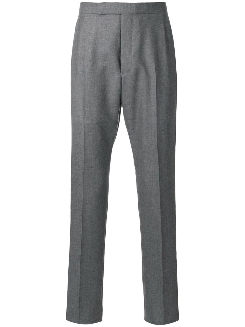 Acclaimed for his subtly deconstructed tailoring, Browne incorporates traditional craftsmanship techniques to modern transformations in men’s formalwear. This model of tailored trousers are a classic in Thom Browne’s collections. The backstrap piece presents an adjustable buttoned strap to the back of the waist height, concealing the unforgettable grosgrain tab. These medium grey wool trousers also feature a mid rise waistband, side slit pockets, two back buttoned welt pockets, a cropped length to a straight hem, a straight leg and a concealed button.