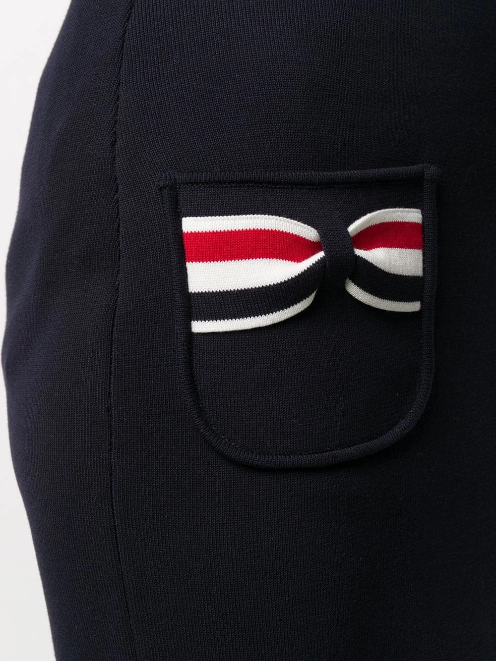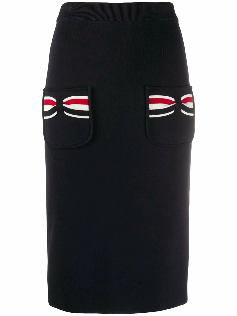 What a perfect fit. This navy double-face cotton bow pockets pencil skirt from Thom Browne features a fitted silhouette, pencil design, bow detailing and signature three-stripe logo. You’ll thank us later.