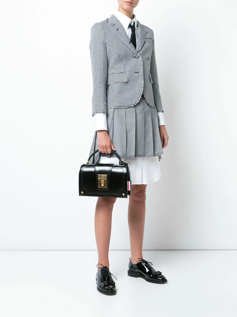 Stripe up your life. Thom Browne know what you want from a bag, and they’re here to provide. Make this punch hole detail piece your new uniform. Featuring punch hole detailing, a foldover top, a round top handle, a printed lining, an internal zipped pocket, a 4-Bar tag and a 4-Bar tab.