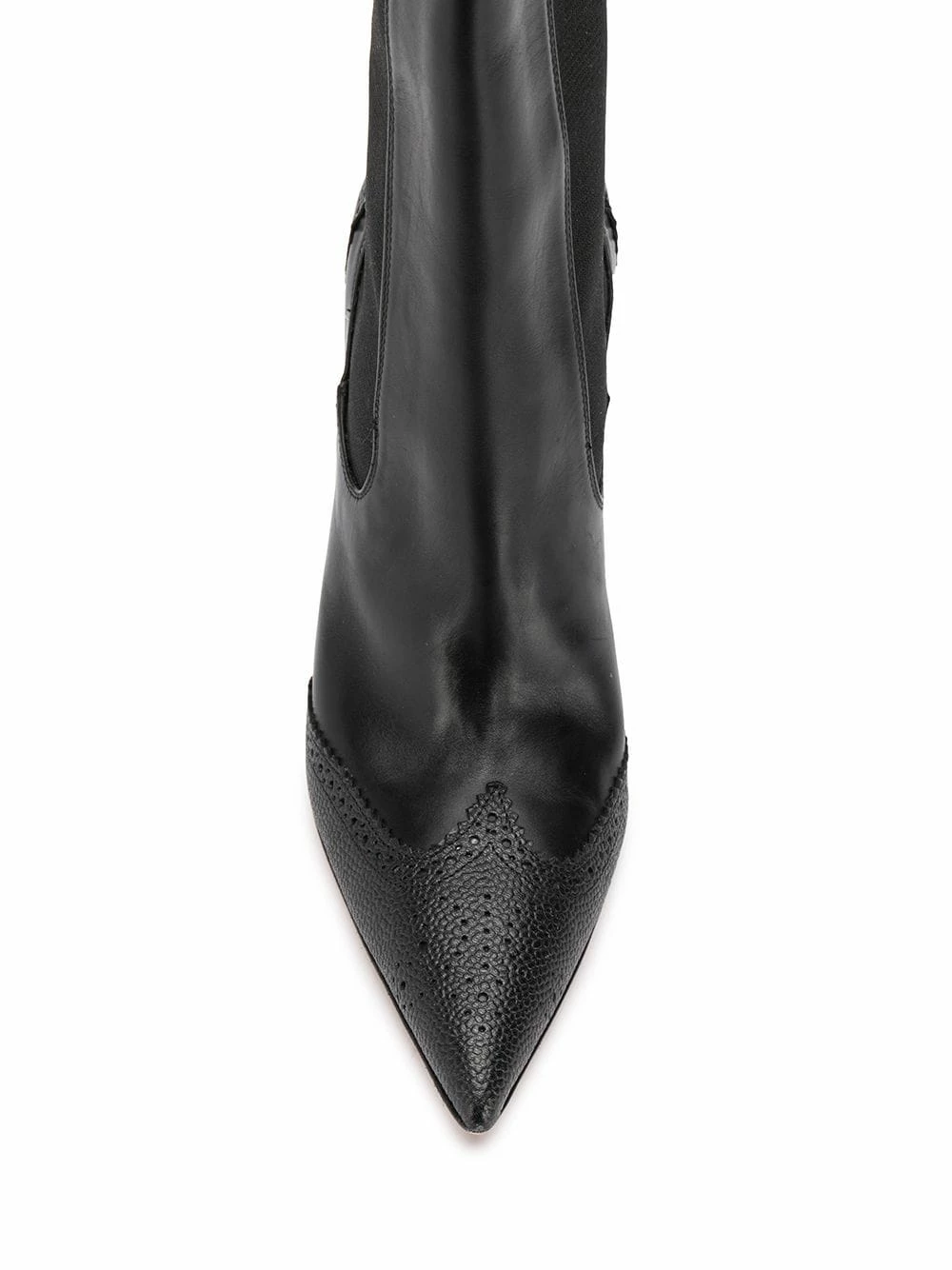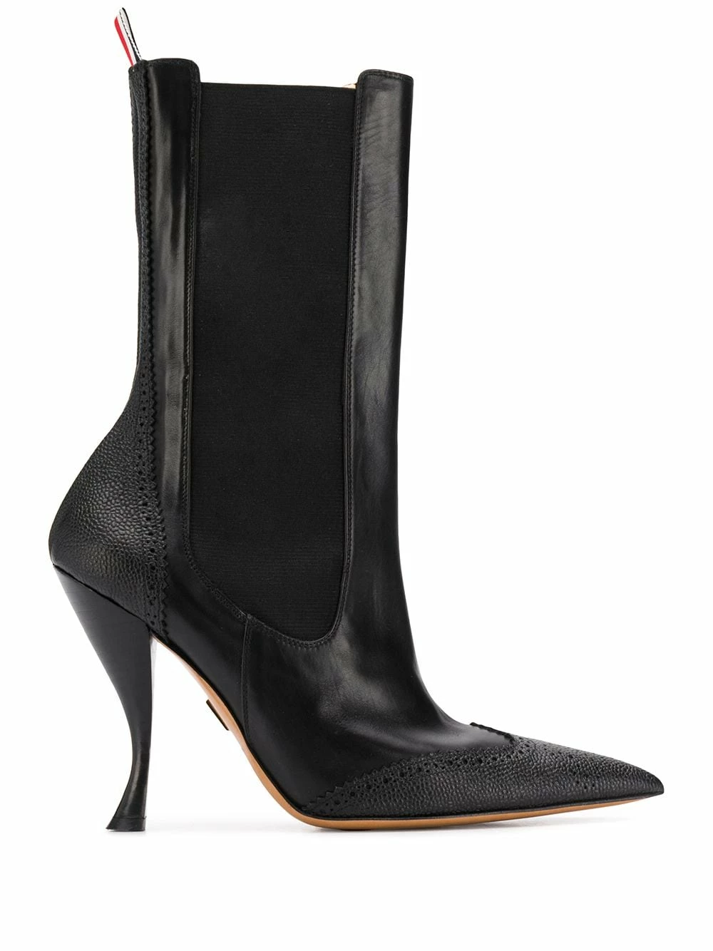 Next time someone asks you for direction on the streets, just point them the right way with these black calf leather brogued wingtip Chelsea boots from Thom Browne. That way, you’ll be helping and showing your boots, all at the same time. Two birds one stone! Featuring a pointed toe, a pebbled leather texture, a mid-calf length, a grosgrain band, elasticated side panels and a mid high stiletto heel.