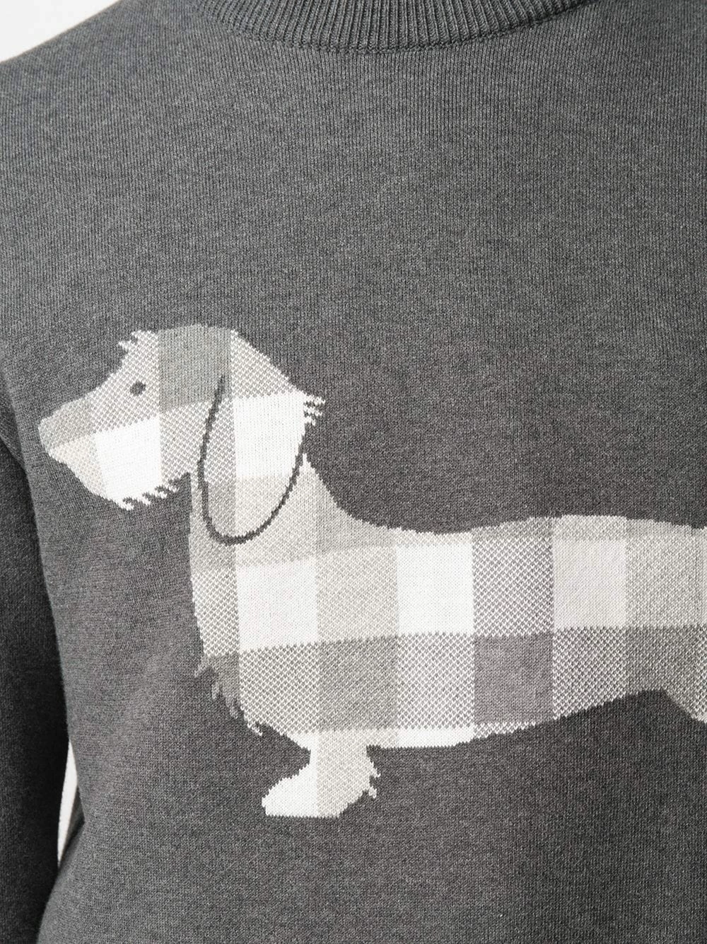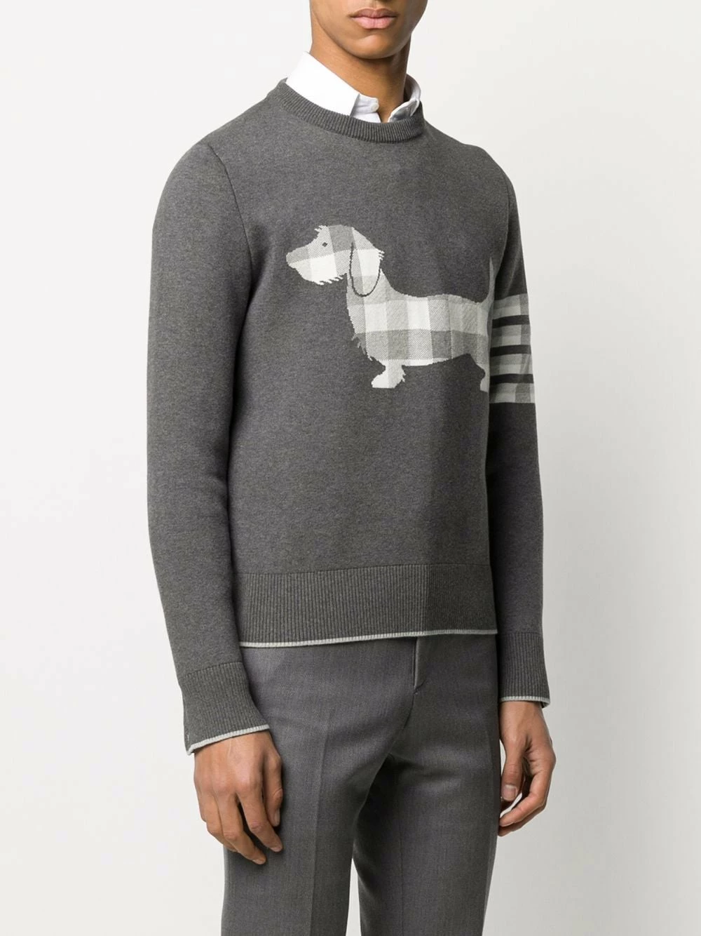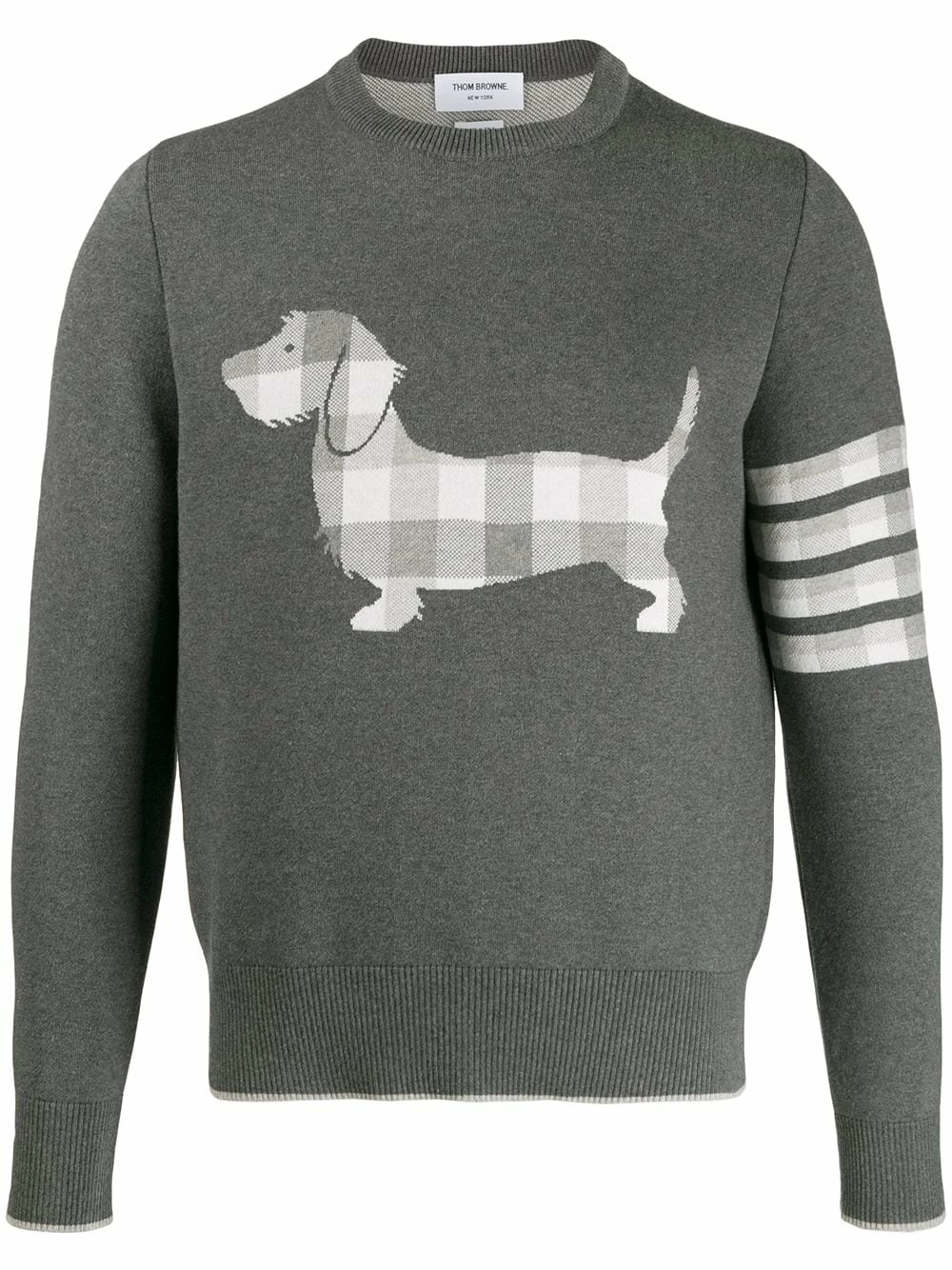 We can’t blame Thom Browne for being inspired by his miniature wire-haired dachshund, we’re dog people too. An adorable jacquard-knit motif of Hector the dog on the front is presented in a Buffalo checked pattern, which is echoed on the 4-bar stripes on the sleeve. Proving grey is anything but boring. Featuring a round neck, long sleeves, a jacquard effect, rib-knit trims, a Hector motif on the front and 4-bar stripes on the sleeve.