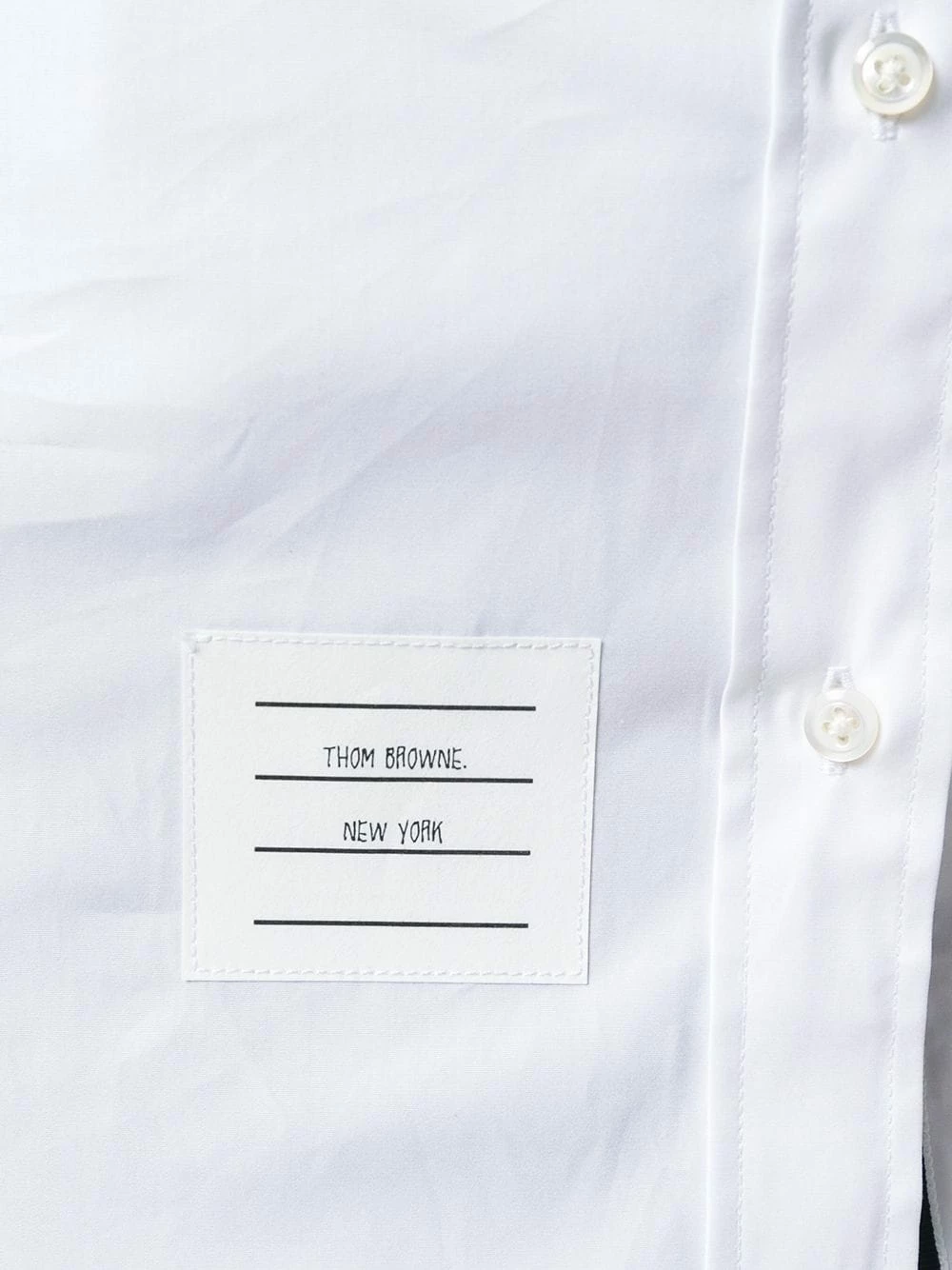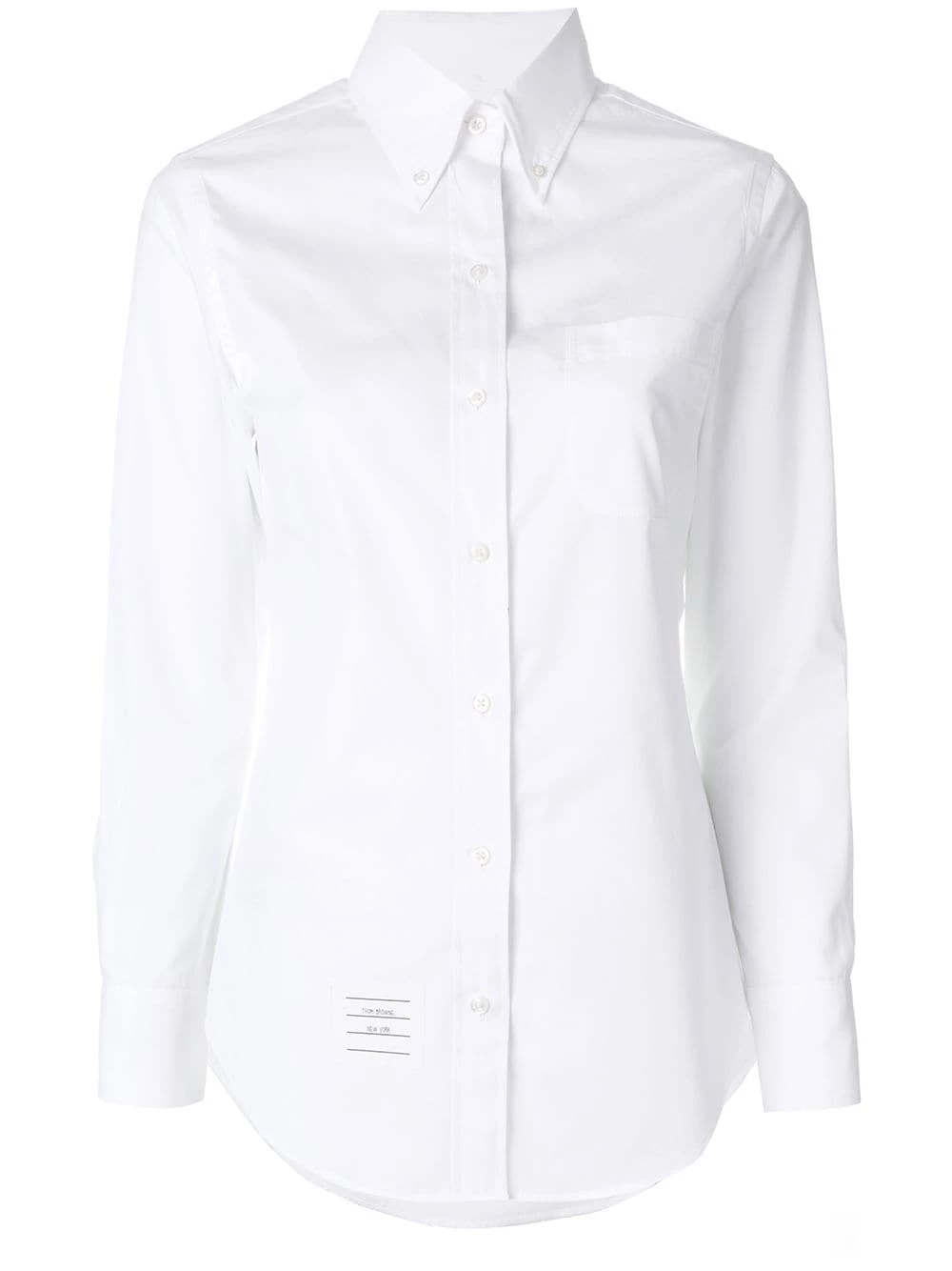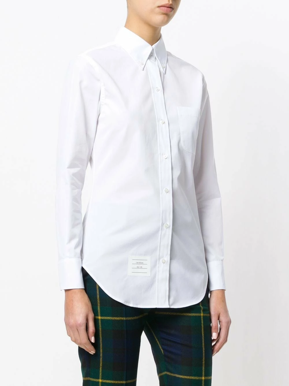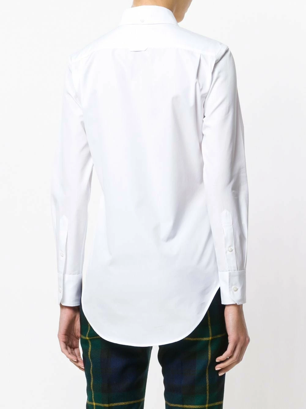 With a history in men’s formalwear, Thom Browne brings its tailoring expertise to the table when creating its women’s collection, focusing on premium materials and expertly cut shapes. Crafted in Italy, the country of fashion, this slim-fit shirt is presented in classic white. Slightly fitted to the body, it has a feminine cut, enhancing women’s curves. It features a casual button-down pointed collar, with front button fastening and buttoned cuffs to long sleeves. To finish it, a chest pocket, a functional hanging loop on the yoke and a curved hemline. The logo patch on the bottom is stamped with the brand’s logo and the size of the piece.