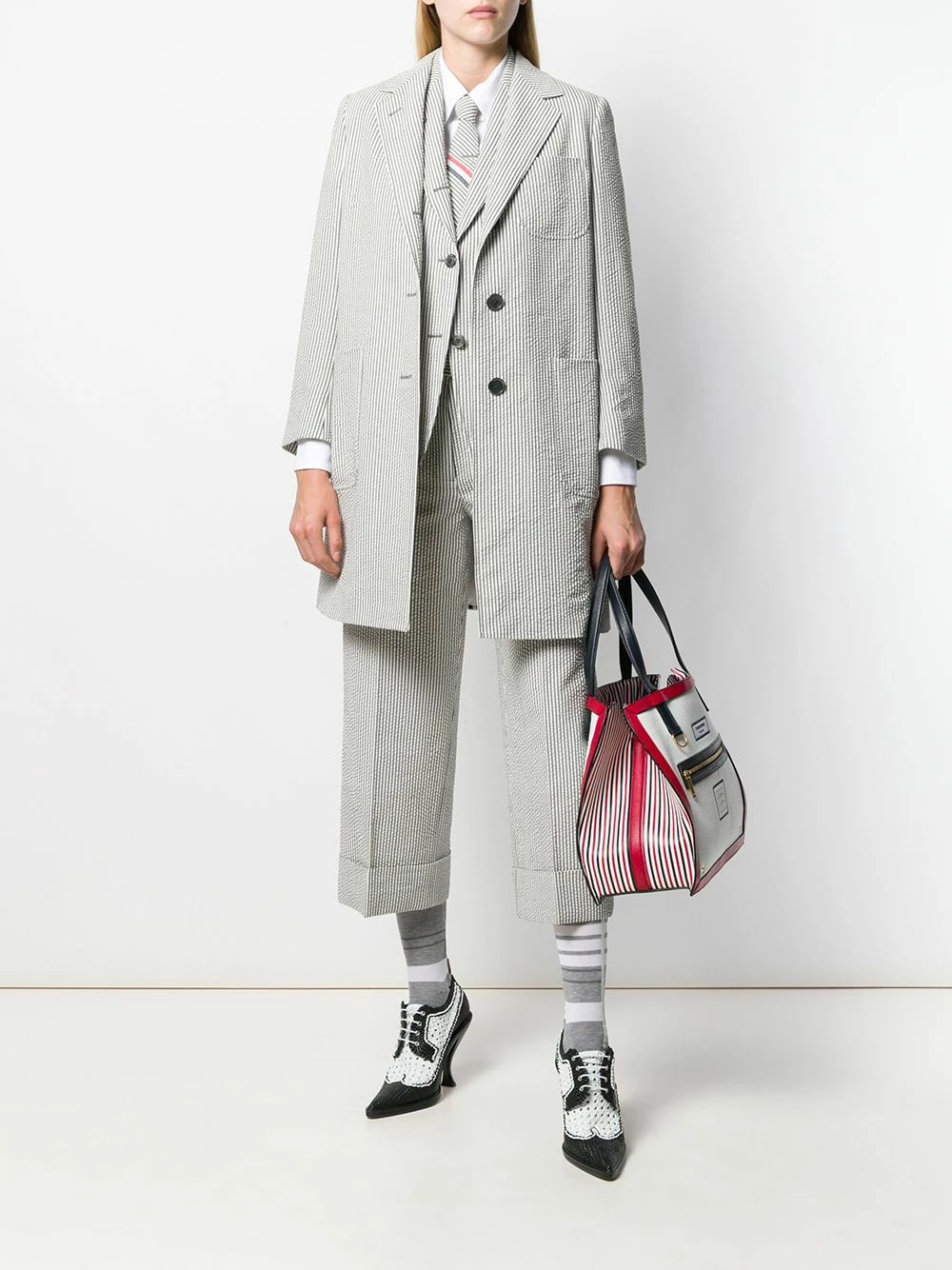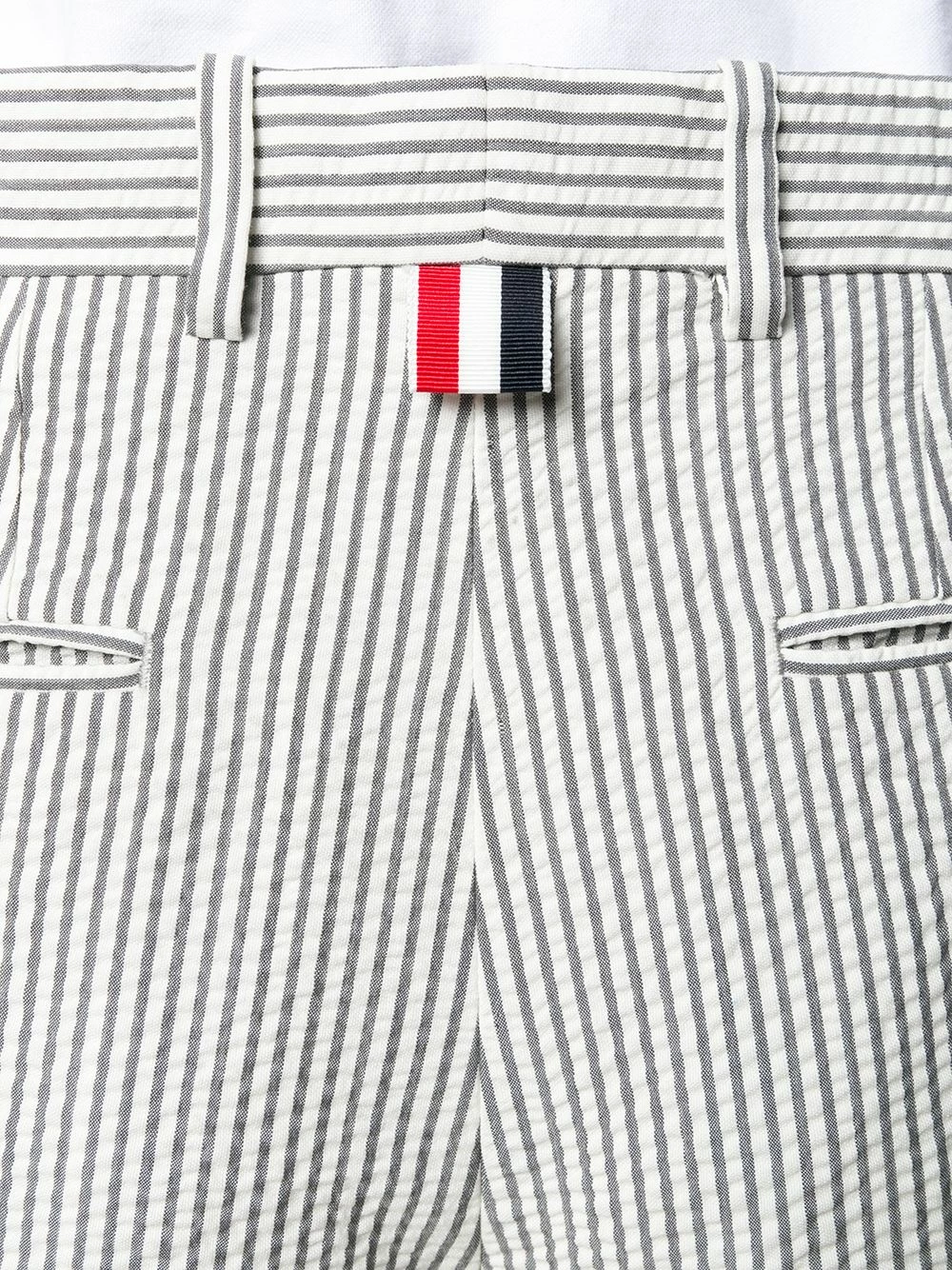 Looking for an iconic Thom Browne style? Then you’ll be wanting some stripes. Stripes like the pattern on these medium grey cropped trousers in front of you! Featuring belt loops, a hook and zip fly, a striped pattern, two back buttoned welt pockets, side slit pockets, a straight leg, turn up hems, a cropped length and a signature grosgrain loop tab.