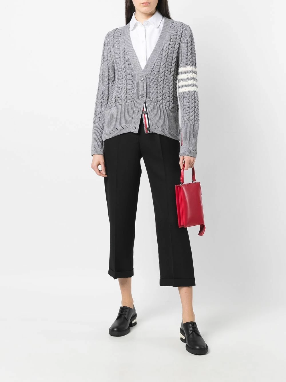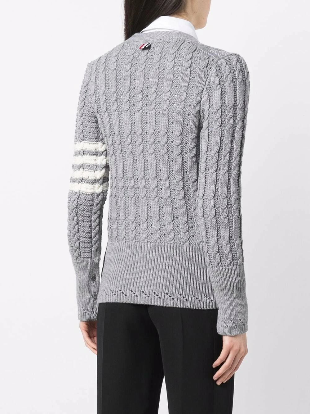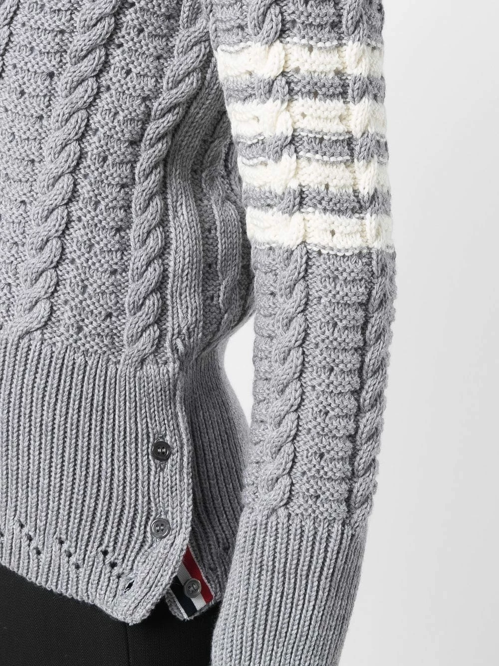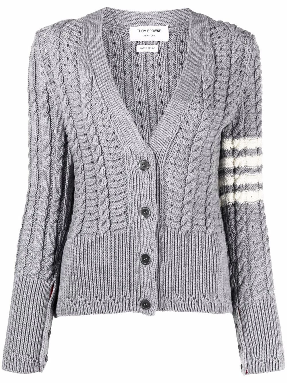Exemplifying tailored knitwear, this cardigan features a cable-knit effect and ribbed waist panel. A signature of the brand, Thom Browne’s 4-bar stripe can be found on the sleeve.