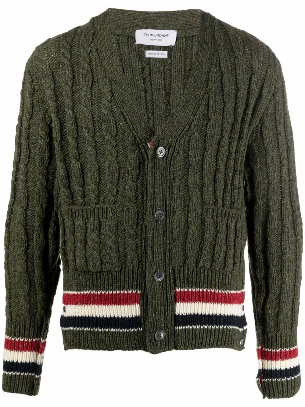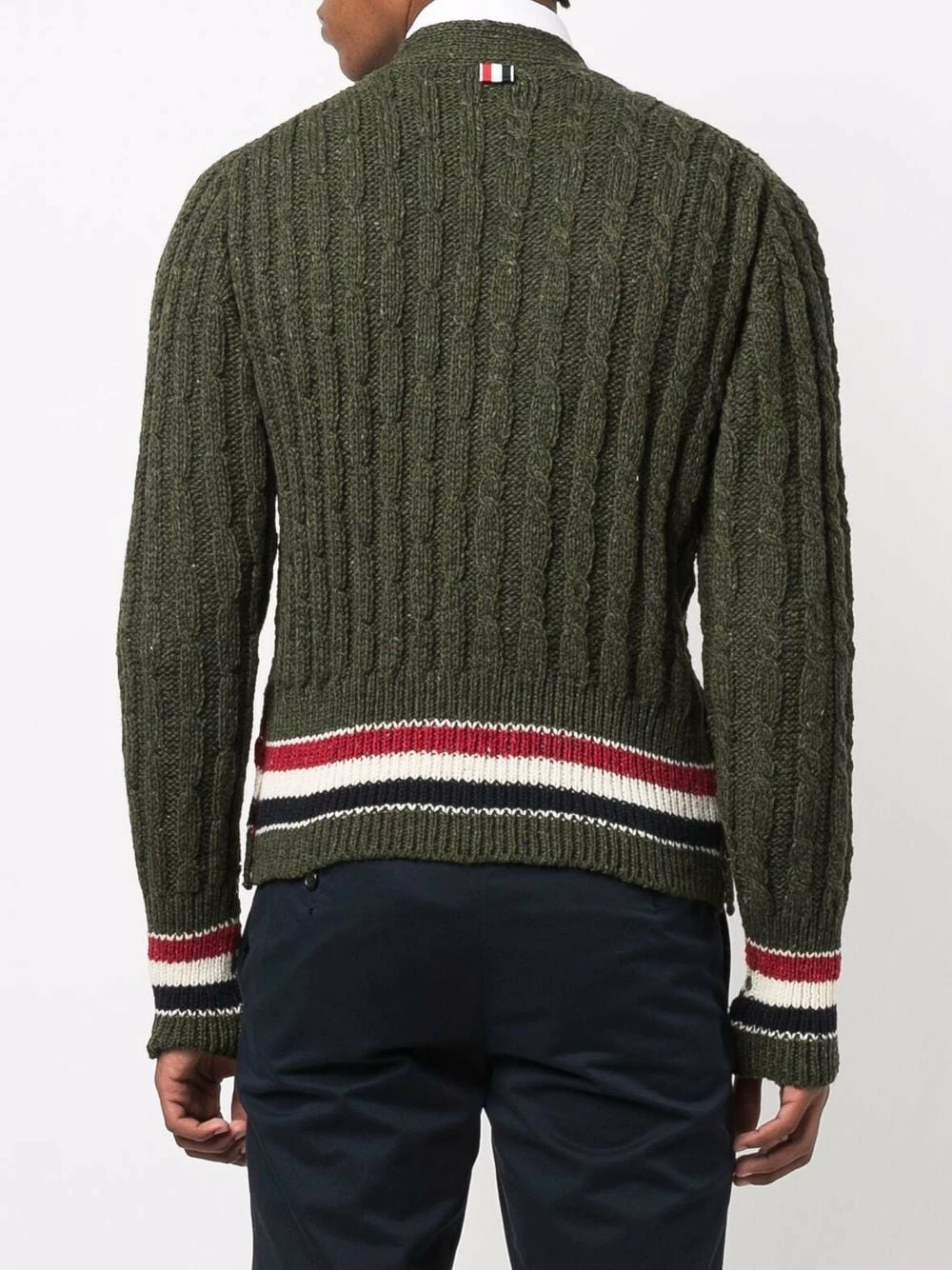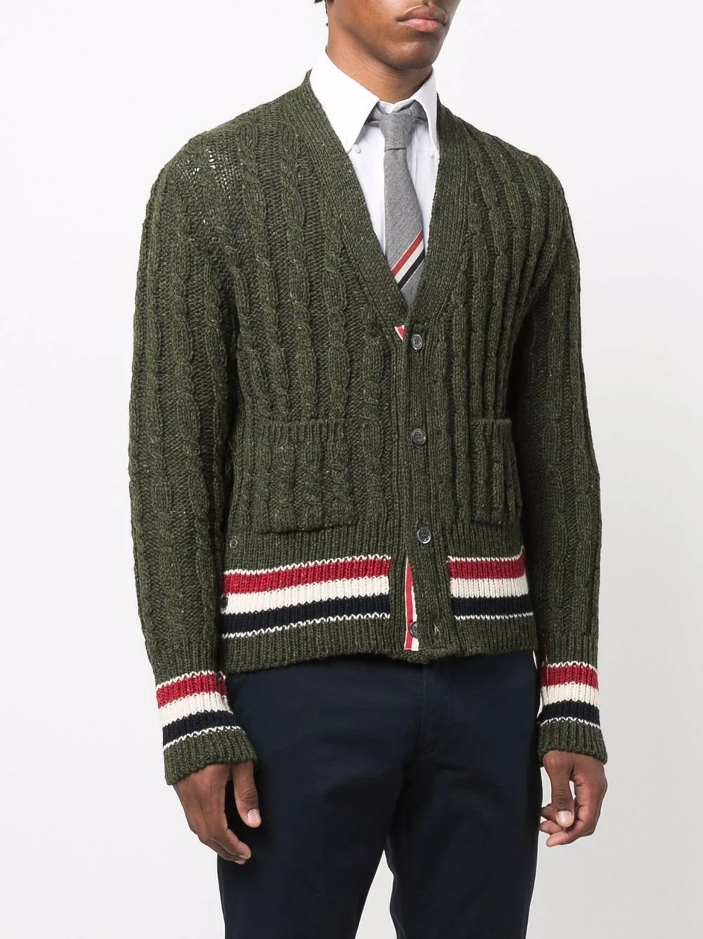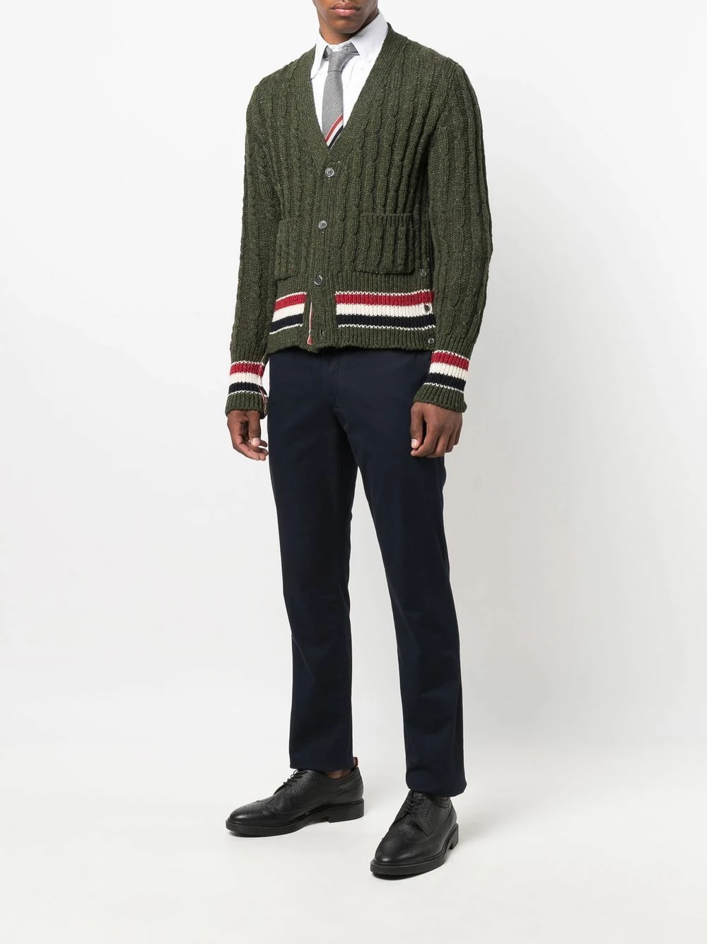 Dark green mohair-wool cable-knit tri-stripe cardigan from THOM BROWNE featuring RWB stripe, cable knit, V-neck, front button fastening, long sleeves, buttoned cuffs, two front patch pockets and straight hem.