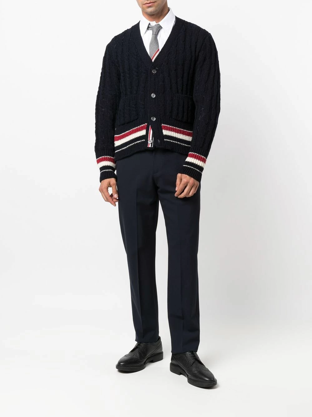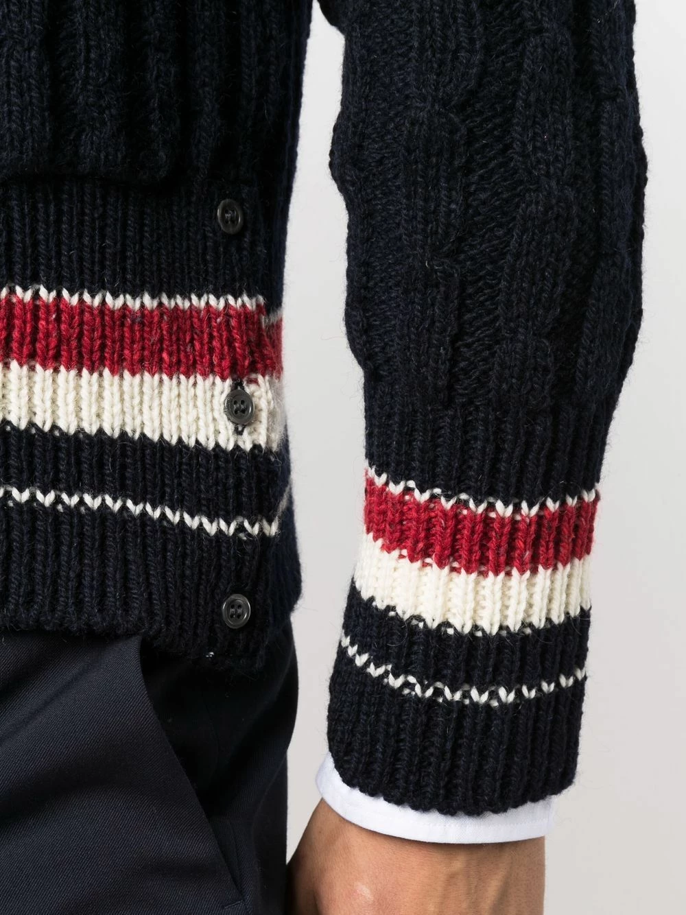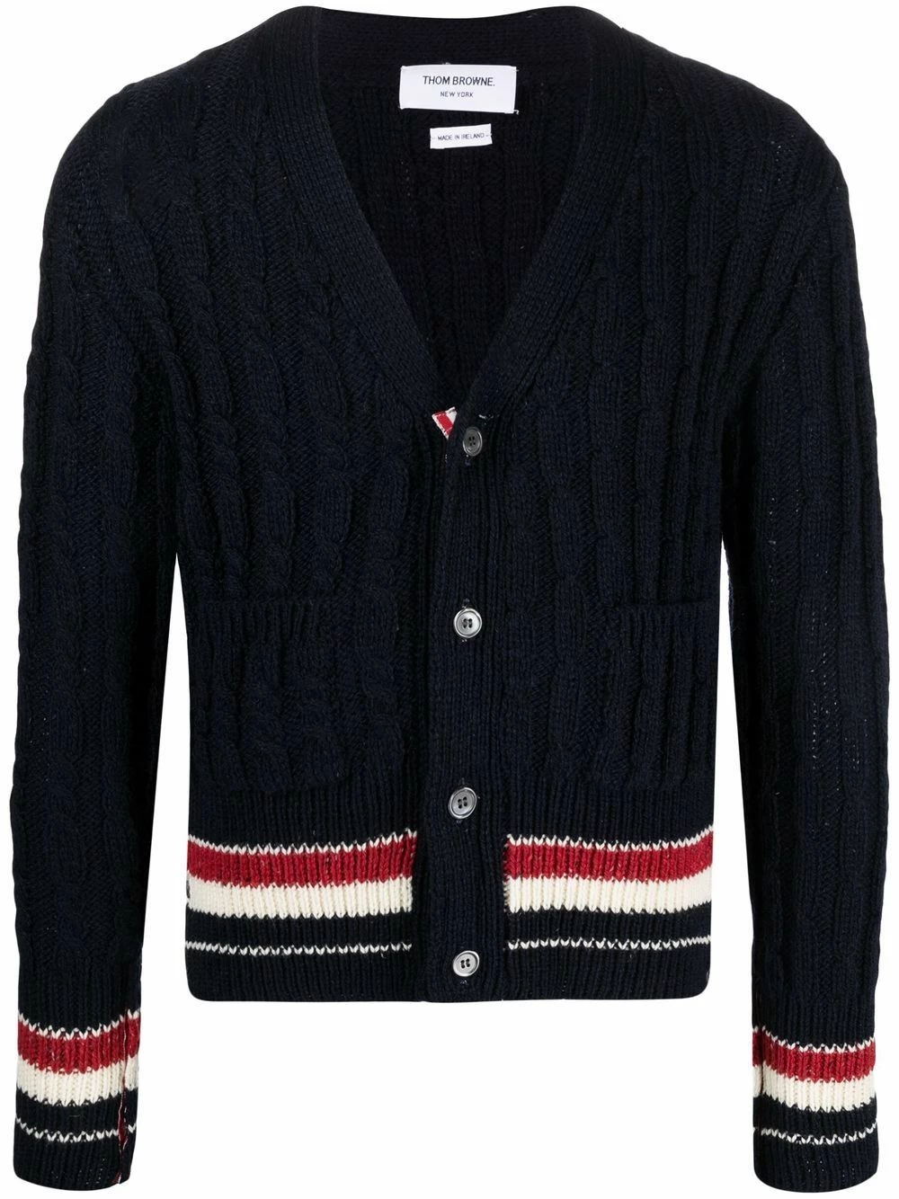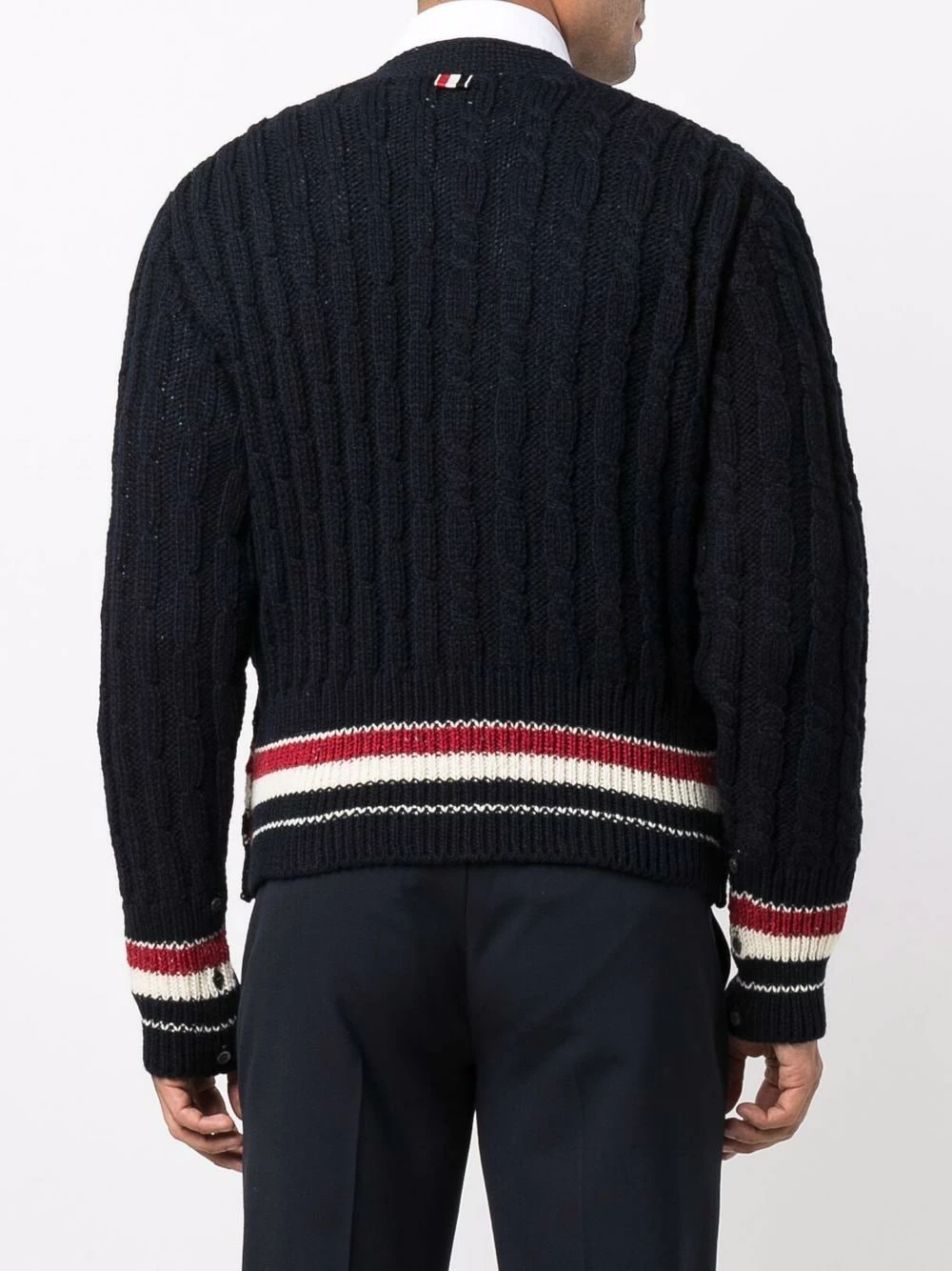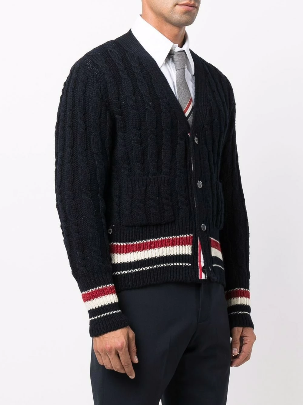 Trimmed with the signature RWB stripe, this navy blue cable-knit cardigan from Thom Browne offers a recognisable look. It has been spun from a blend of wool and mohair for insulating warmth.