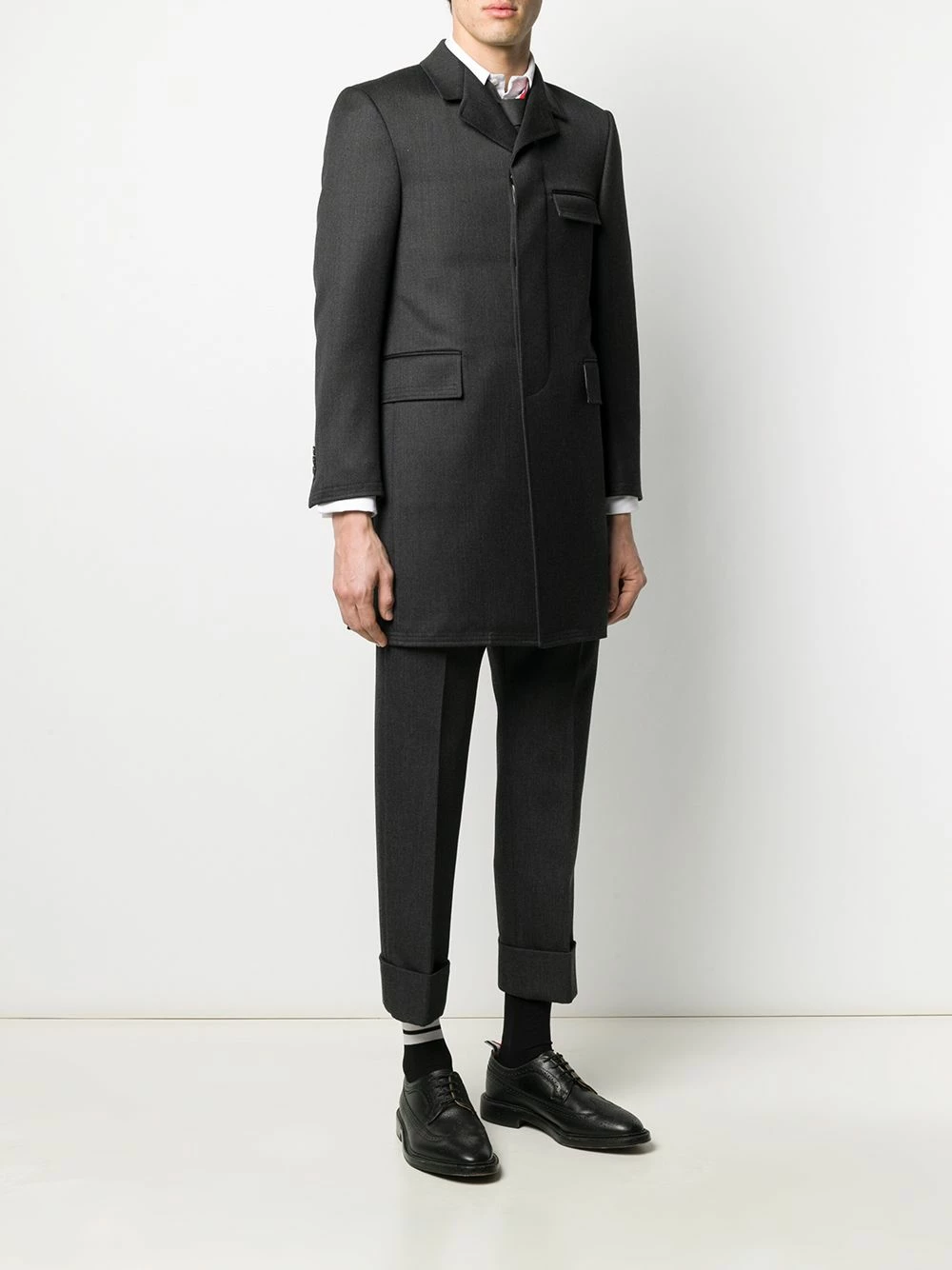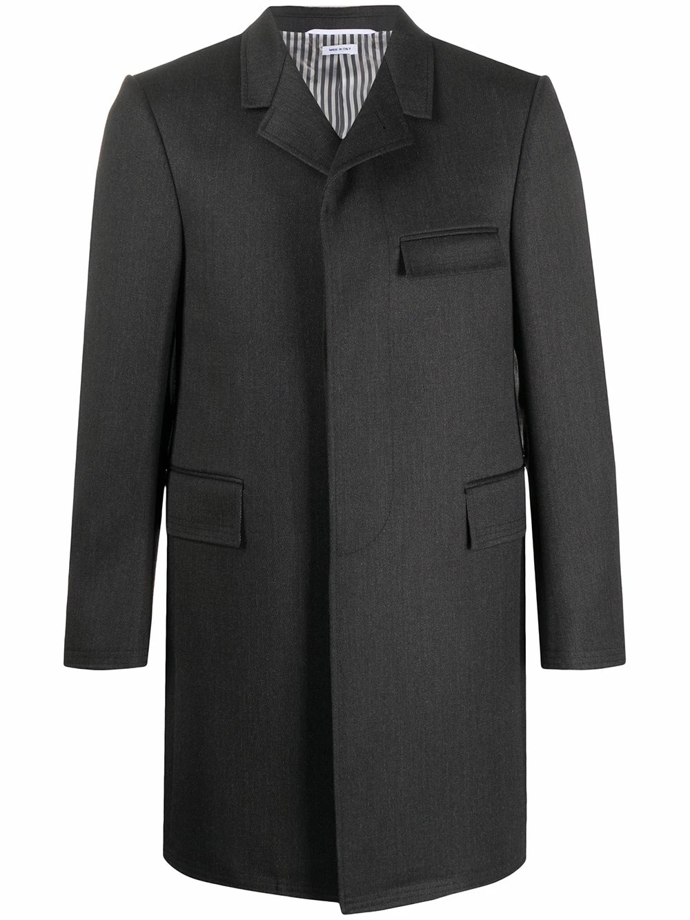 Fix up and look sharp in this cavalry twill Chesterfield overcoat from Thom Browne. This classic design will perfectly complement a formal or business smart look. Its timeless silhouette makes it a sophisticated addition to your wardrobe. Featuring notched lapels, a concealed fastening, front flap pockets, cropped sleeves, a side slit and an RWB stripe tab.