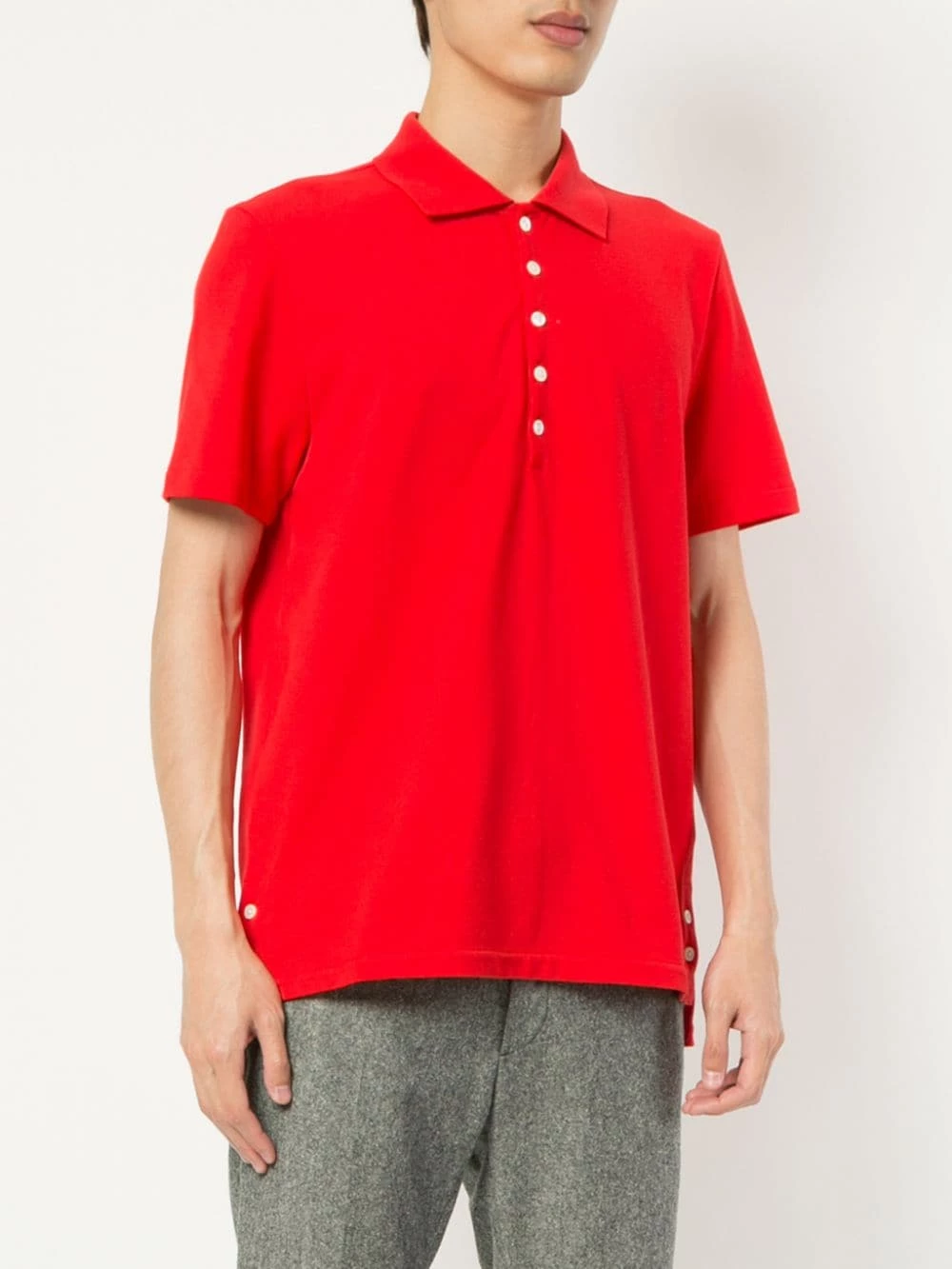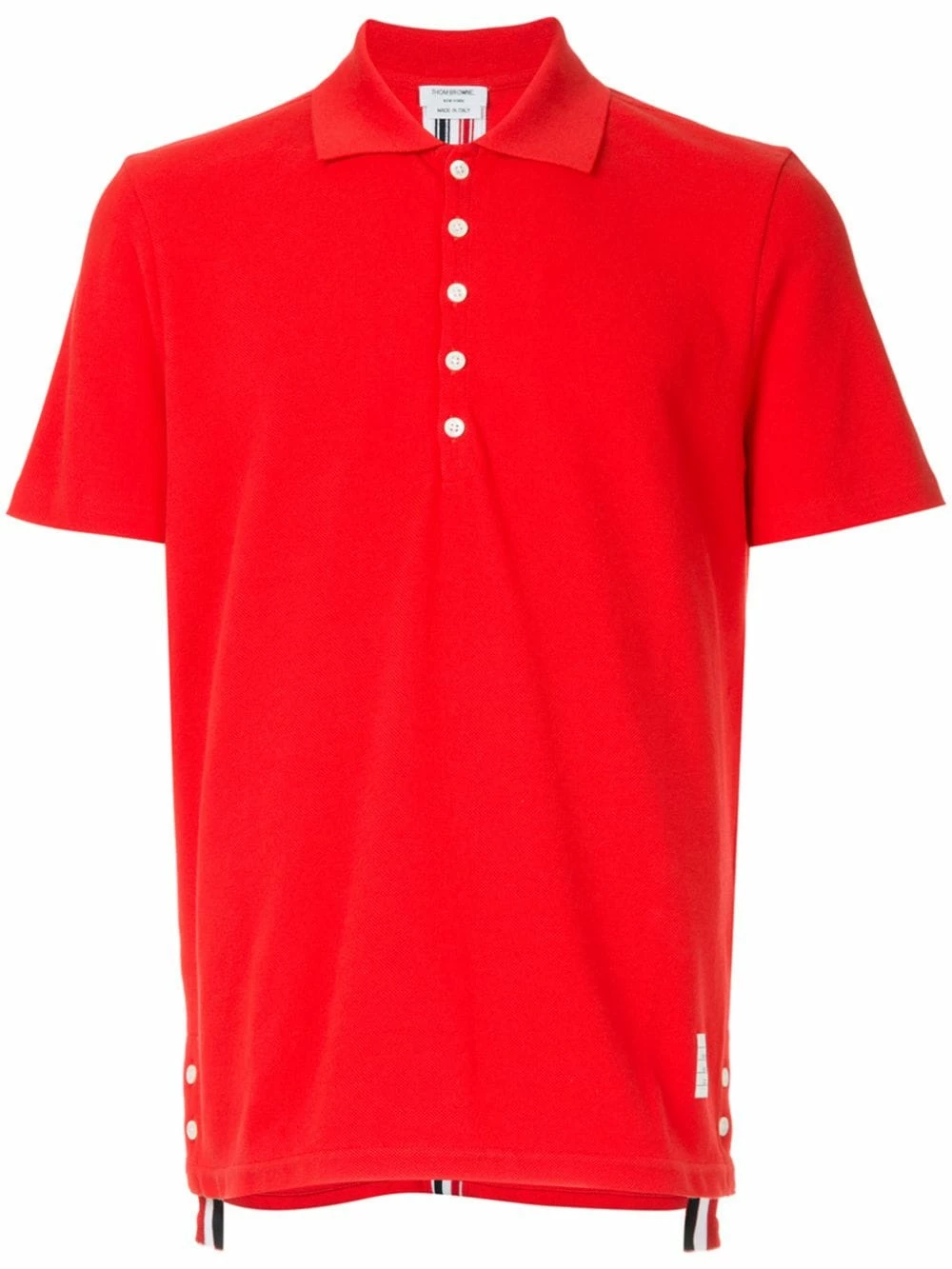 Combining highest-quality fabrics and a conservative sensibility with a touch of irreverence and humour, Thom Browne’s Spring/Summer 2019 is full of modern must-haves. This red cotton center-back stripe polo shirt from Thom Browne features a classic polo collar, a front button placket, short sleeves, a straight hem and a high low hem.