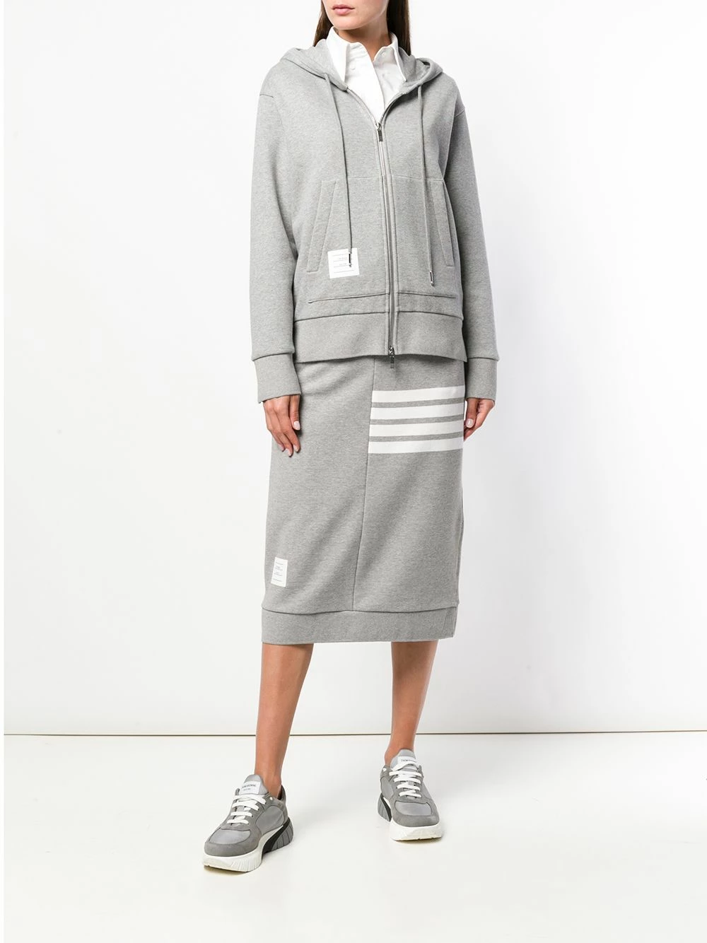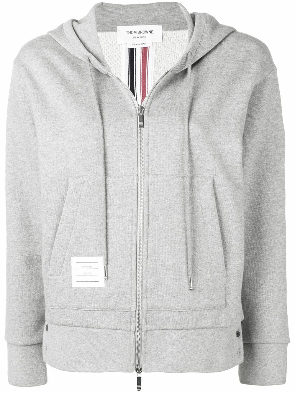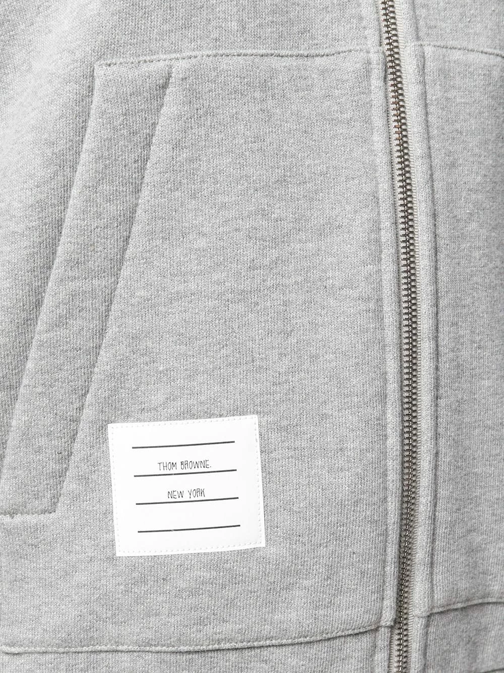 Thom Browne’s newest edit captures the immaculate craftsmanship and minimalist designs that have come to define the American label. Crafted from light grey cotton, this hoodie features a hood with drawstring tie fastenings, a front zip fastening, kangaroo pockets, a front logo patch and a signature tri-colour striped trim at the back.
