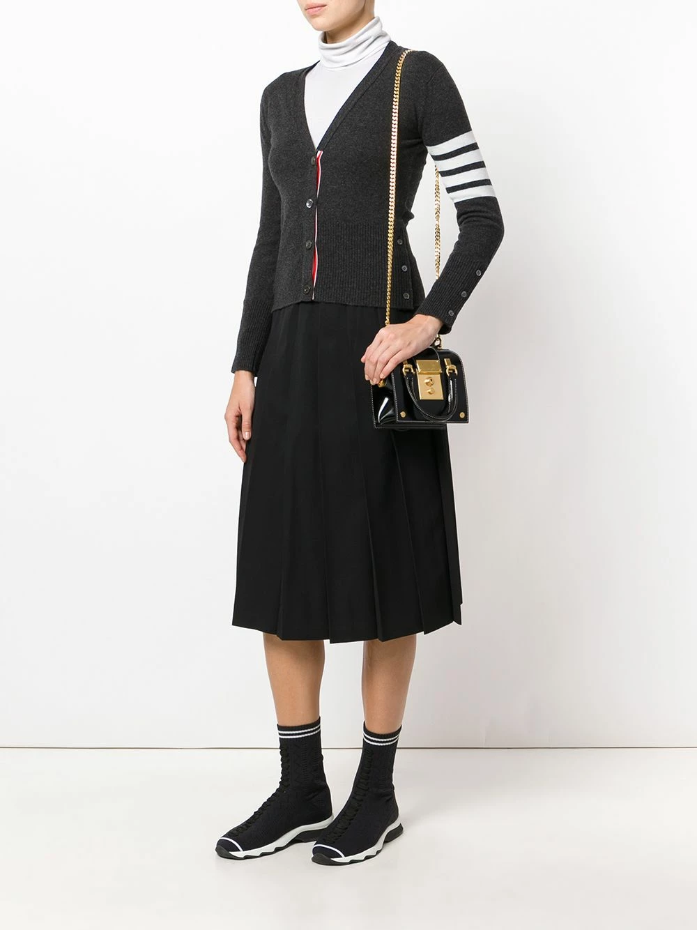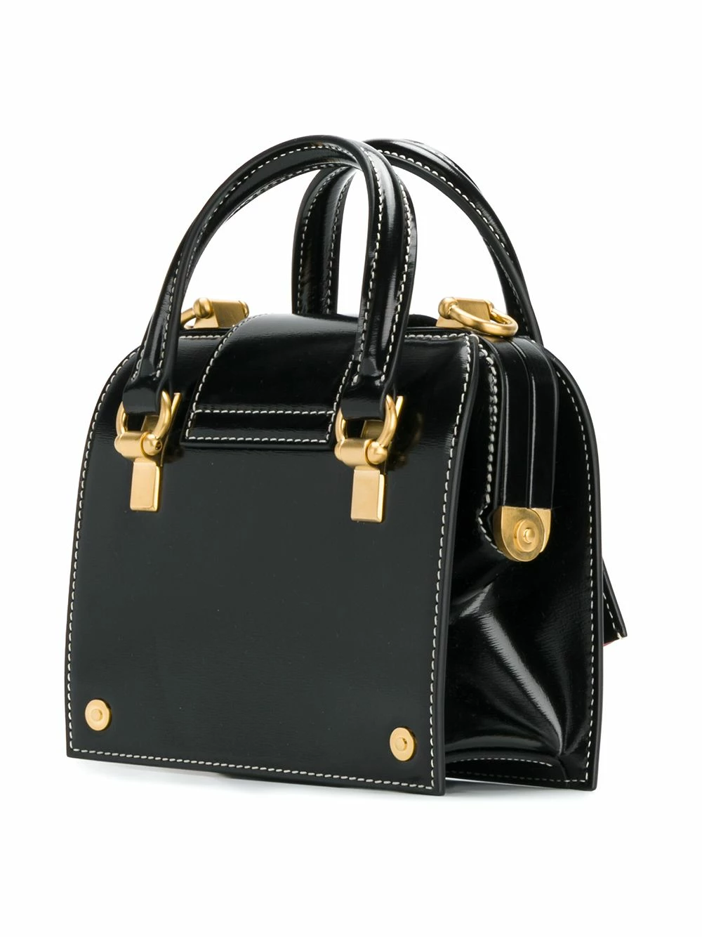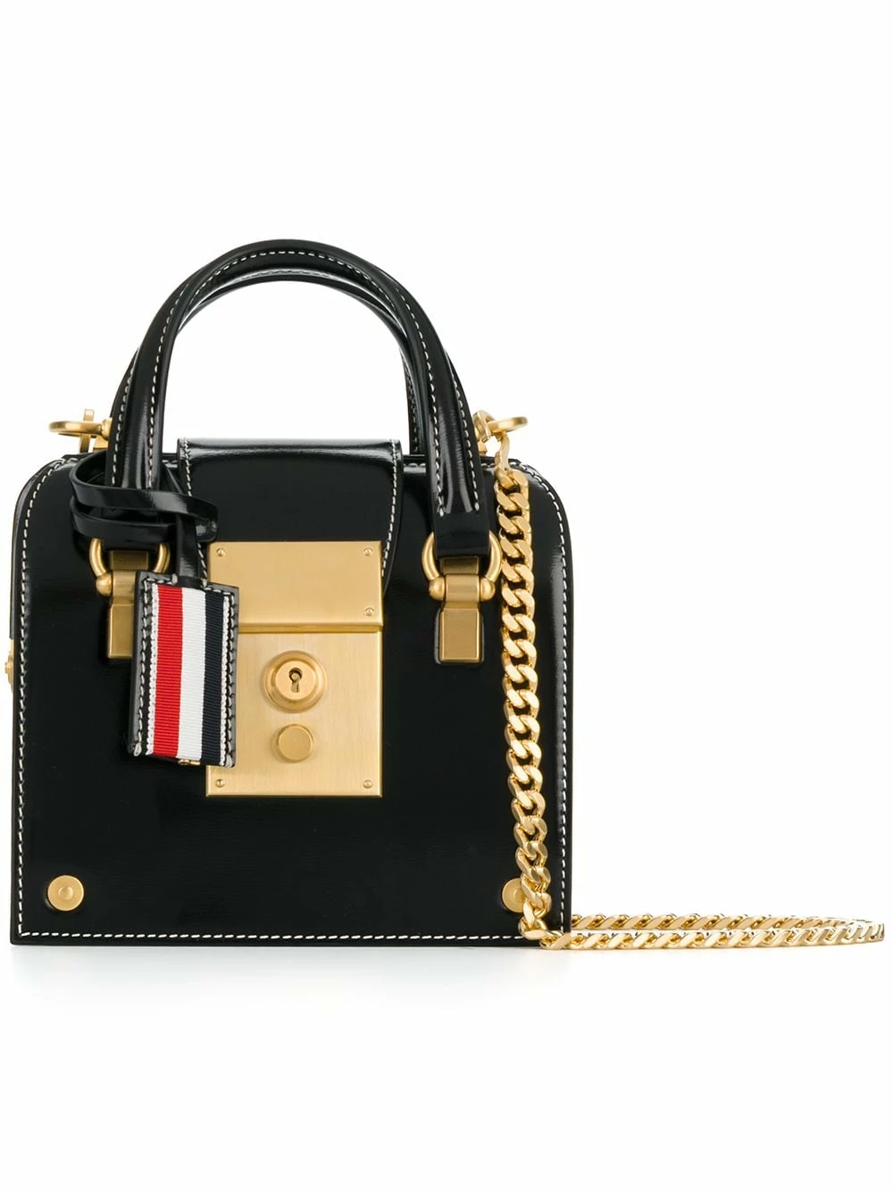 Successfully nominated to and winner of a series of Designer Of The Year titles, Thom Browne began his journey in ready-to-wear in 2003. Crafted in Italy from black calf leather, the Mrs Thom Tiny tote features a round top handles, a removable gold-tone chain strap, a foldover top with push-lock closure, a hanging leather tag, stitching details, gold-tone hardware, a front centre logo stamp, an internal logo patch, a signature striped leather lining, a doctor’s bag structure and the brand’s striped tab at the front.