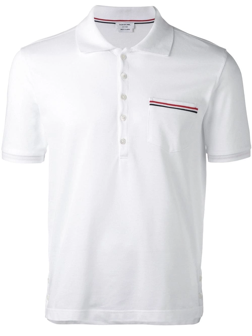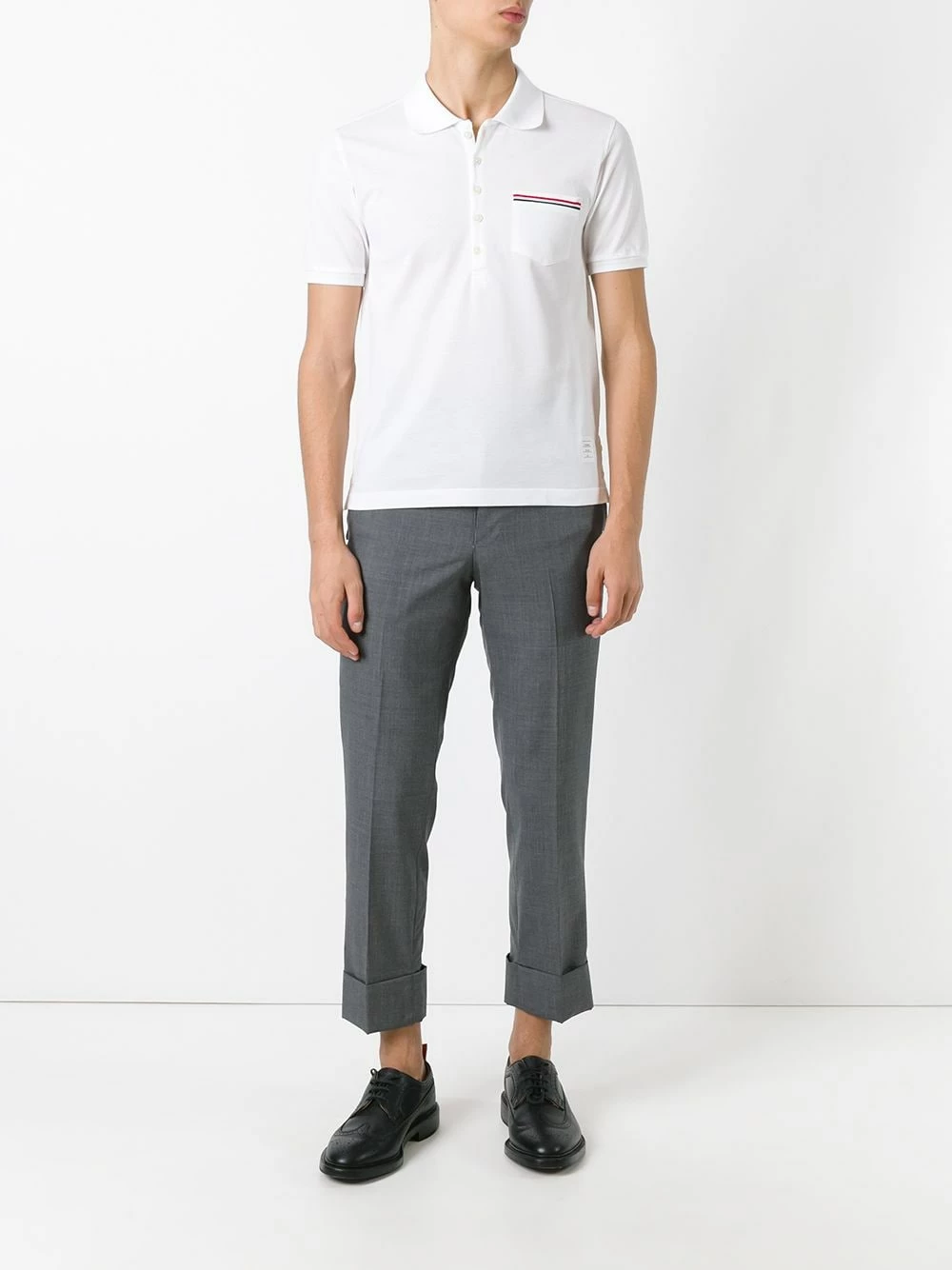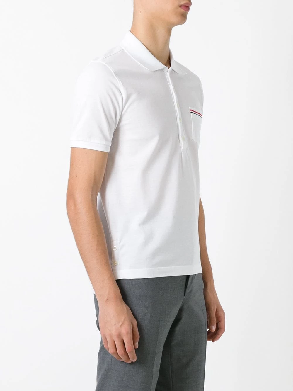 White cotton chest pocket polo shirt from Thom Browne featuring short sleeves, a button-down collar and a front chest pocket with tri-stripe detail.