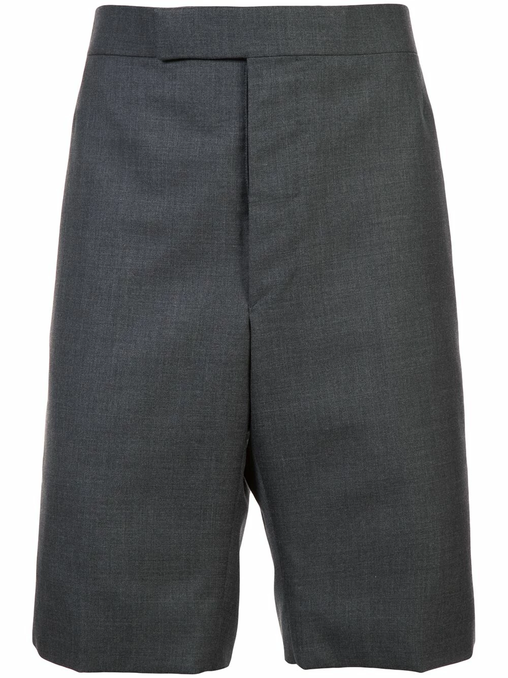 Dark grey wool classic backstrap shorts from Thom Browne featuring a concealed front fastening, side pockets, rear welt pockets and side slits.