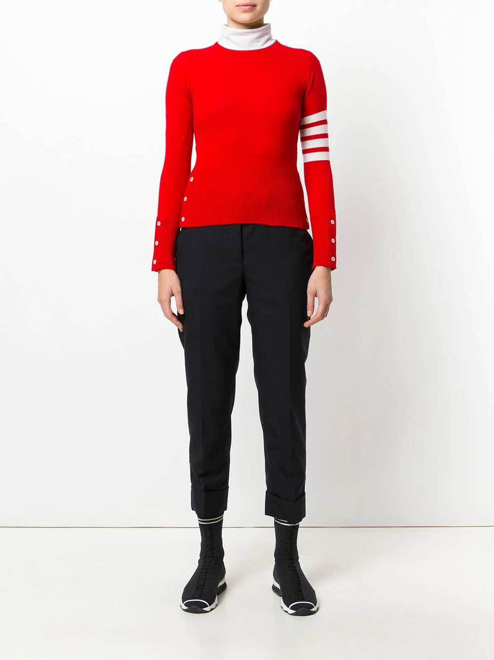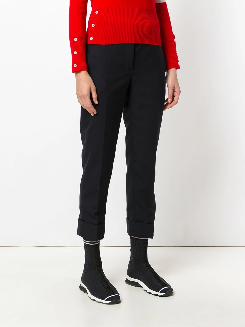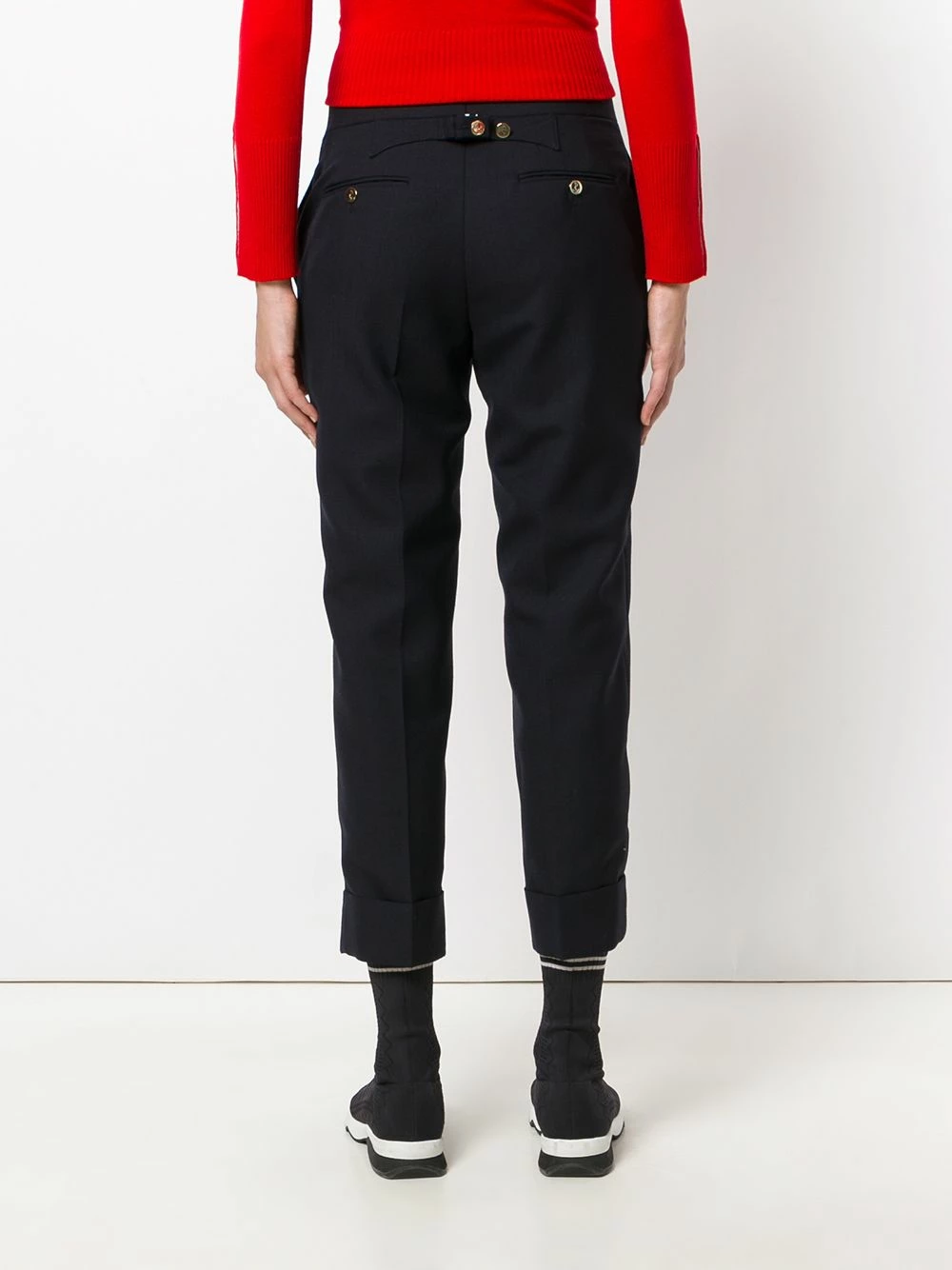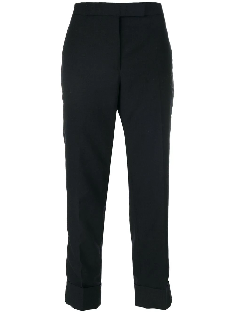 Successfully nominated to and winner of a series of Designer Of The Year titles, Thom Browne began his journey in ready-to-wear in 2003. Crafted in Italy, these classic backstrap tailored trousers feature a hook and zip fly, side slit pockets, two back buttoned welt pockets, a slim fit, a cropped length, a buttoned back strap and a signature striped tab at the back.