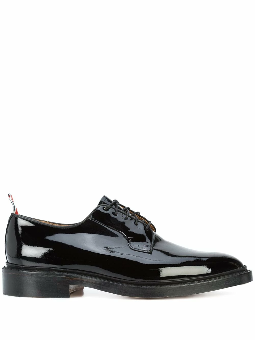 Boasting uniqueness intertwined with an evident inclination towards tailoring, Thom Browne’s footwear are the key pieces to any outfit. These formal derbies disrupt monotony with a glossy black patent leather surface. Elegant and minimalist, they feature an almond toe, a lace-up front fastening, a signature pull tab at the rear, a leather insole, a leather sole and a chunky low heel.