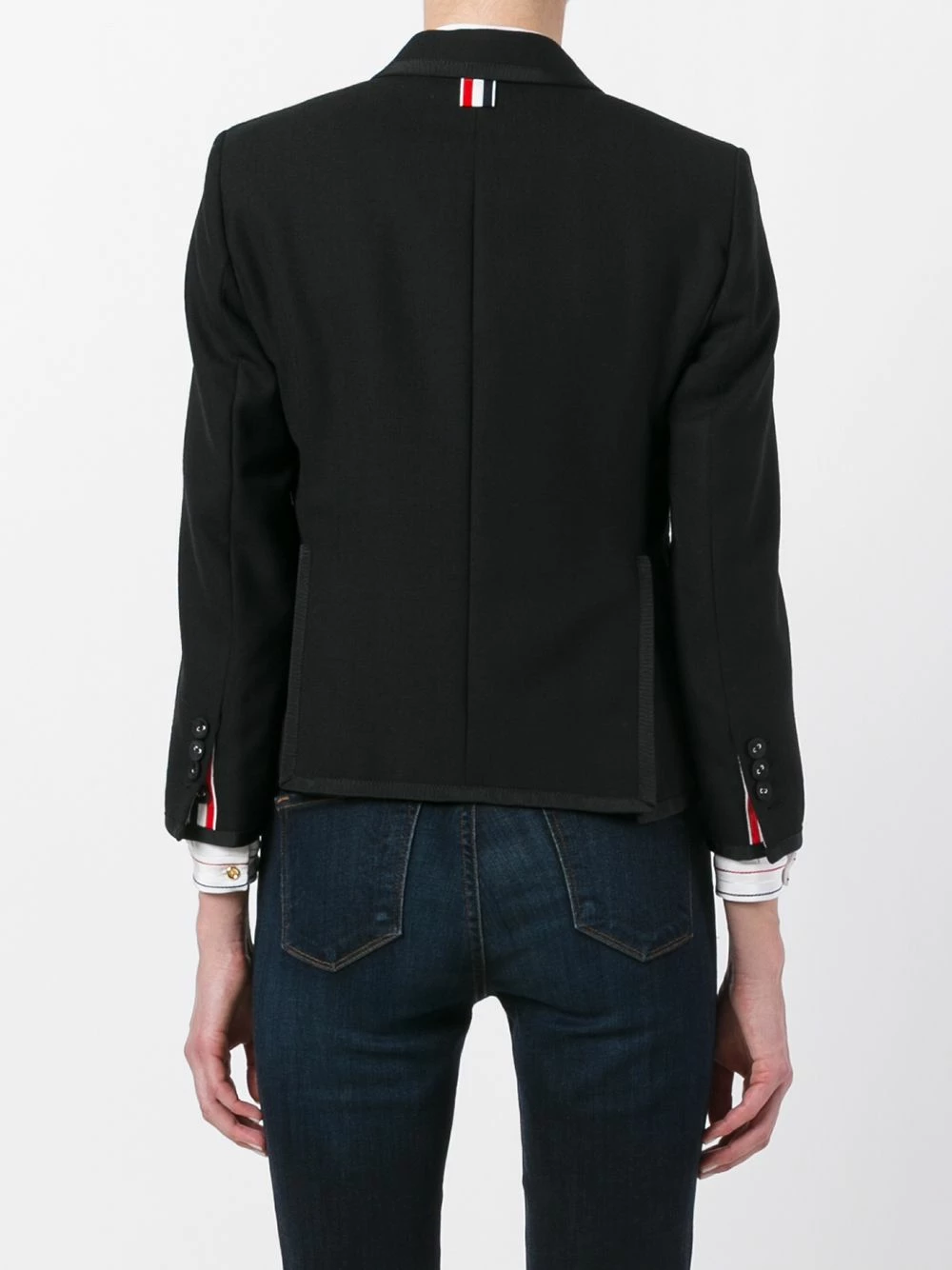 Black wool and silk Classic Single Breasted Sport Coat With Grosgrain Tipping In 2 Ply Fresco from Thom Browne featuring notched lapels, a button fastening, three-quarter length sleeves, button cuffs, a broad welt chest pocket, front flap pockets, a curved hemline, a double vent to the rear, a slim fit, red, white and blue grosgrain cuffs detail and back yoke tab, ribbed piping detail and a three-coloured signature lining.