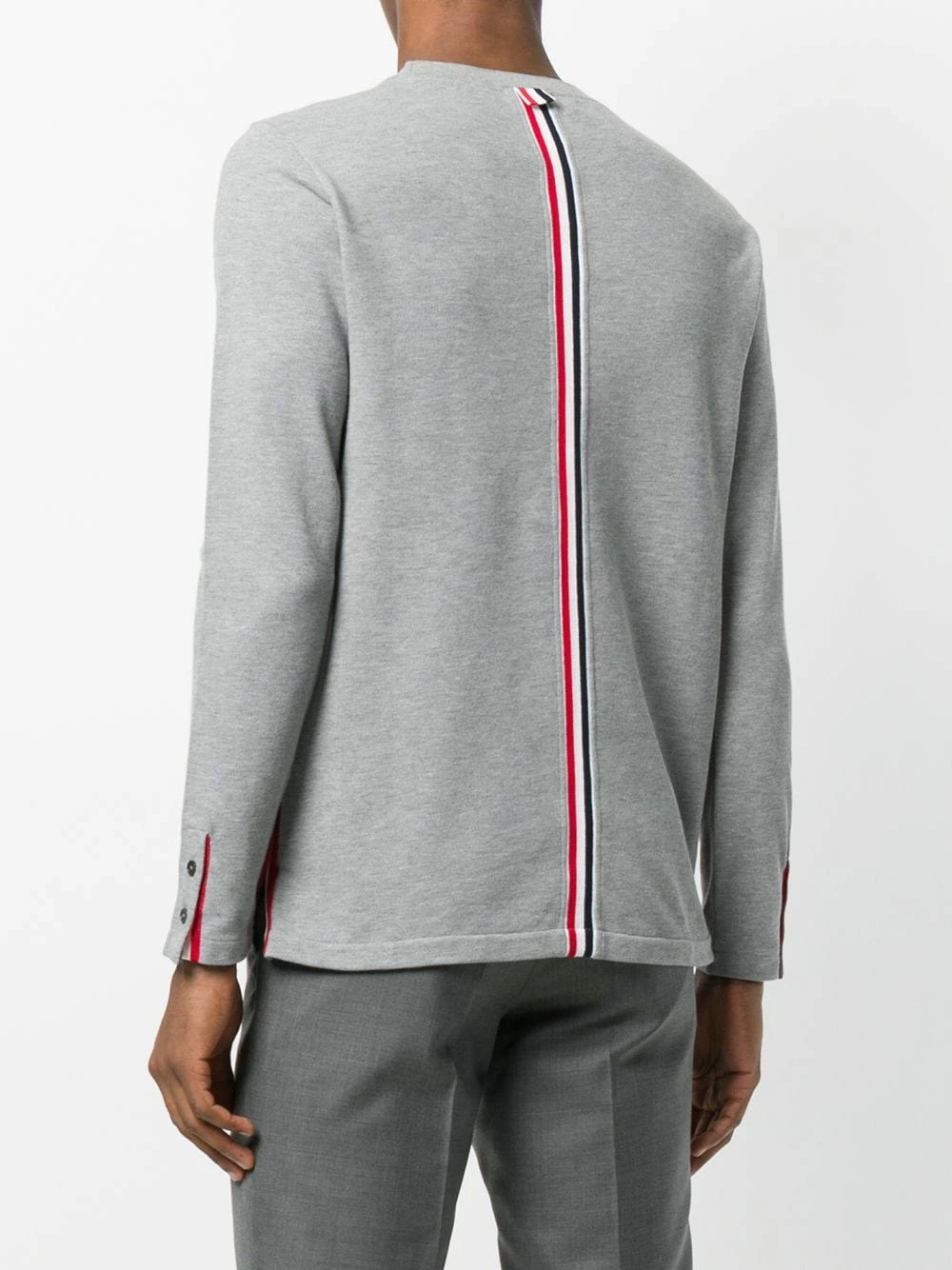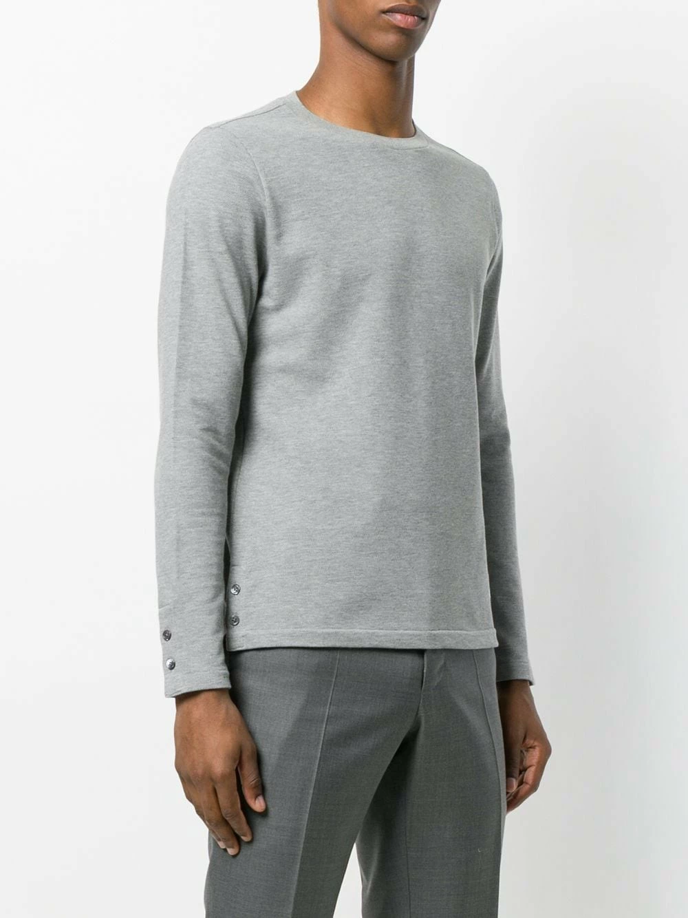 Acclaimed for his subtly deconstructed tailoring, Browne incorporates traditional craftsmanship techniques to modern transformations in men’s everyday wear. This grey cotton classic sweatshirt from Thom Browne features a round neck, long sleeves and a signature tri-colour striped trim.