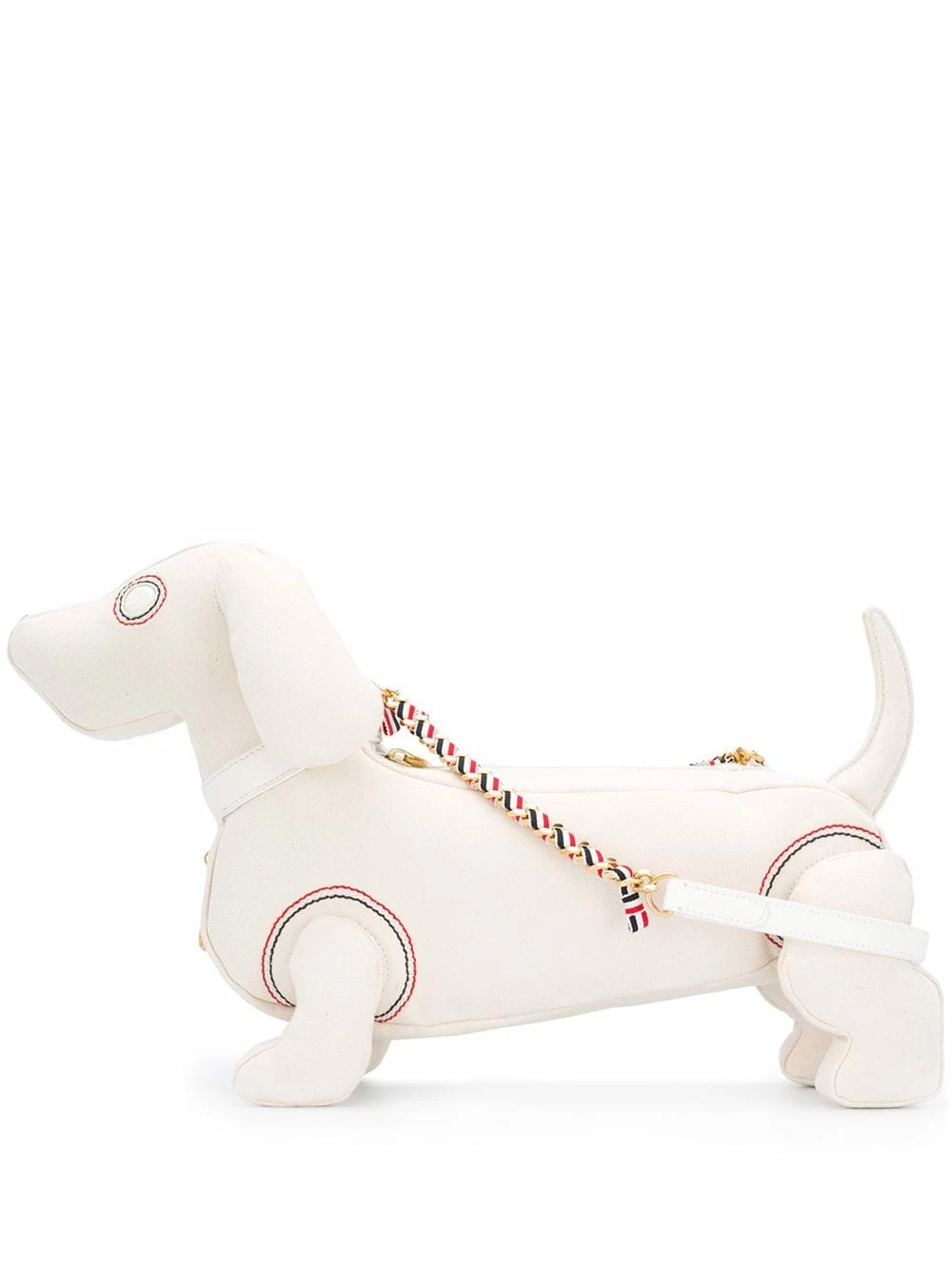 Take your bag-game to the next step with this cotton Hector Bag from Thom Browne. Prepare for all the looks. You’re winning. Featuring shoulder strap, a hanging leather tag, chain-link lead, a top zip closure, an internal zipped pocket, an internal logo patch, gold-tone hardware, a gold-tone bone charm with an engraved logo, a tricolour grosgrain tab and a striped lining.
