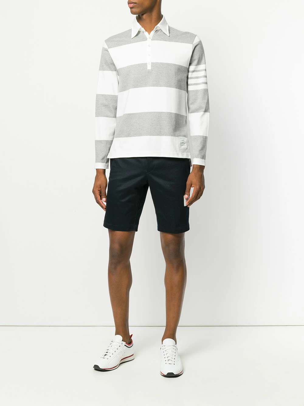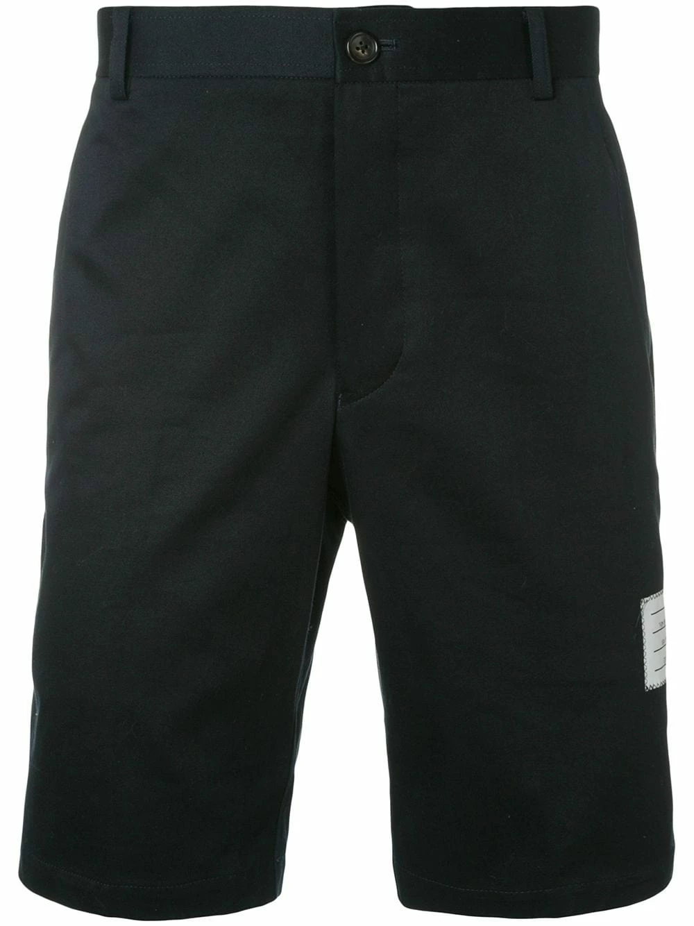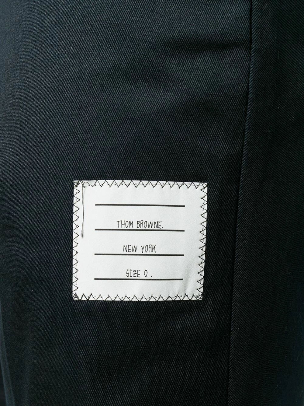 Navy Cotton Twill Unconstructed Chino Trouser from Thom Browne featuring a waistband with belt loops, a button and zip fly, side slit pockets, a front logo plaque, two back buttoned welt pockets and a signature tri-colour striped logo tab.