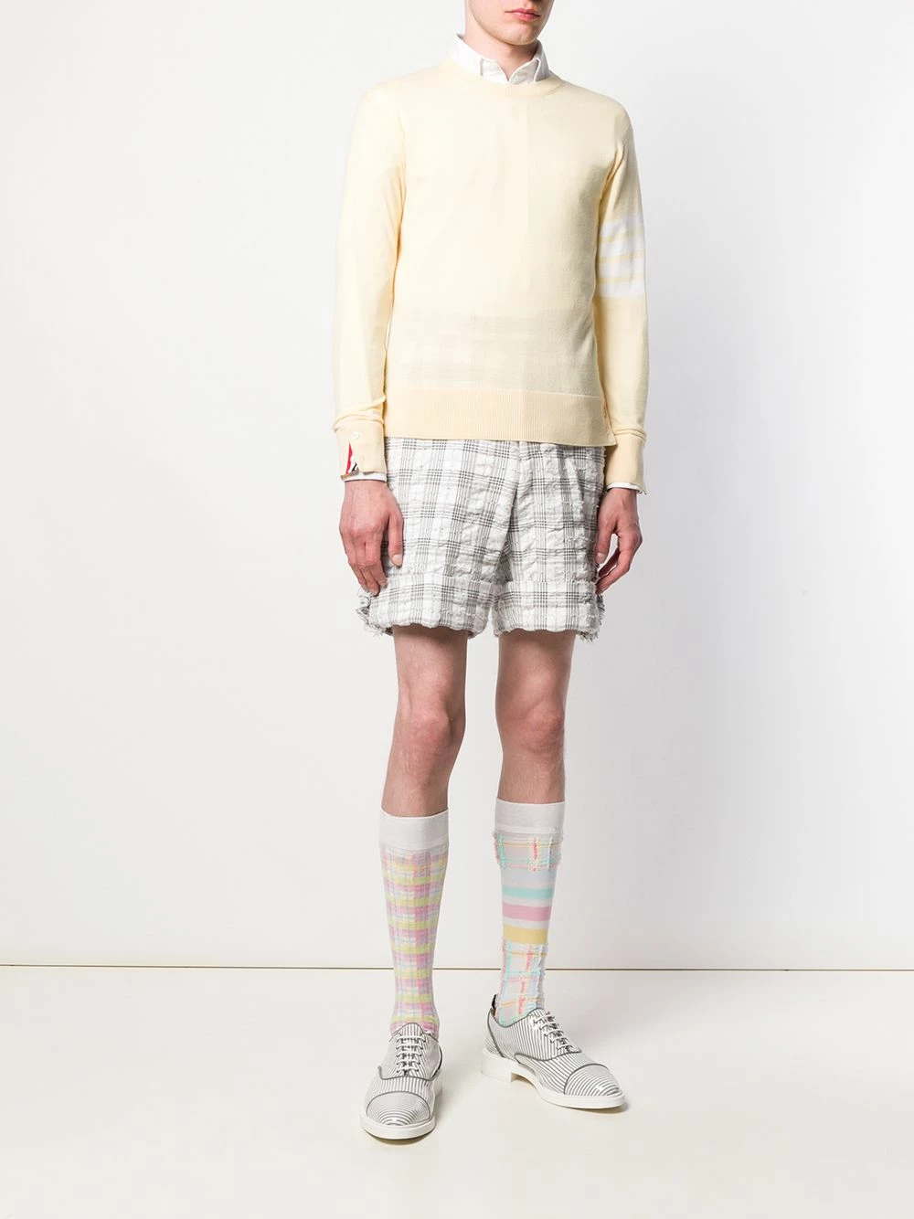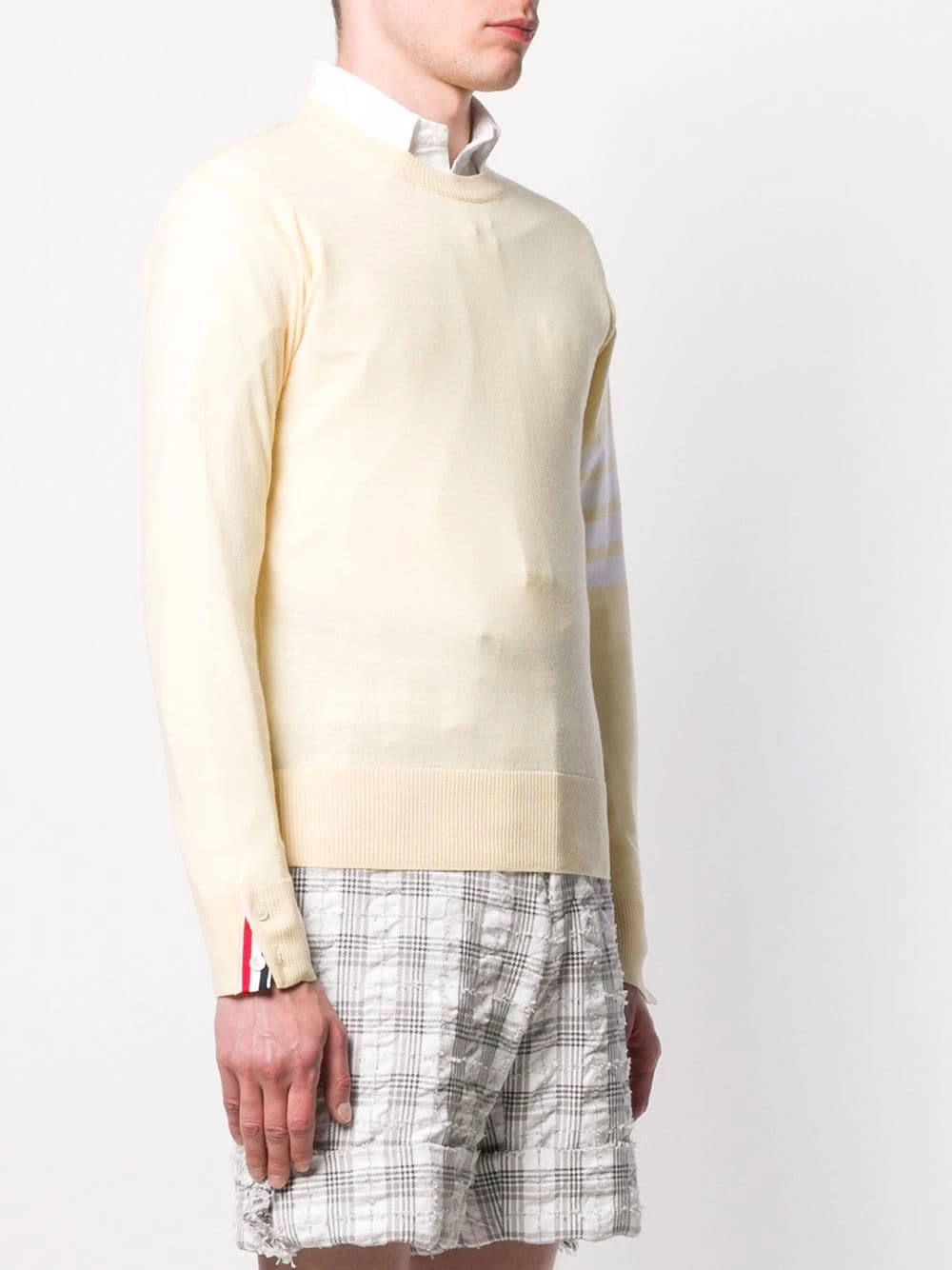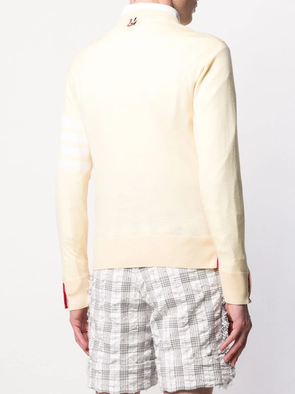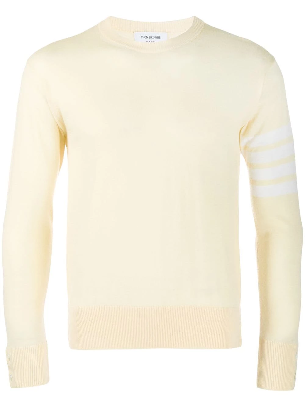 Looking for classic wardrobe pieces with a distinctive edge? Thom Browne will give you an easy route full of sleek, stylish pieces and new-season must-haves. This yellow merino wool crew neck jumper from Thom Browne is sure to be an SS20 staple. Featuring a ribbed crew neck, a tri-stripe logo patch to the back of the neck, long sleeves with a 4-Bar motif to one side and a ribbed hem and cuffs.