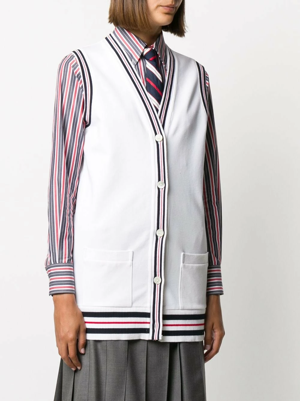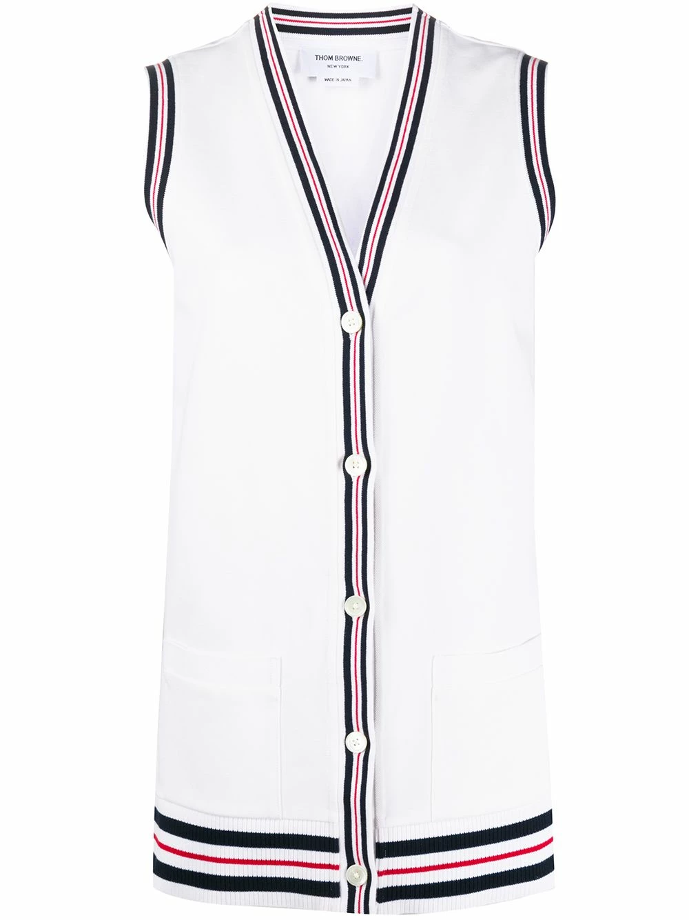 Showcase your inner sporty side. Even if it’s not a side that comes out very often, this Thom Browne vest cardigan will prove you’ve got it in you somewhere. Button up.