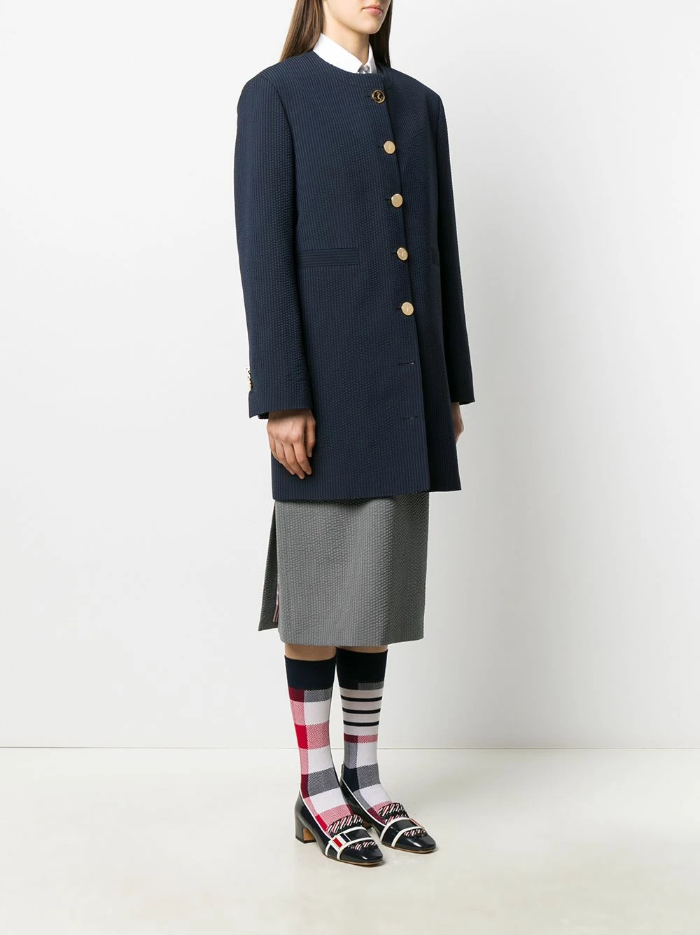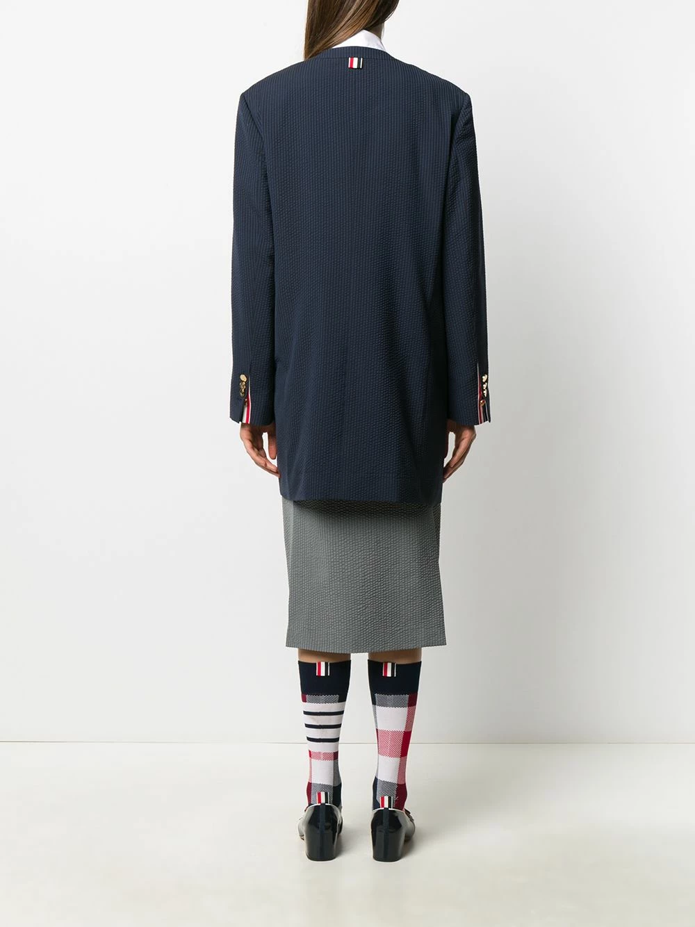 We feel we should warn you about the number of compliments you’ll receive when wearing this oversize blazer. It features a vertical stripe pattern, crinkled finish, and a front button fastening. A winning combination.