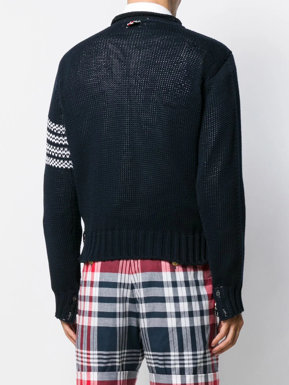 Looking for classic wardrobe pieces with a distinctive edge? Thom Browne will give you an easy route. Crafted from soft cotton, this crew neck jumper is detailed with an intarsia dolphin knit. Featuring a crew neck, long sleeves, a ribbed hem and cuffs, signature 4-Bar detailing and a dolphin motif to the chest.