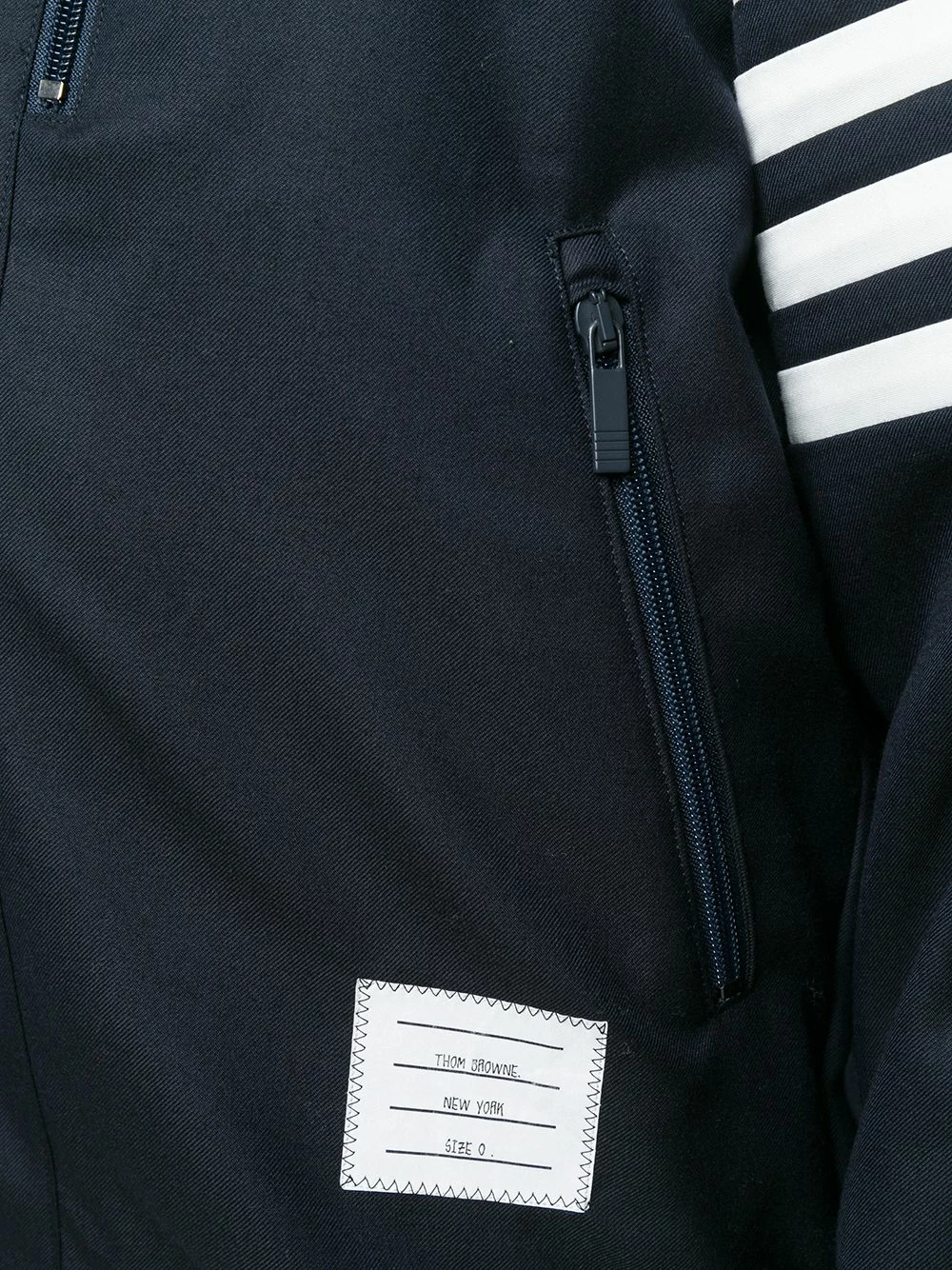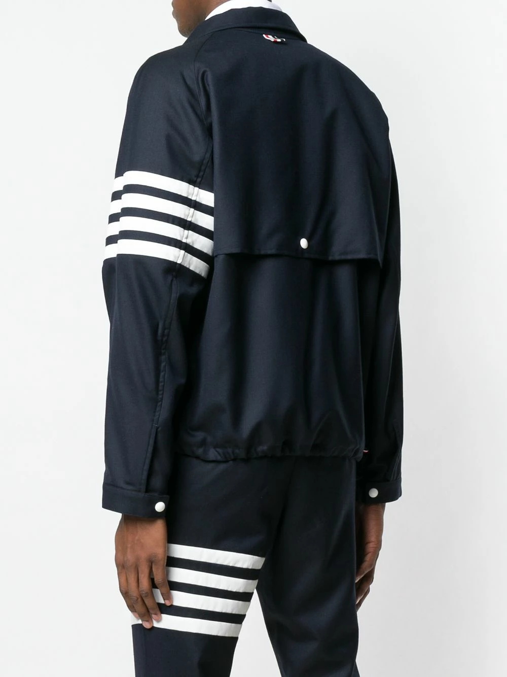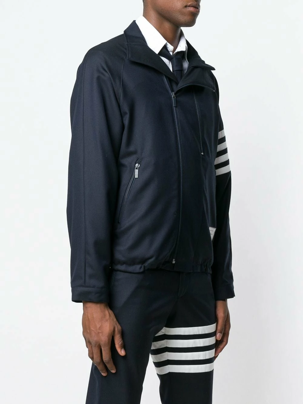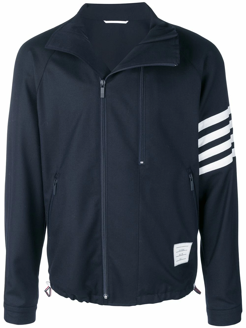 Sporty but sleek. That’s how you’ll look in this navy-blue wool double-zip jacket from Thom Browne. It’s not all about the suits.