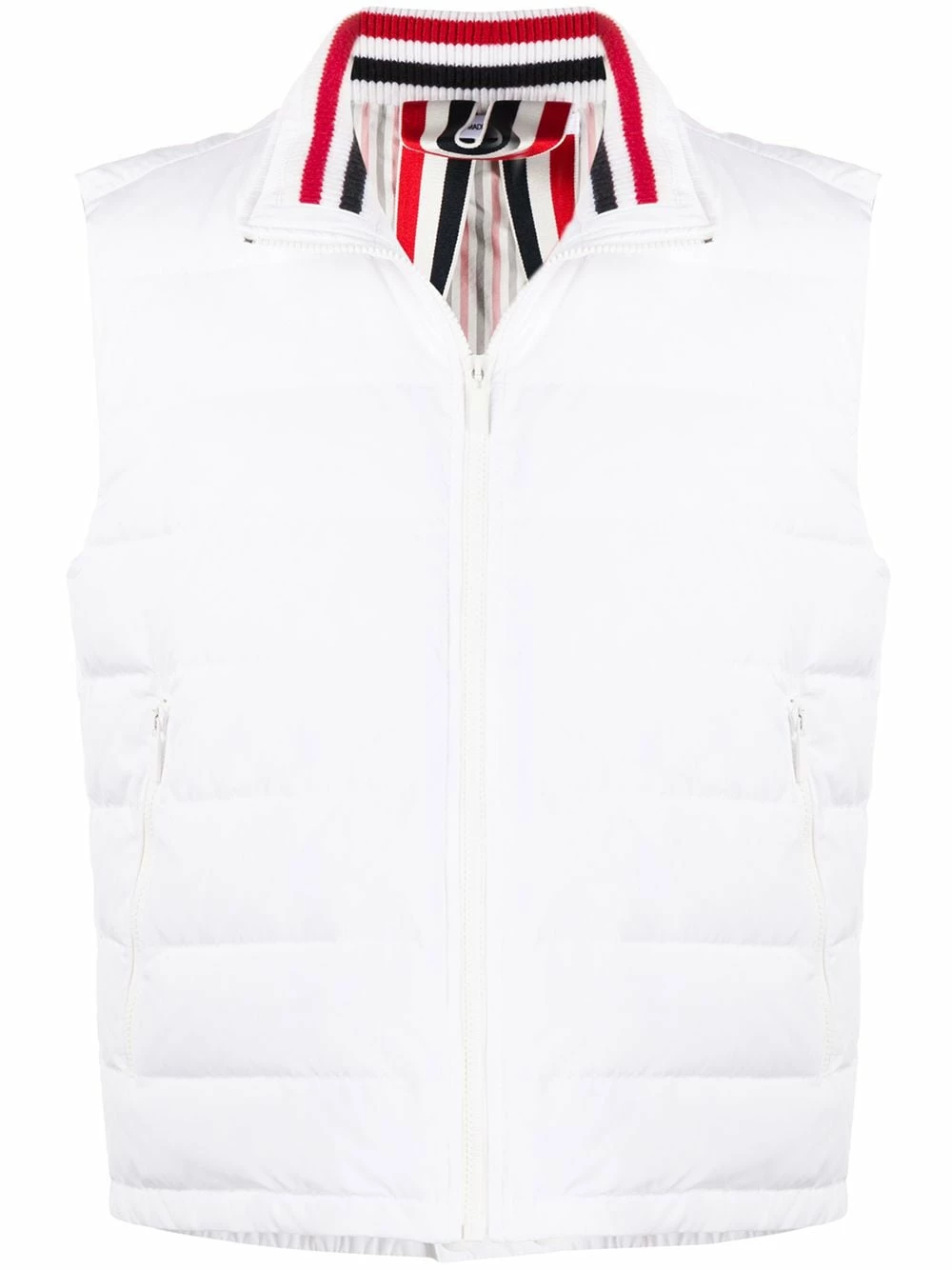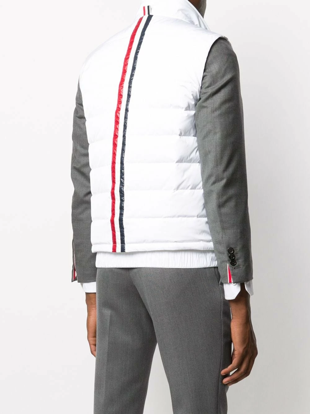 Keep warm in the coolest way possible, with this padded gilet from Thom Browne. The goose-down padding keeps you insulated, whilst the front zip fastening and rear tricolor detail add a practical yet fashion-forward element.