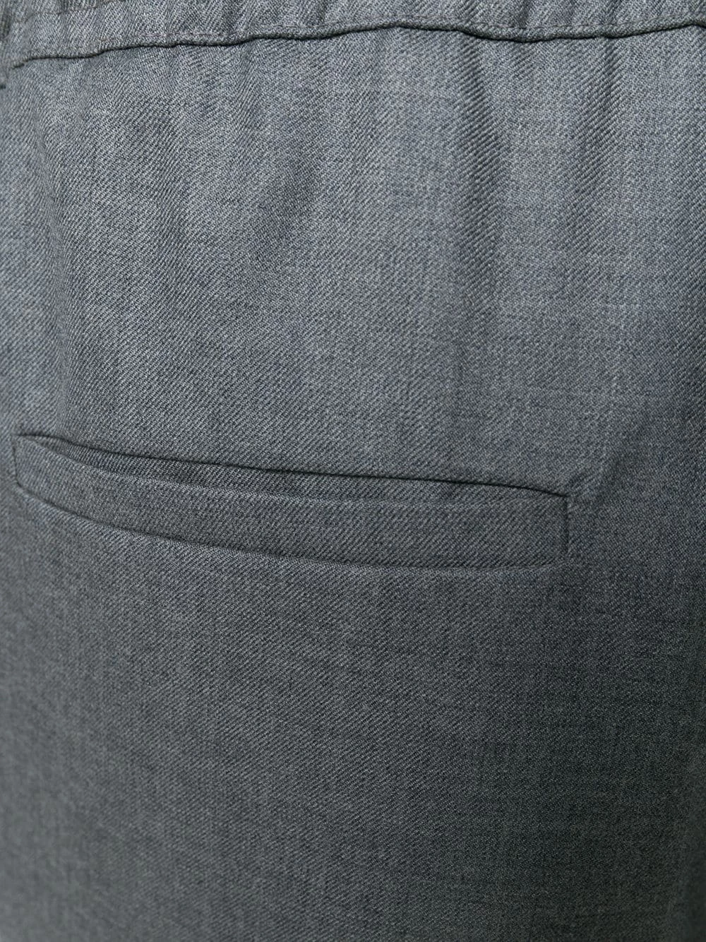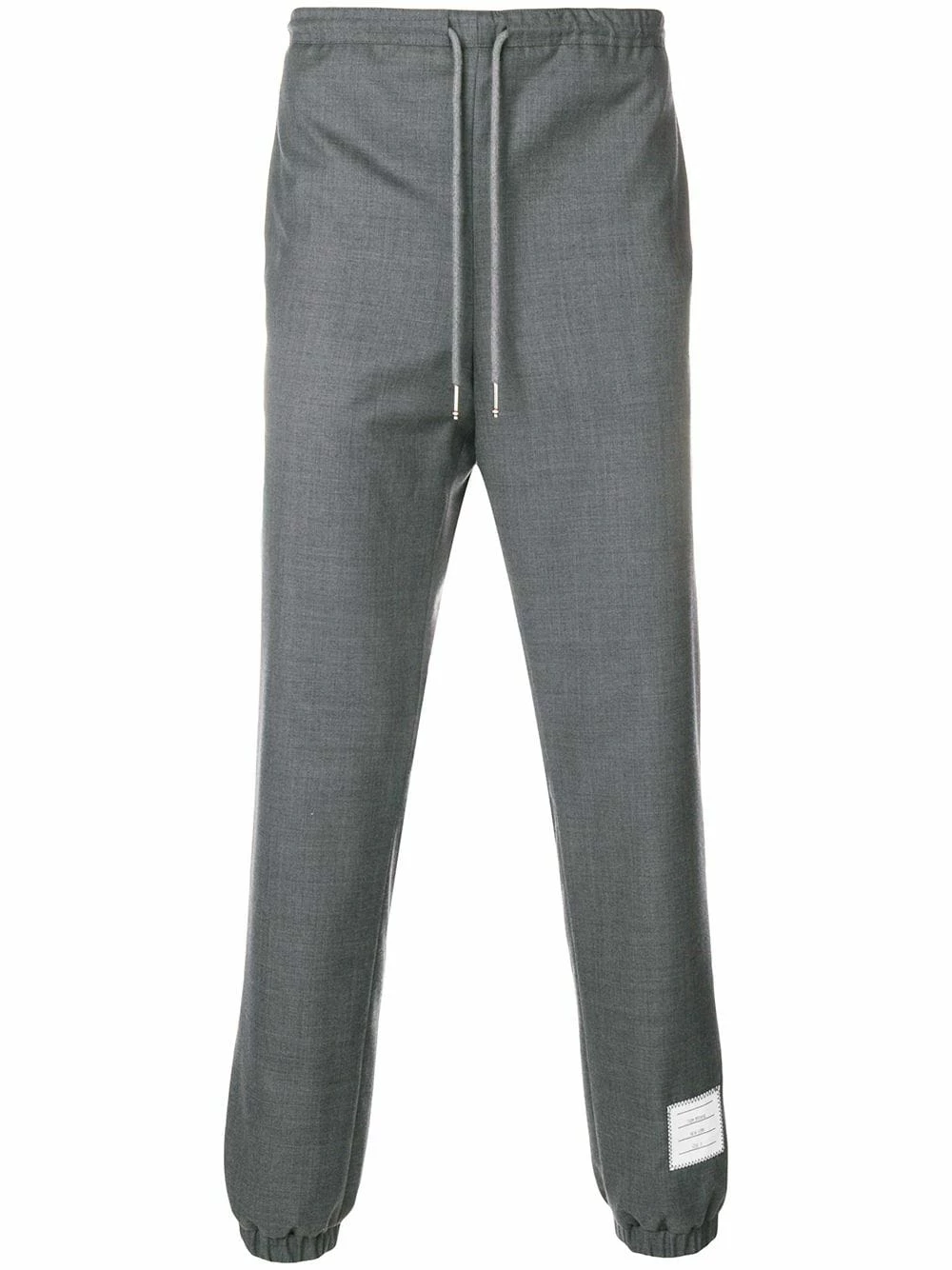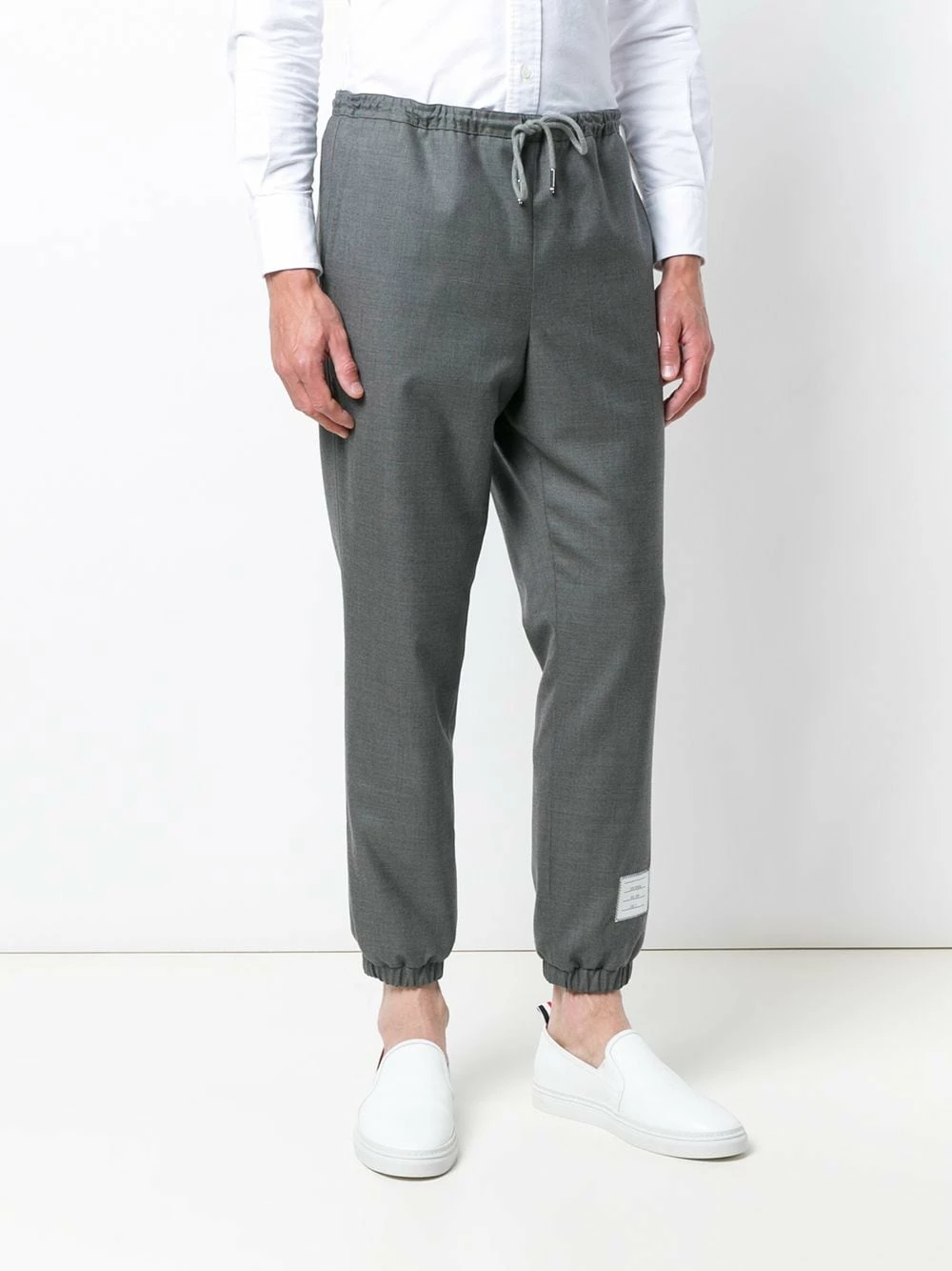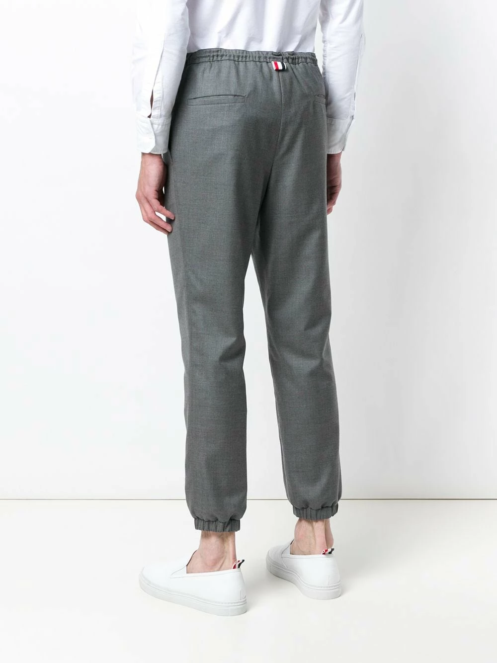 Grey wool Elastic Hem Wool Track Trouser from Thom Browne featuring an elasticated drawstring waist, a relaxed shape, a tapered leg, gathered ankles, side pockets, rear welt pockets, a front logo patch and a signature tri-colour striped trim.