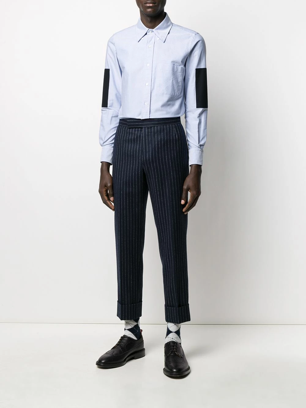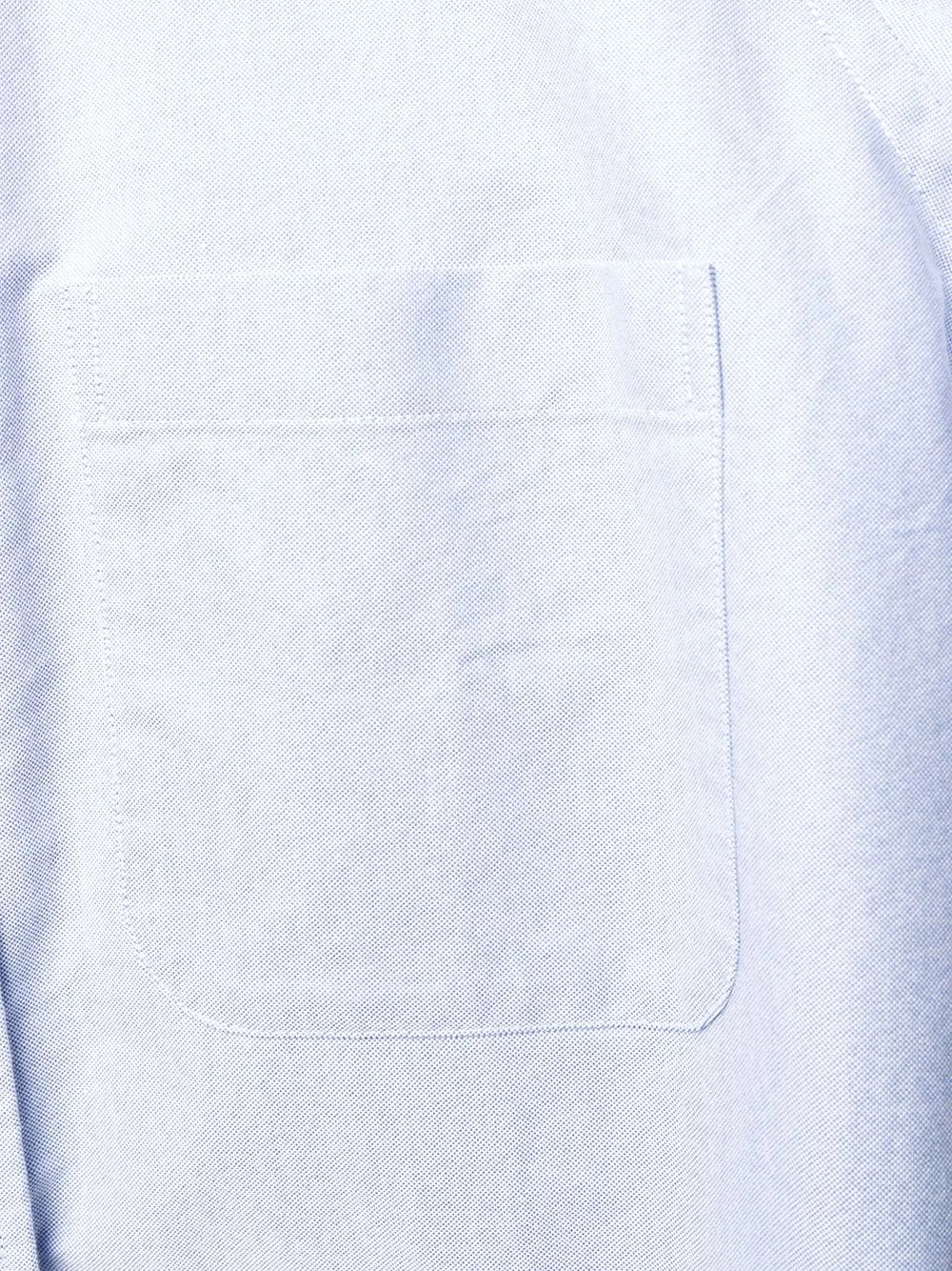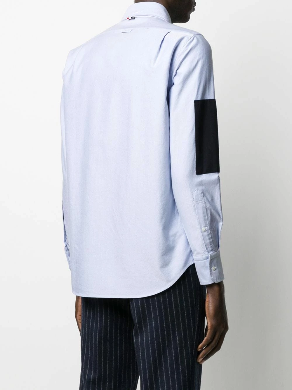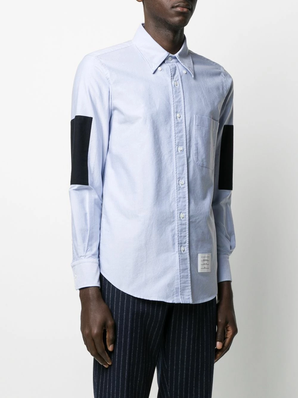 You can never have too many shirts. Which is exactly why this light blue elbow patch shirt from Thom Browne is one for the books. Collect them all. Featuring a pointed collar, a front button fastening, long sleeves and a curved hemline.