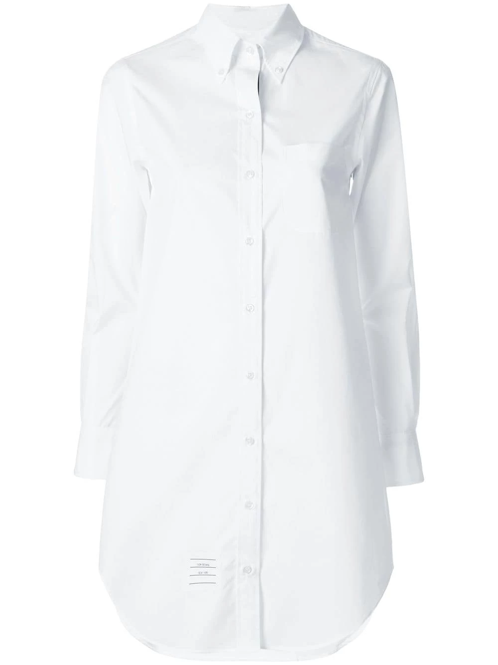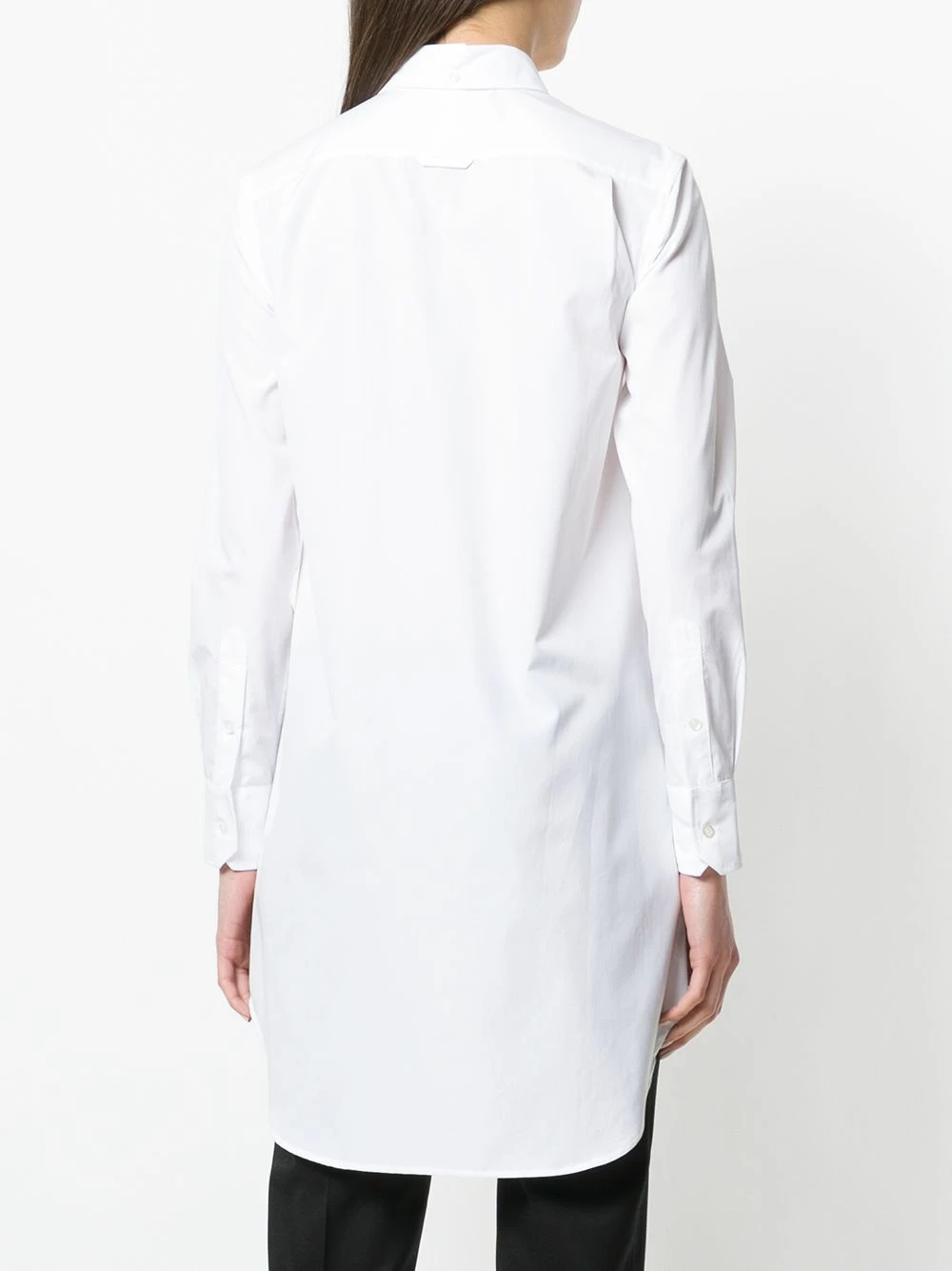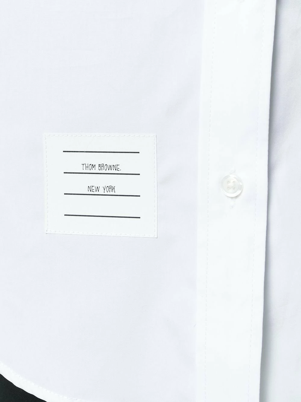 With a history in men’s formalwear, Thom Browne brings his tailoring expertise to the table when creating his women’s collection, focusing on premium materials and expertly cut shapes. Boasting the impeccable cut of timeless tailoring, this shirt comes in the precise length to be worn as a modern layered top or a fresh short dress. Fabricated from pure white cotton, the button-down model features a front button fastening, long sleeves with button cuffs, a chest pocket, a mid-length with a curved hemline, a front logo patch and a locker loop.