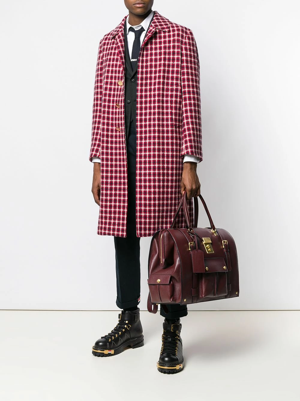 Exclusive Deerskin Mr. Thom Backpack from Thom Browne featuring round top handles, adjustable shoulder straps, a foldover top, a push lock fastening, a zip fastening, gold-tone hardware, buckle fastenings, a hanging leather tag, side pockets, an internal zipped pocket, an internal logo patch, a pebbled leather texture, a front snap pocket, a striped lining and a tricolour grosgrain tab.