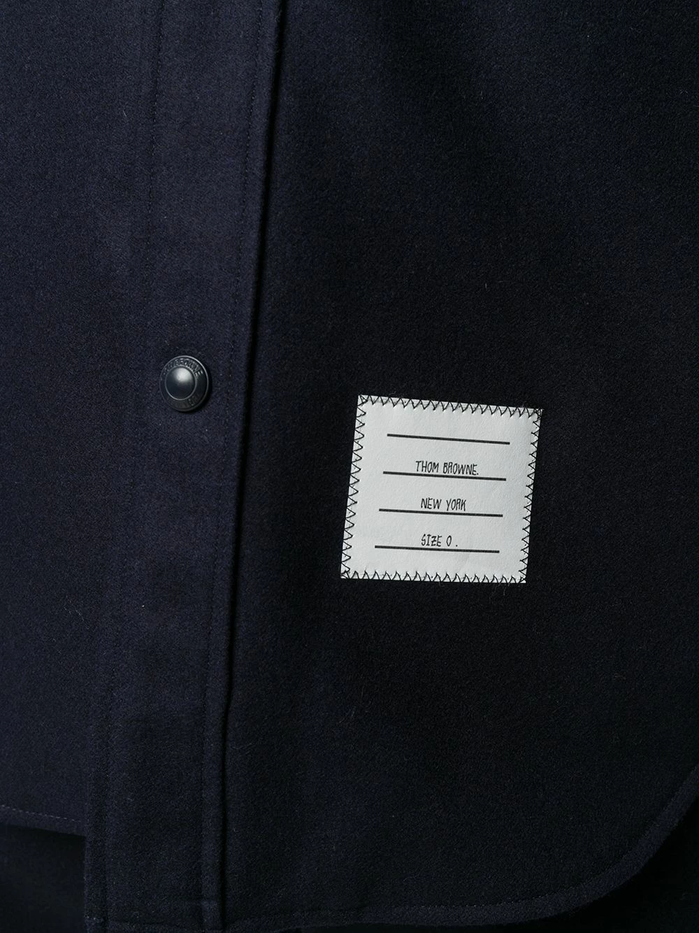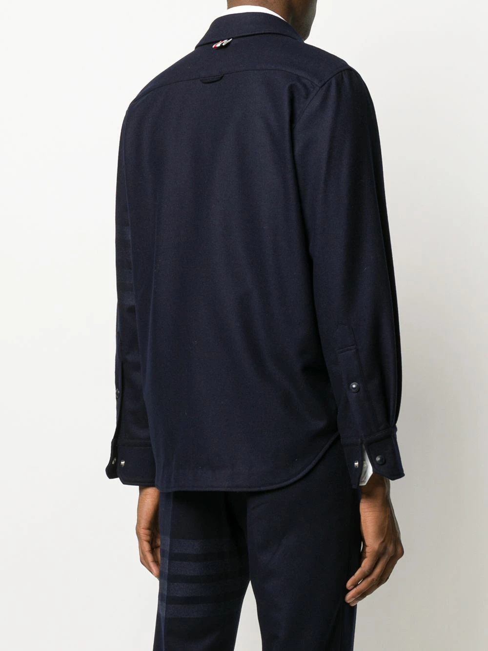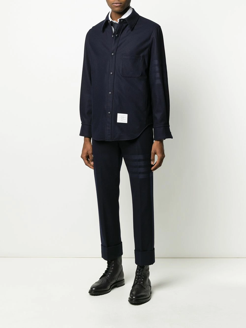 Meet the “crème de la crème” of what it means to be cool. Made from a navy blue wool-cashmere blend, this flannel tonal 4-Bar shirt jacket from Thom Browne is about to get you a ton of compliments. Brace yourself. Featuring a pointed collar, long sleeves, a chest pocket, a curved hemline, snap button cuffs, a front logo patch and a tricolour grosgrain tab on the rear.