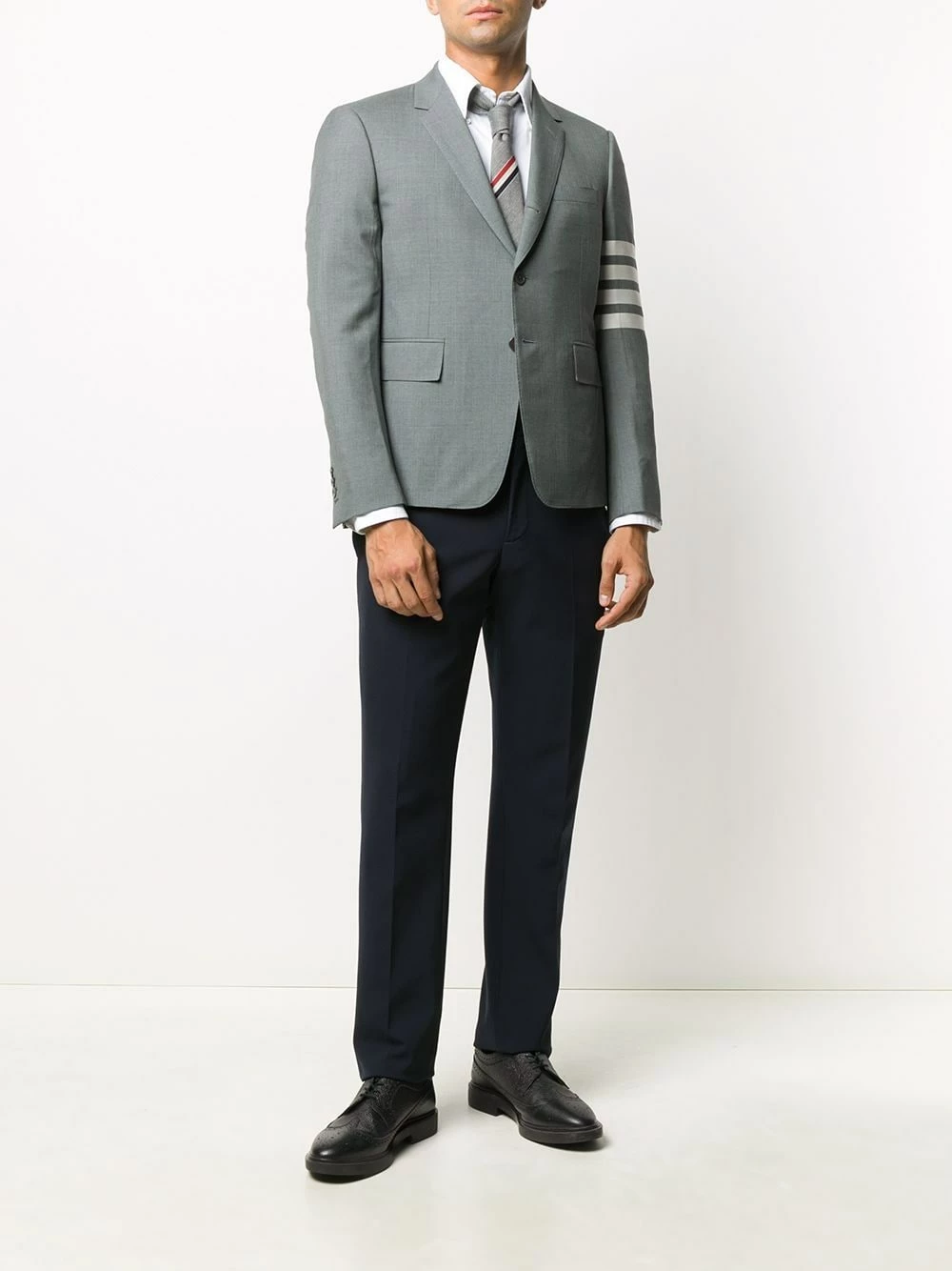 Medium grey wool Four-Bar fitted blazer from Thom Browne featuring notched lapels, front button fastening, chest welt pocket, two front flap pockets, buttoned cuffs, straight hem, slightly cropped long sleeves, double vent to the rear and tri-stripe printed lining.