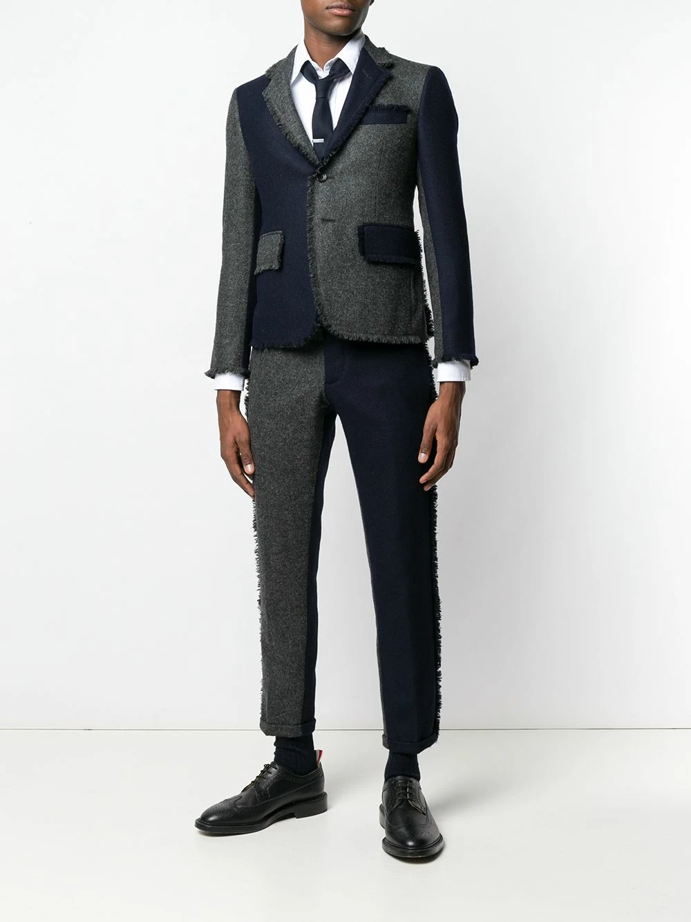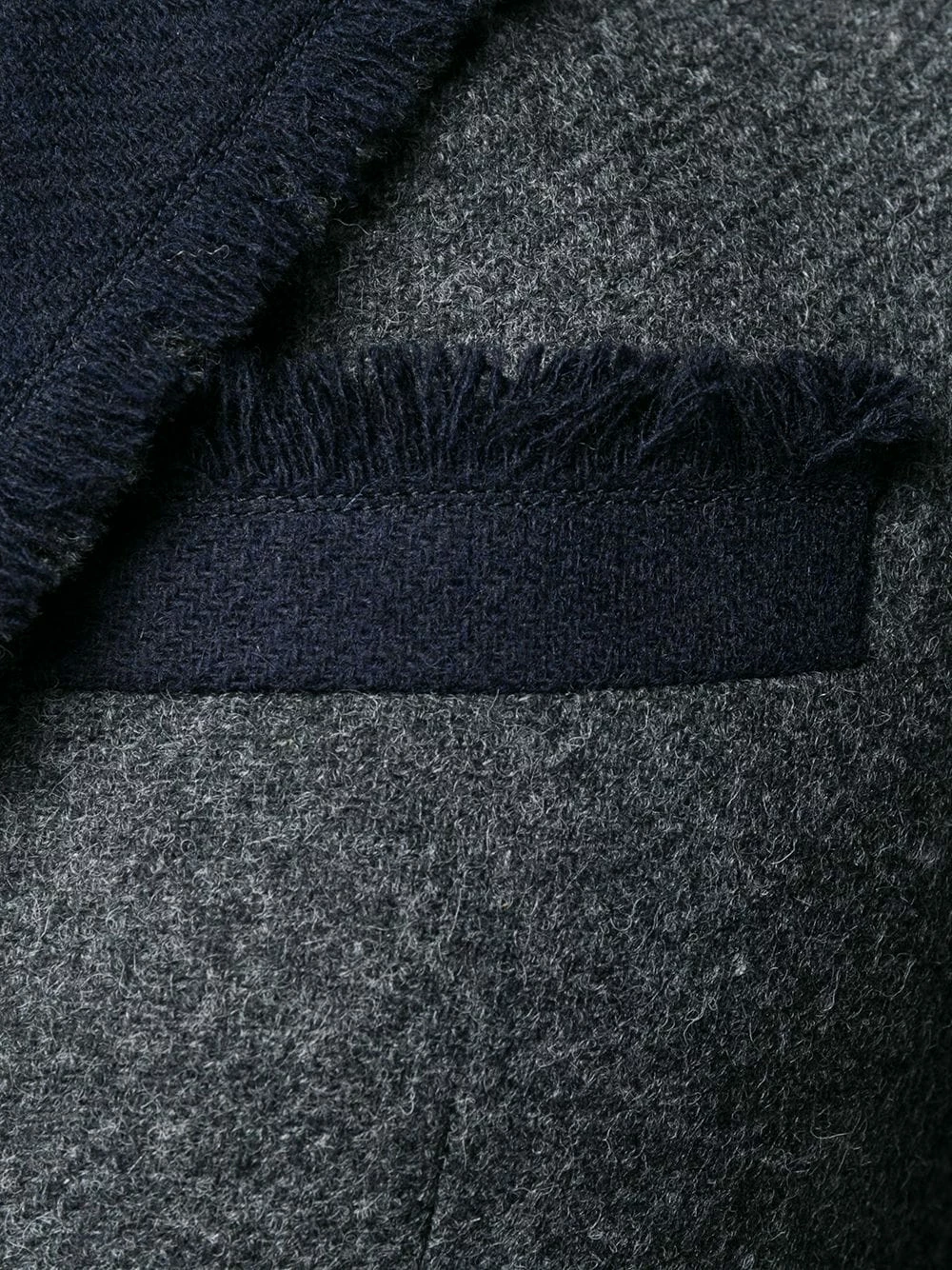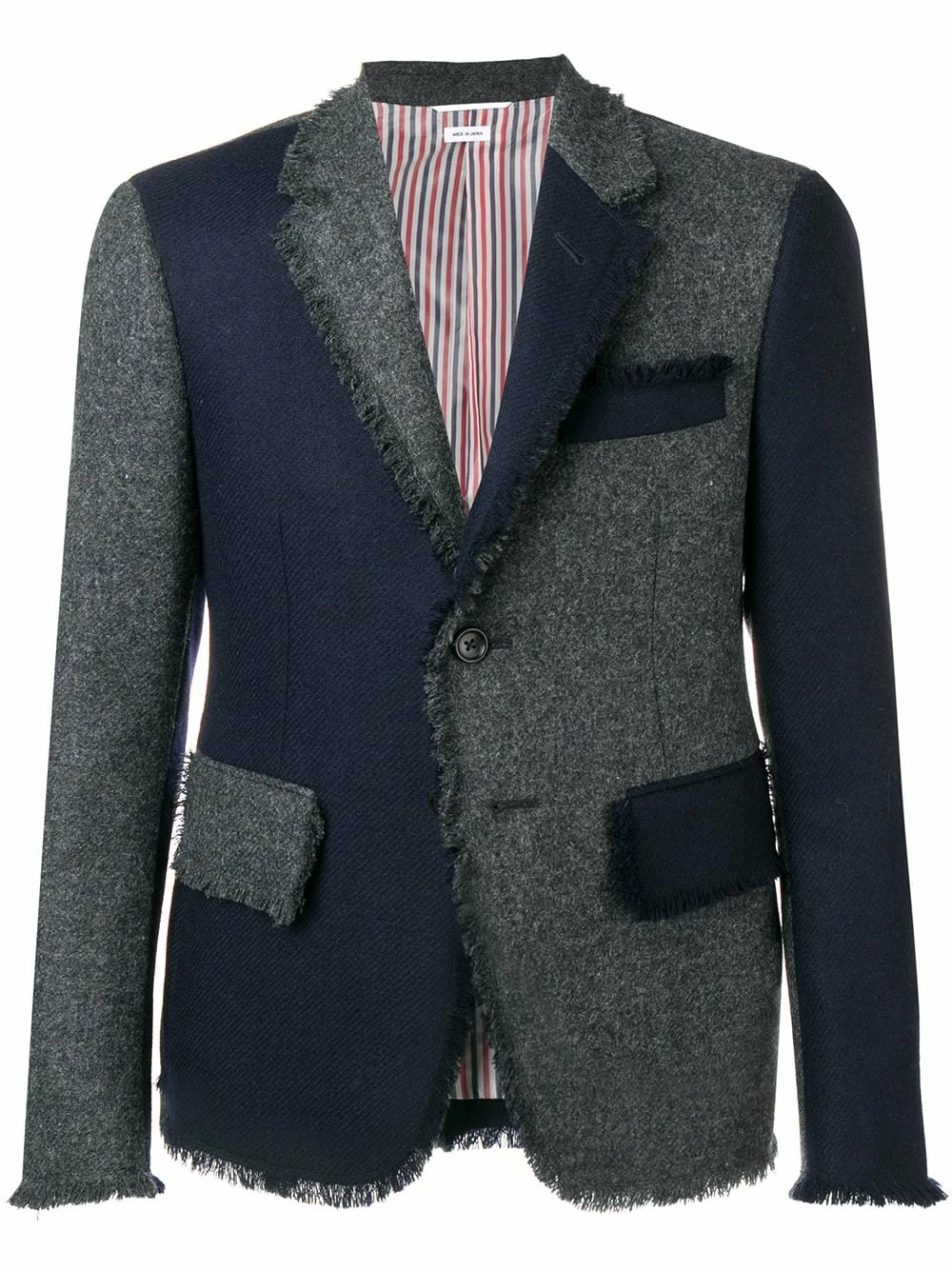 Thom Brown’s expertise in technical, tailored and luxuriously fabricated outerwear is clearly evident in this Italian-crafted sport coat from the designer’s Autumn/Winter 2019 edit. Cut from navy blue and grey wool with a panelled colour block design for a playful touch, this slim sport coat design is a practical and stylish solution. Featuring a classic collar, a front button fastening, a broad welt chest pocket, front flap pockets, a double vent to the rear, a panelled colour block design and frayed edges.