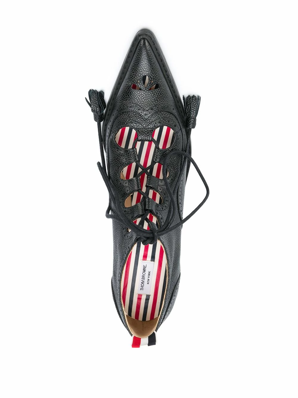 Brogue… but make it fashion. The Ghillie pumps from Thom Browne add an exciting twist to your traditional brogue silhouette by sitting on a curved high heel and boasting a lace-up front fastening. One of a kind.