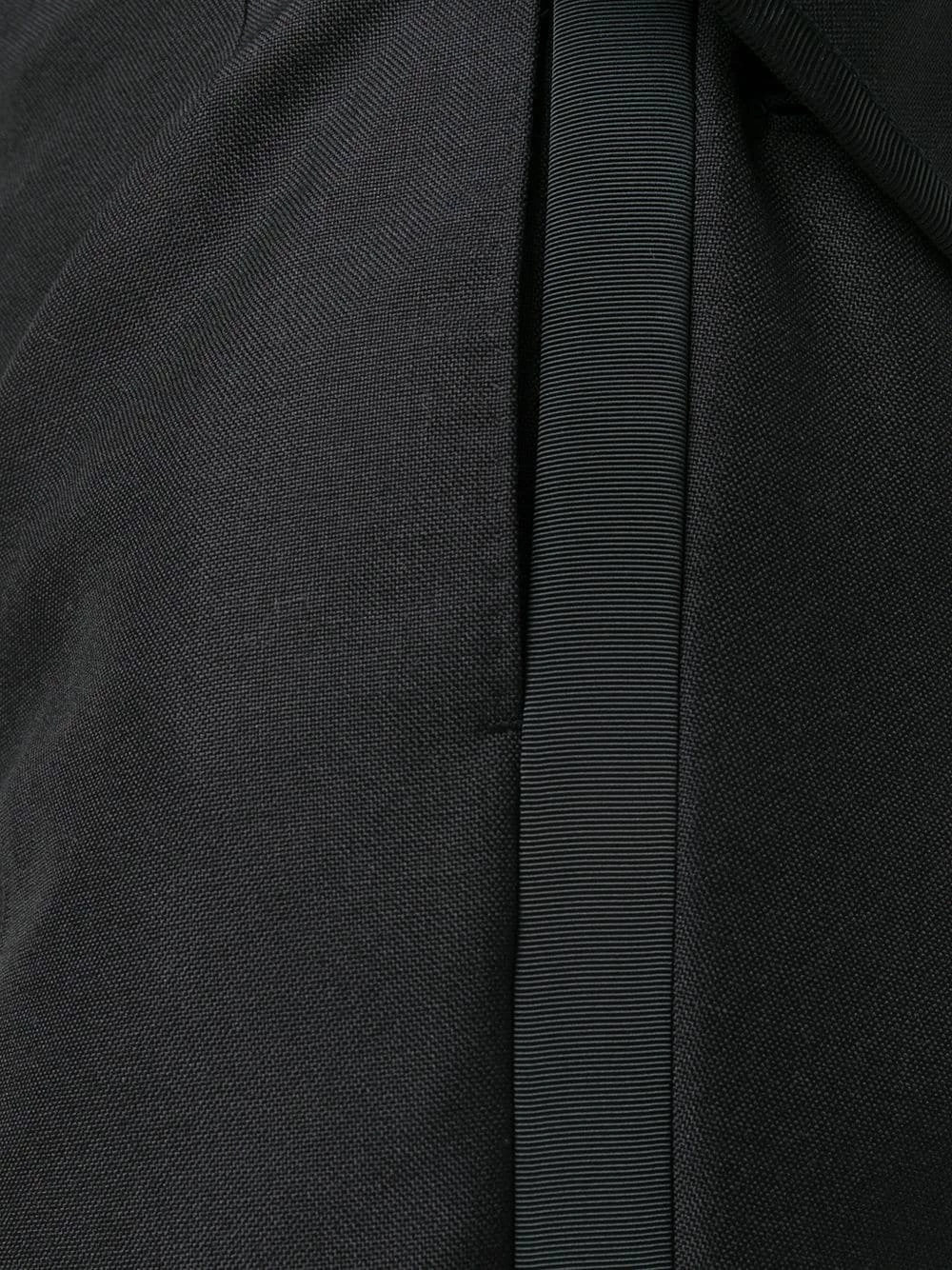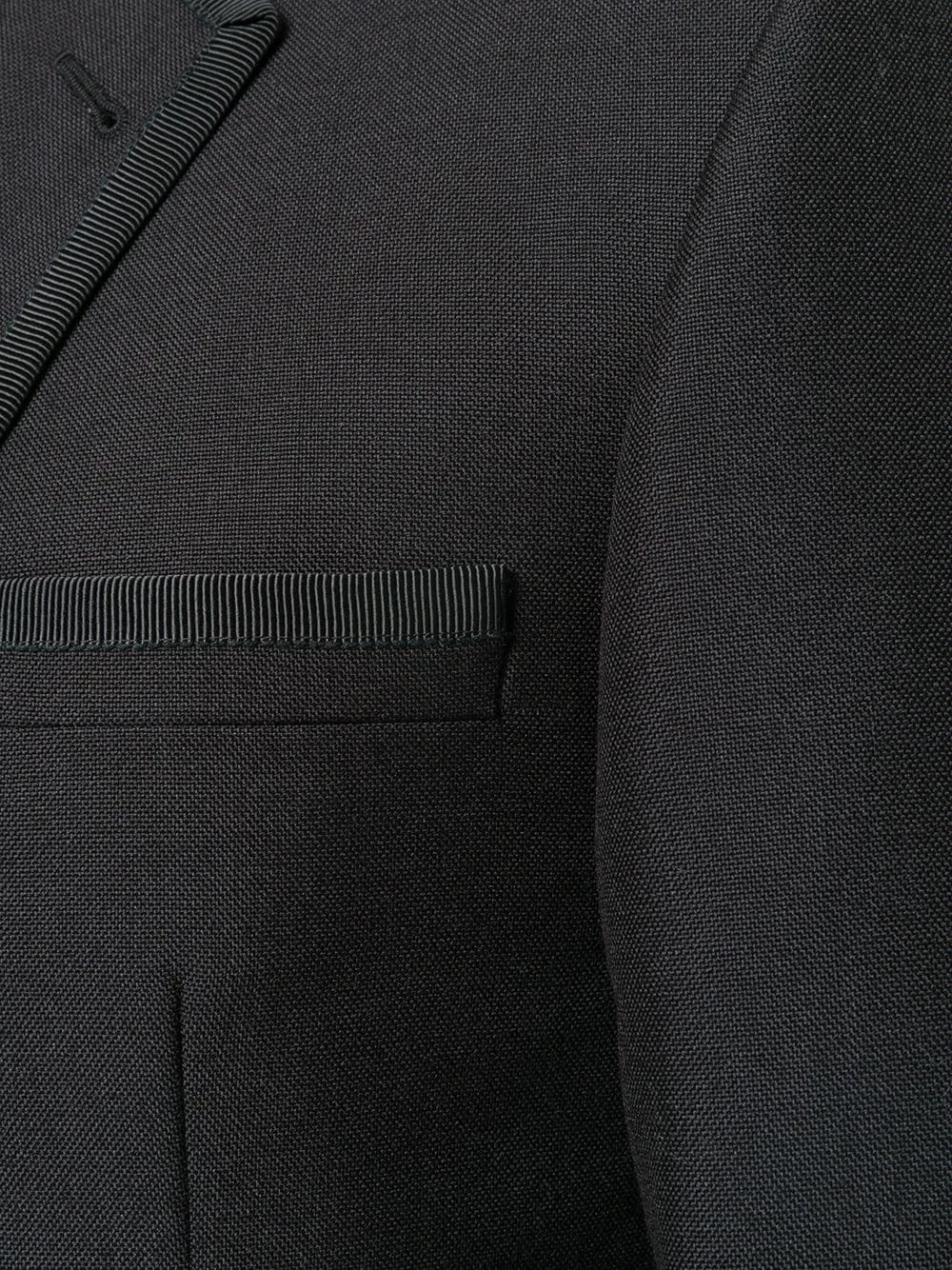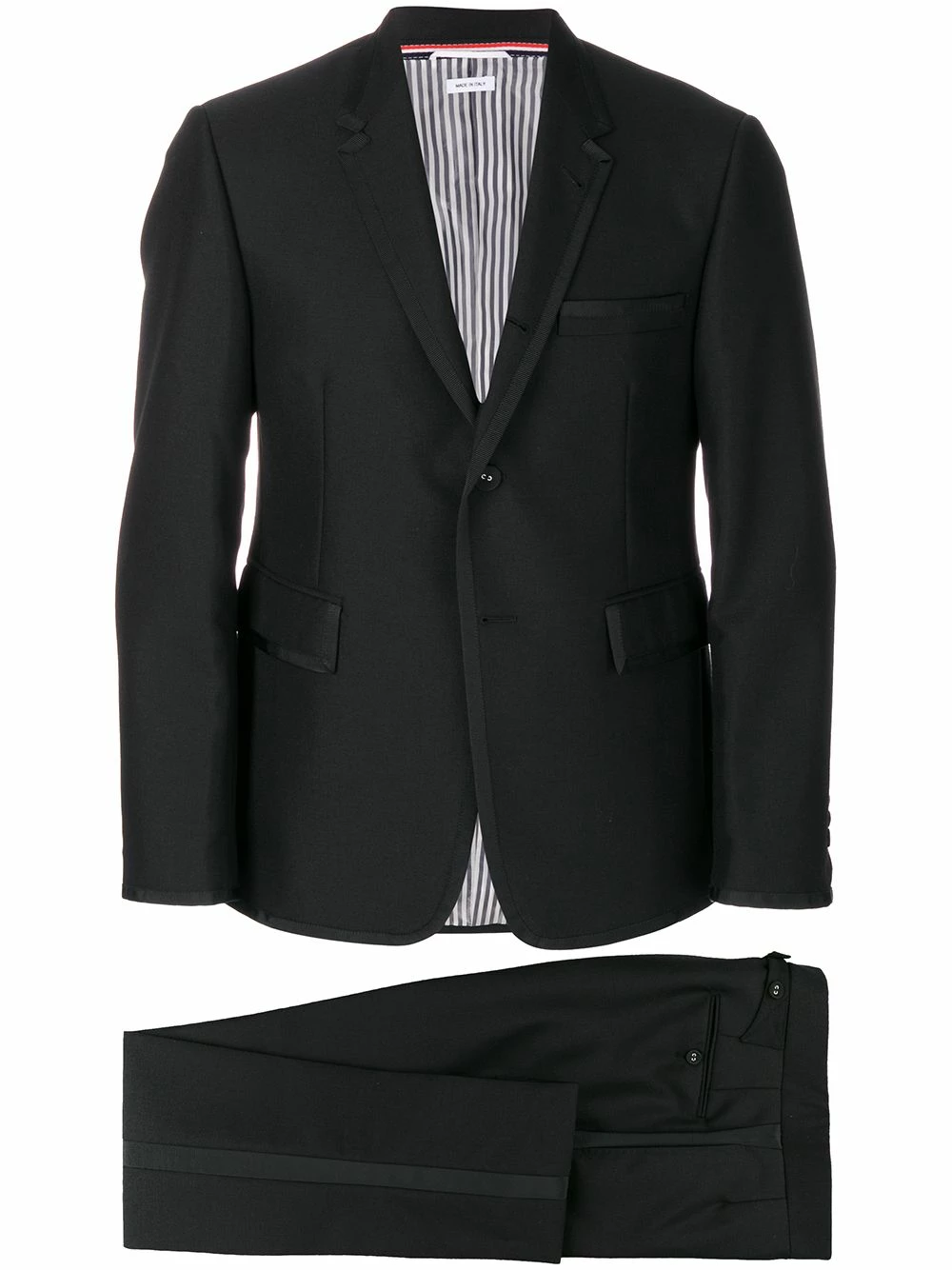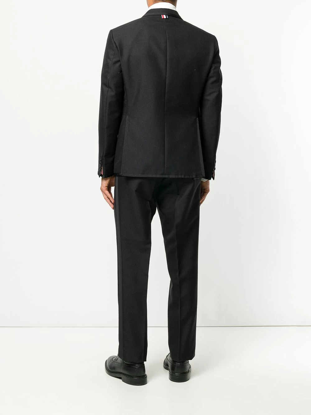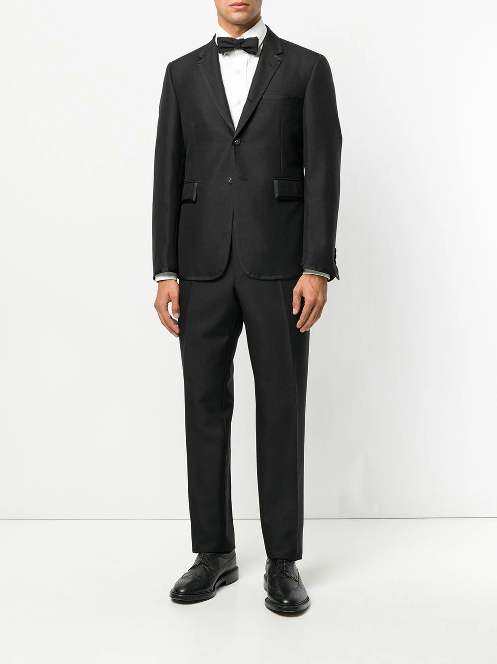 Black wool-mohair blend Grosgrain Tipping Tuxedo With Bow Tie from Thom Browne featuring notched lapels, a front button fastening, long sleeves, front flap pockets, a broad welt chest pocket, a double vent to the rear, a waistband, a hook and zip fly, back buttoned welt pocket, button cuffs with an internal white, red and blue grosgrain strap, a signature grosgrain tab, an adjustable buttoned strap at the back of the waist and a cord piping detailing.