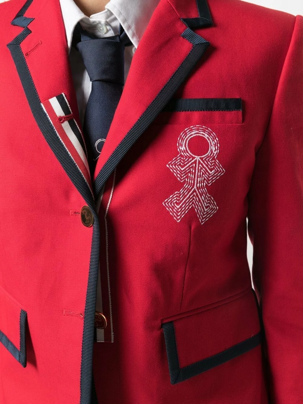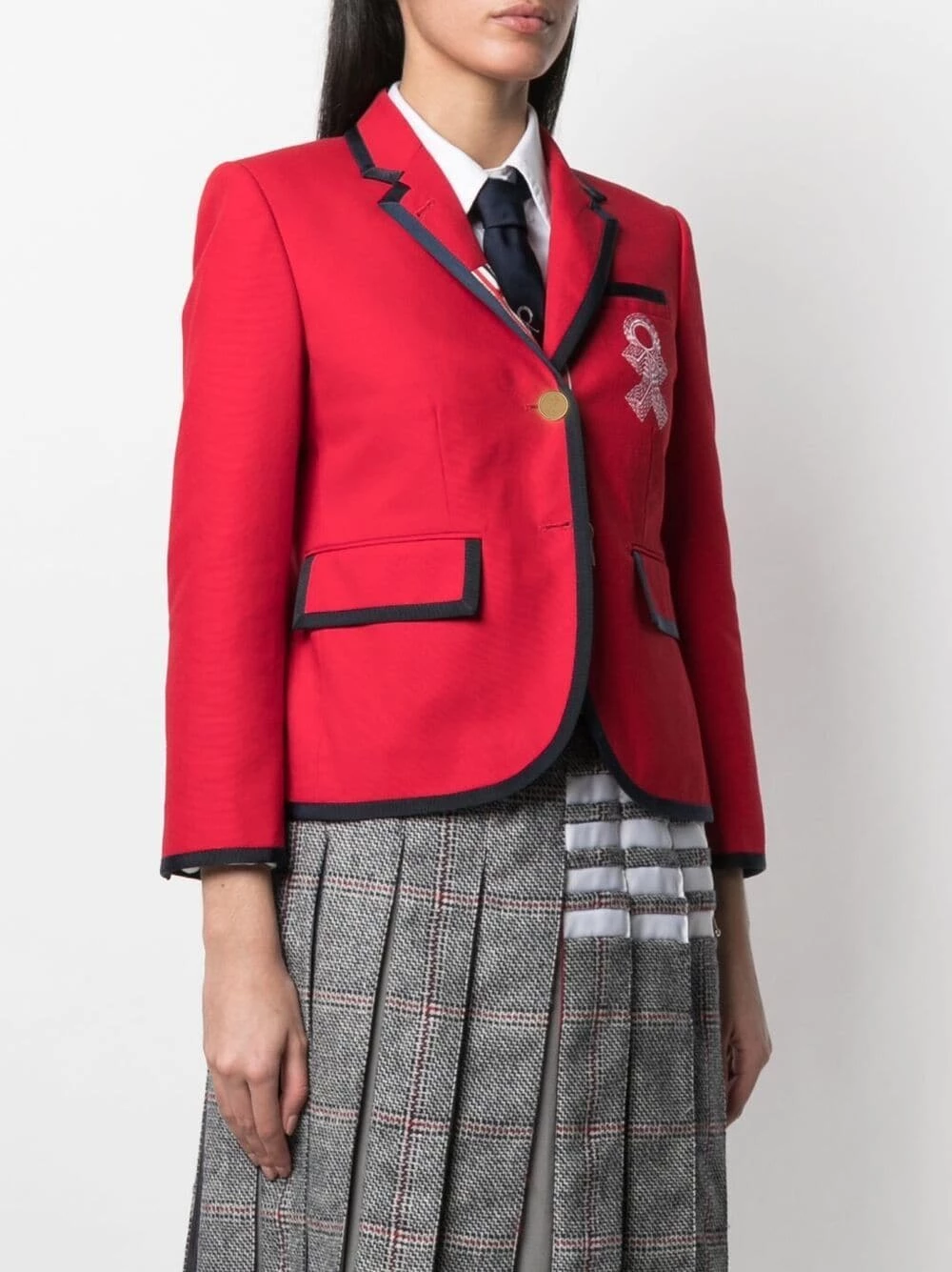 Thom Browne class is in session. Serve preppy refined charm with this grosgrain trim blazer jacket that’s designed with a short length and cropped sleeves that will certainly gain you some stylish marks. You’ll pass the year with flying colours (which of course is red, white and blue).