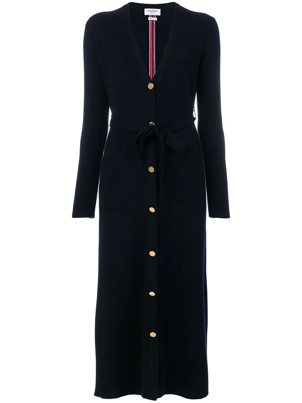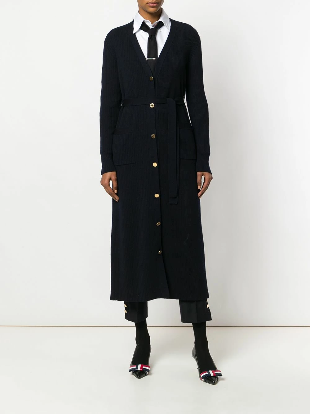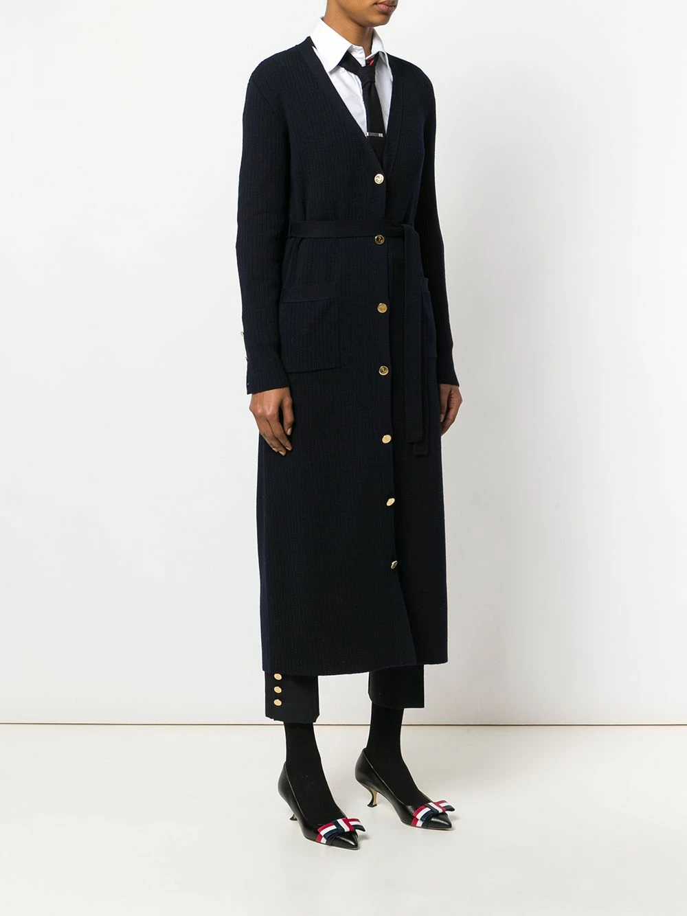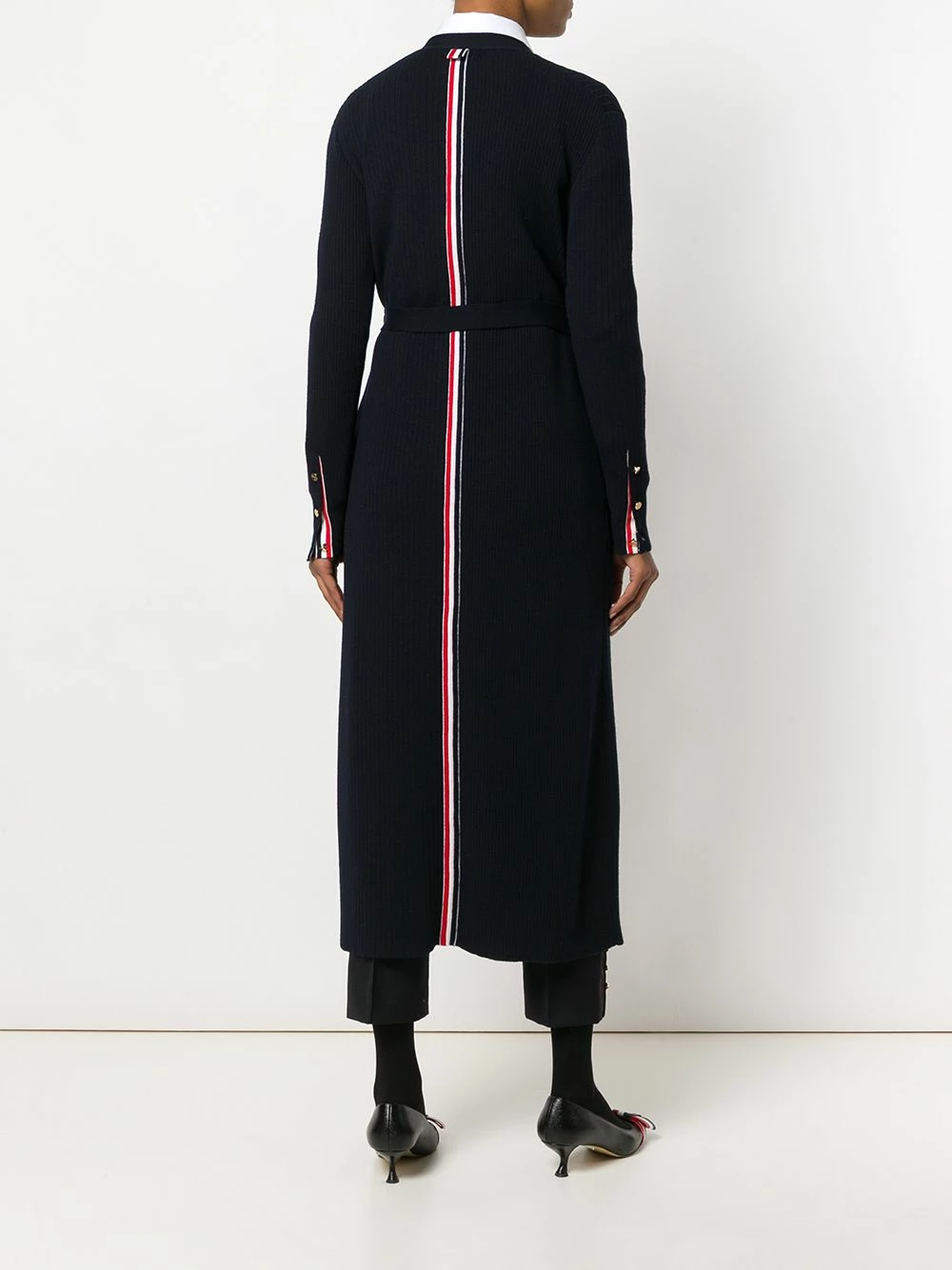 Navy Half-and-half Rib Knit Striped Long Cardigan from Thom Browne featuring a v-neck, a front button fastening, long sleeves, button cuffs, a belted waist, two front pockets, a mid-length, a straight hem, a ribbed design, a grosgrain band, a signature tri-colour striped trim, anchor embossed gold-tone buttons and a red, white and navy blue stripe appliqué to the back.