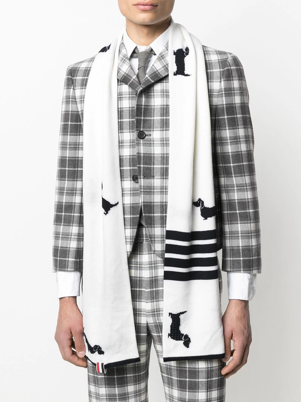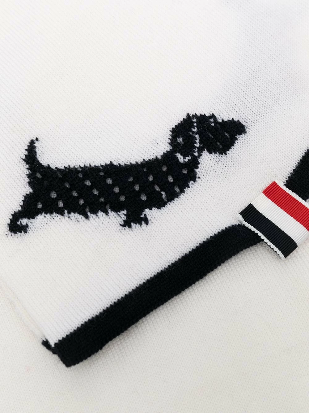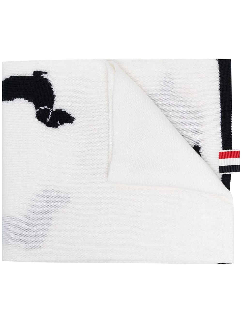 Hector is a key figure in Thom Browne designs, appearing throughout the brand’s collections. He makes a sweet appearance on this scarf, in an intarsia-knit pattern.