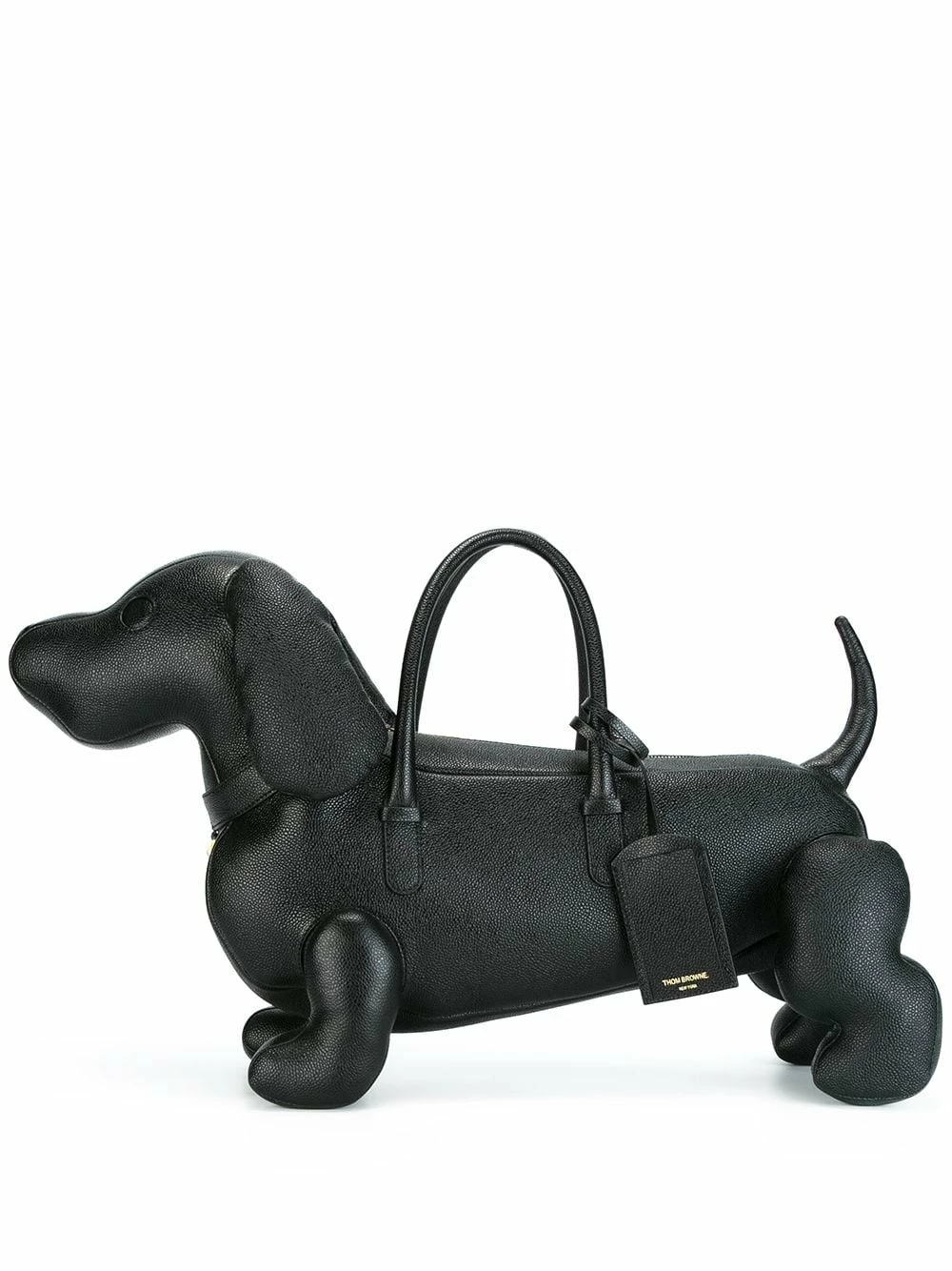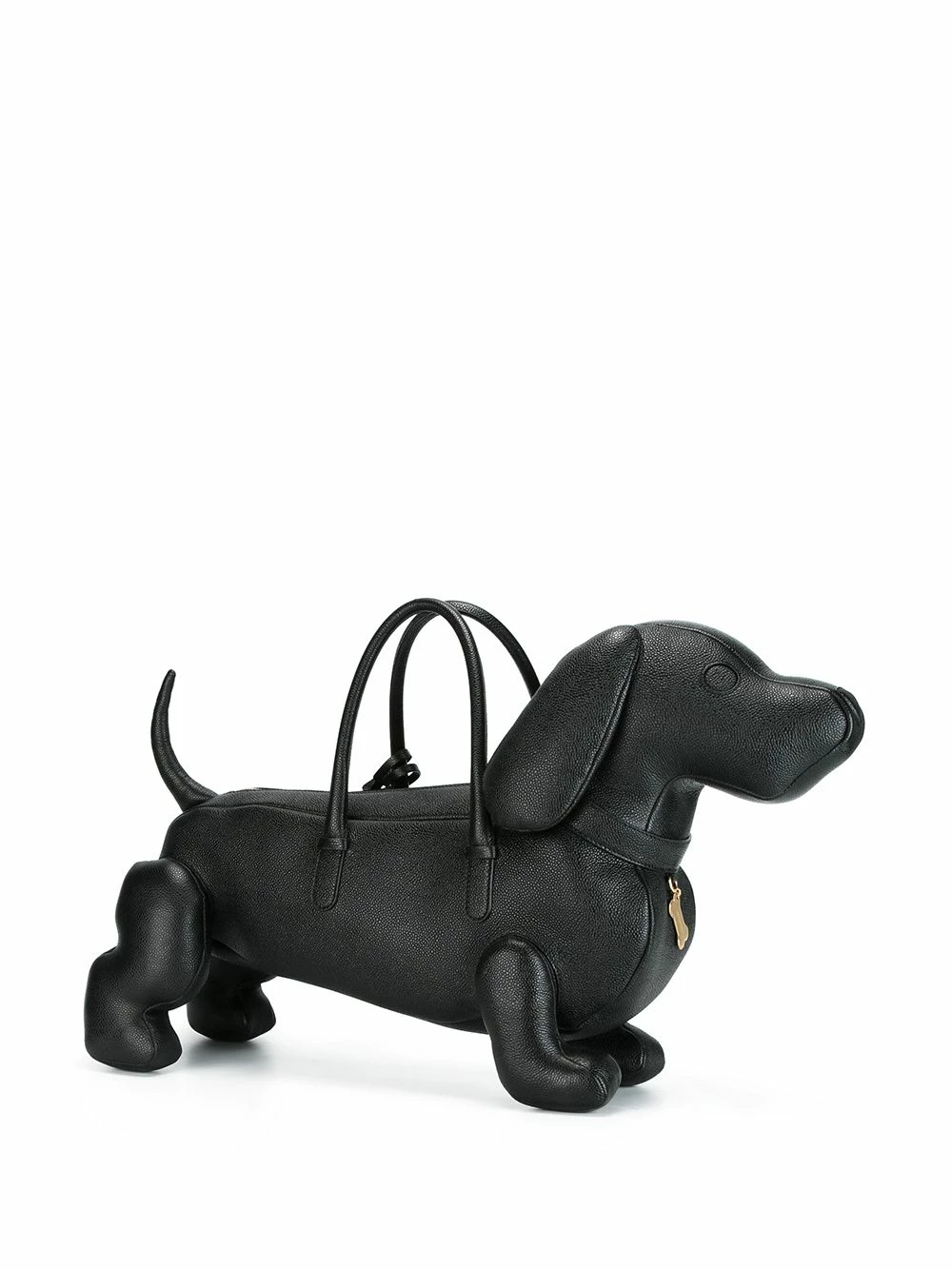 Always wanted a dog but your rush life wouldn’t never let you? Well, get closer to that dream with this black pebbled leather Hector bag from Thom Browne. You can start practising by going with it from one place to another. This is your new best friend! Featuring round top handles, a top zip fastening, a main internal compartment, an internal zipped pocket, an internal logo patch, a hanging luggage tag, gold-tone hardware, a printed lining, a red, white and blue grosgrain tab, a signature striped zipper tab and a logo embossed metal bone.