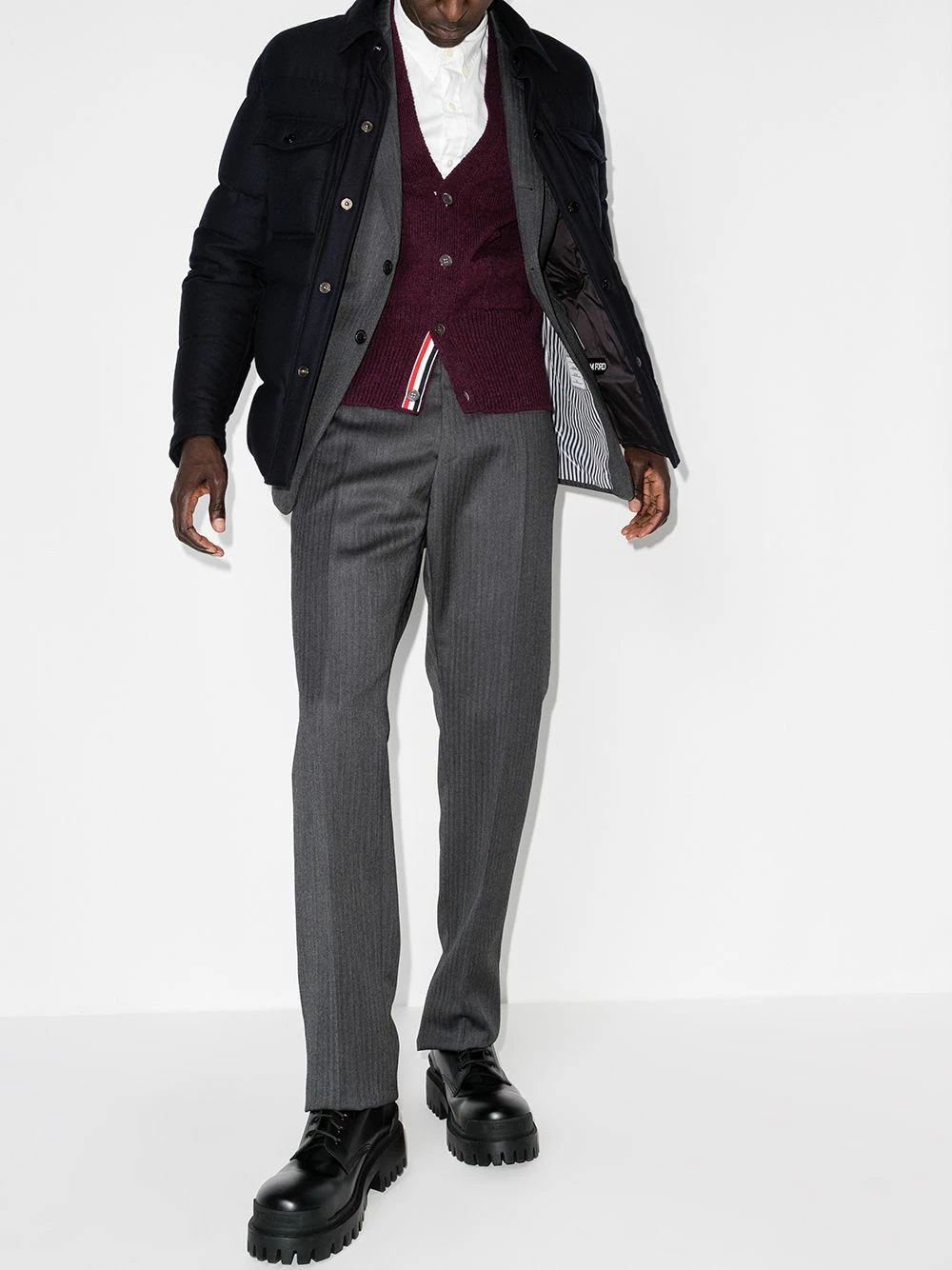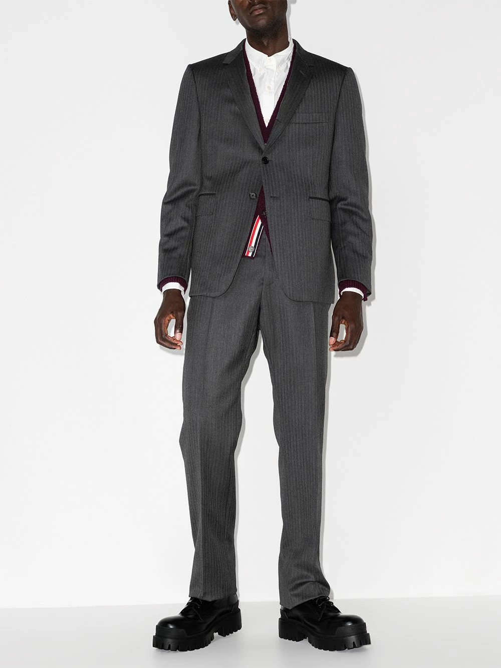 This two-piece suit showcases Thom Browne penchant for impeccable tailoring and attention to detail. The designer combines a classic herringbone pattern with contemporary details to create a formalwear hallmark that is finished with a signature grosgrain loop tab at the back.