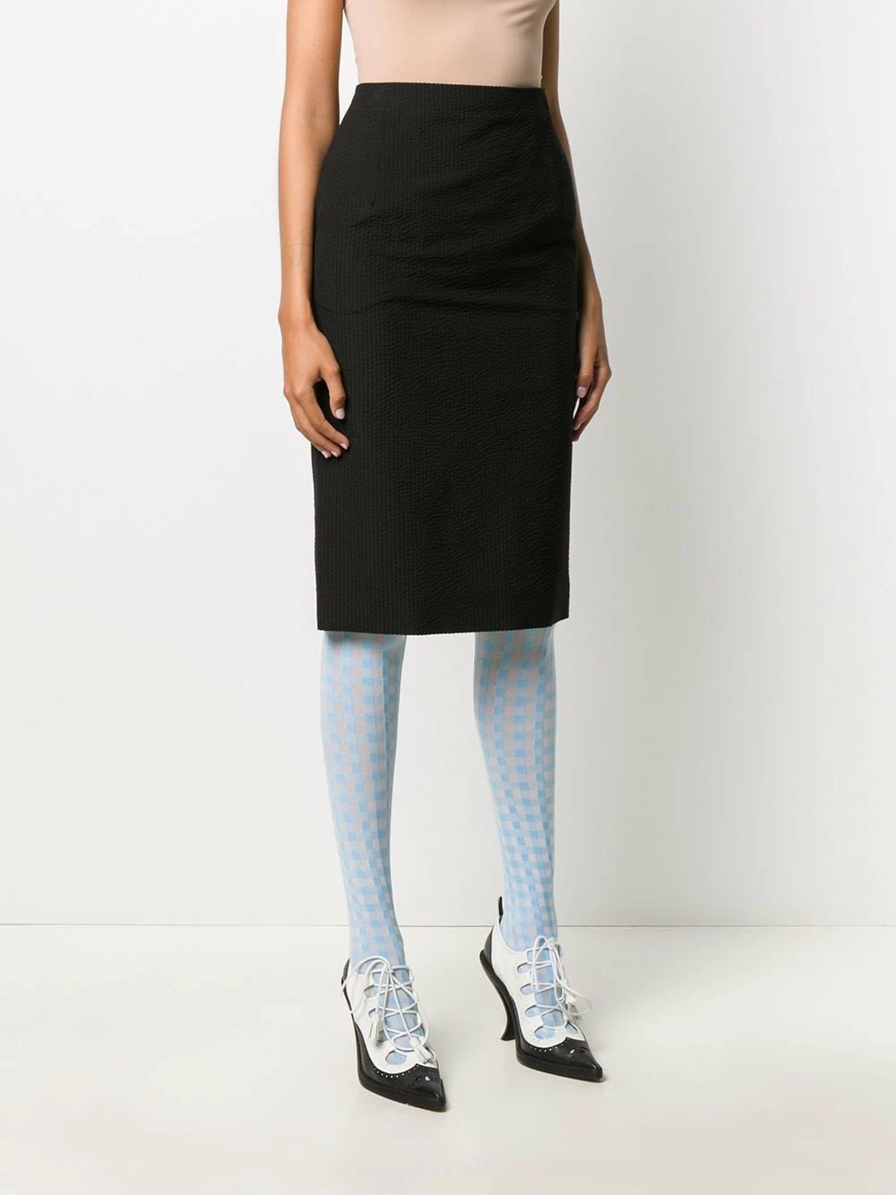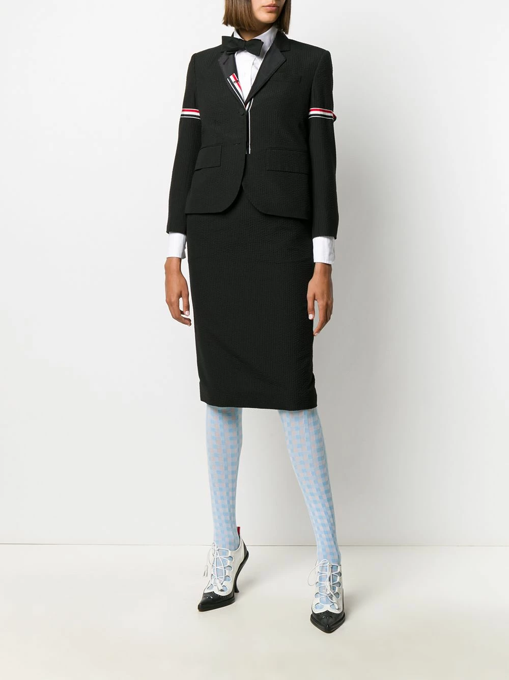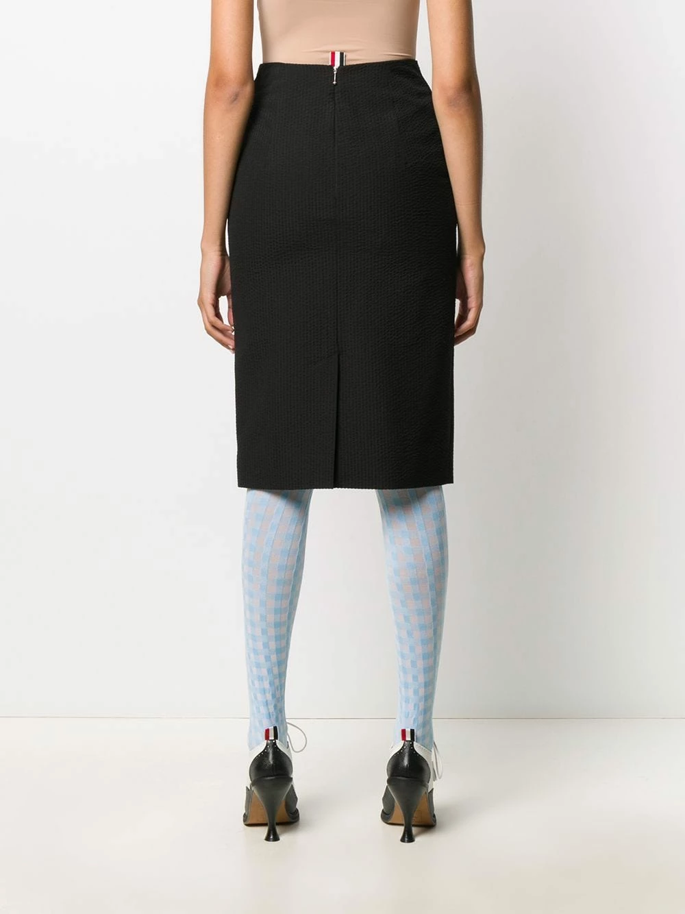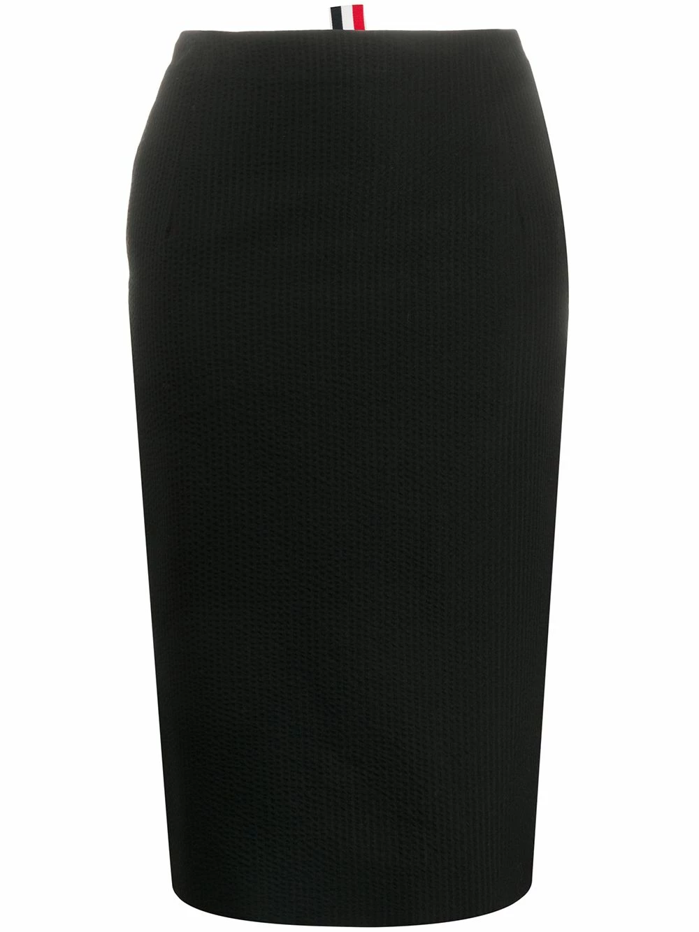 You’re top of the class when it comes to smart style. Go up a grade, wearing this tonal design pencil skirt, with Thom Browne’s signature grosgrain loop tab to the rear. Full marks.